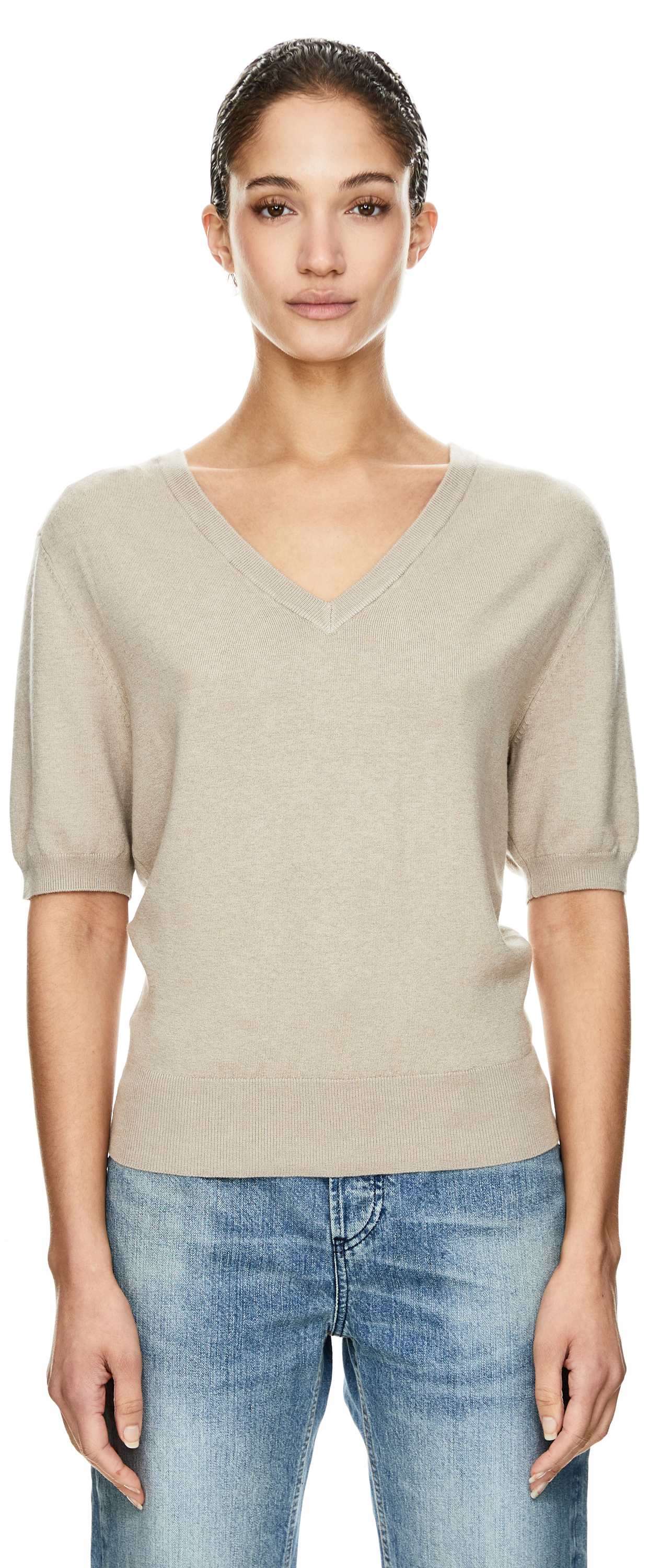 Dieser Pullover in Summer Taupe von UNGER Collection wurde aus einer hochwertigen Seiden-Cashmere-Mischung gefertigt und besticht durch seine besonders weiche Haptik. Die kurzen Ärmel, die überschnittenen Schultern sowie das wärmende Material machen dieses Modell zu einem modischen Highlight. Der Pullover ist wendbar und in erster Linie dafür gedacht, mit dem V-Ausschnitt am Rücken getragen zu werden – für einen modernen, eleganten Look. Alternativ kann der V-Ausschnitt auch nach vorne getragen werden und verleiht dem Style eine klassische Note.