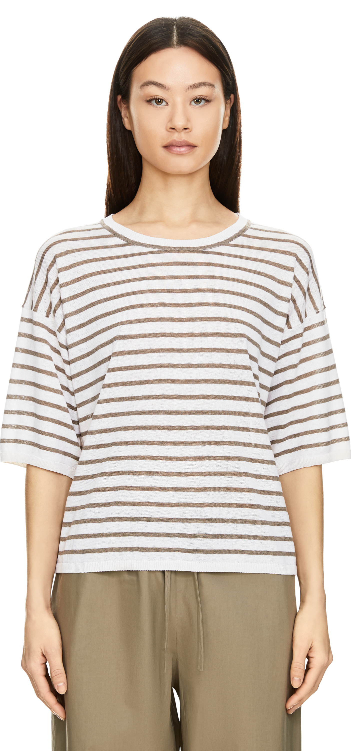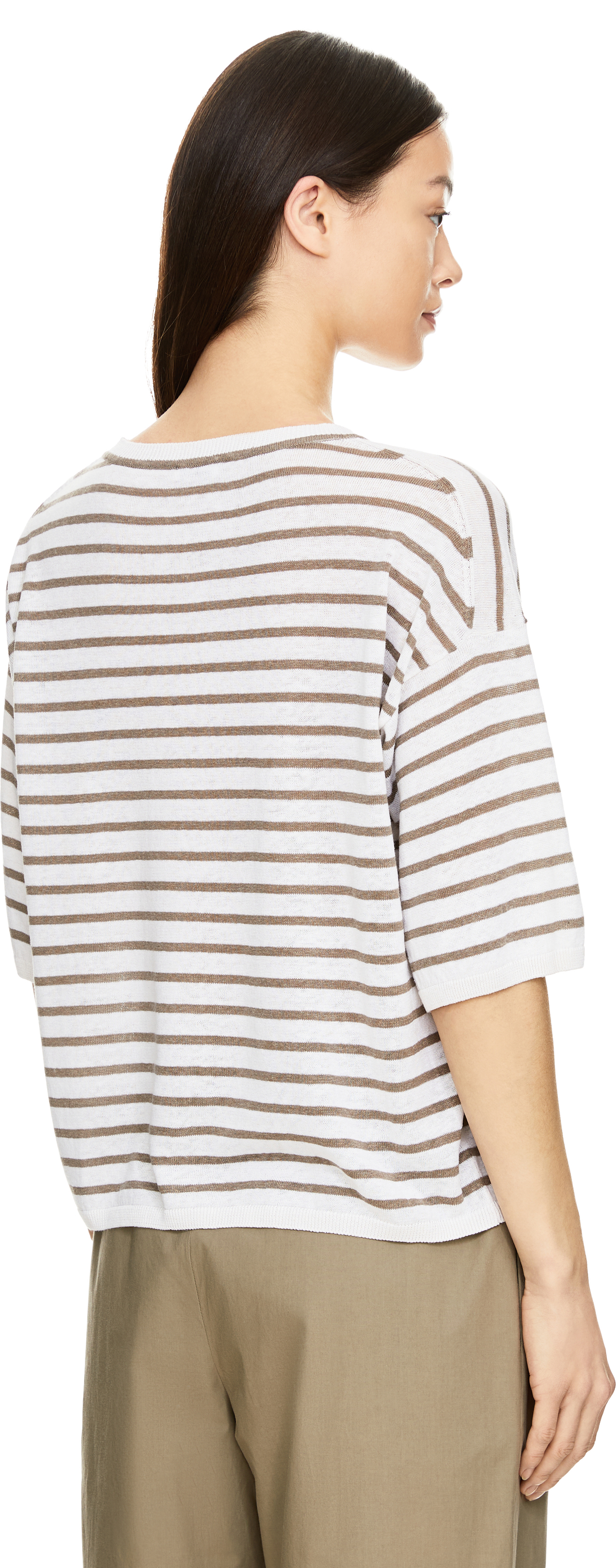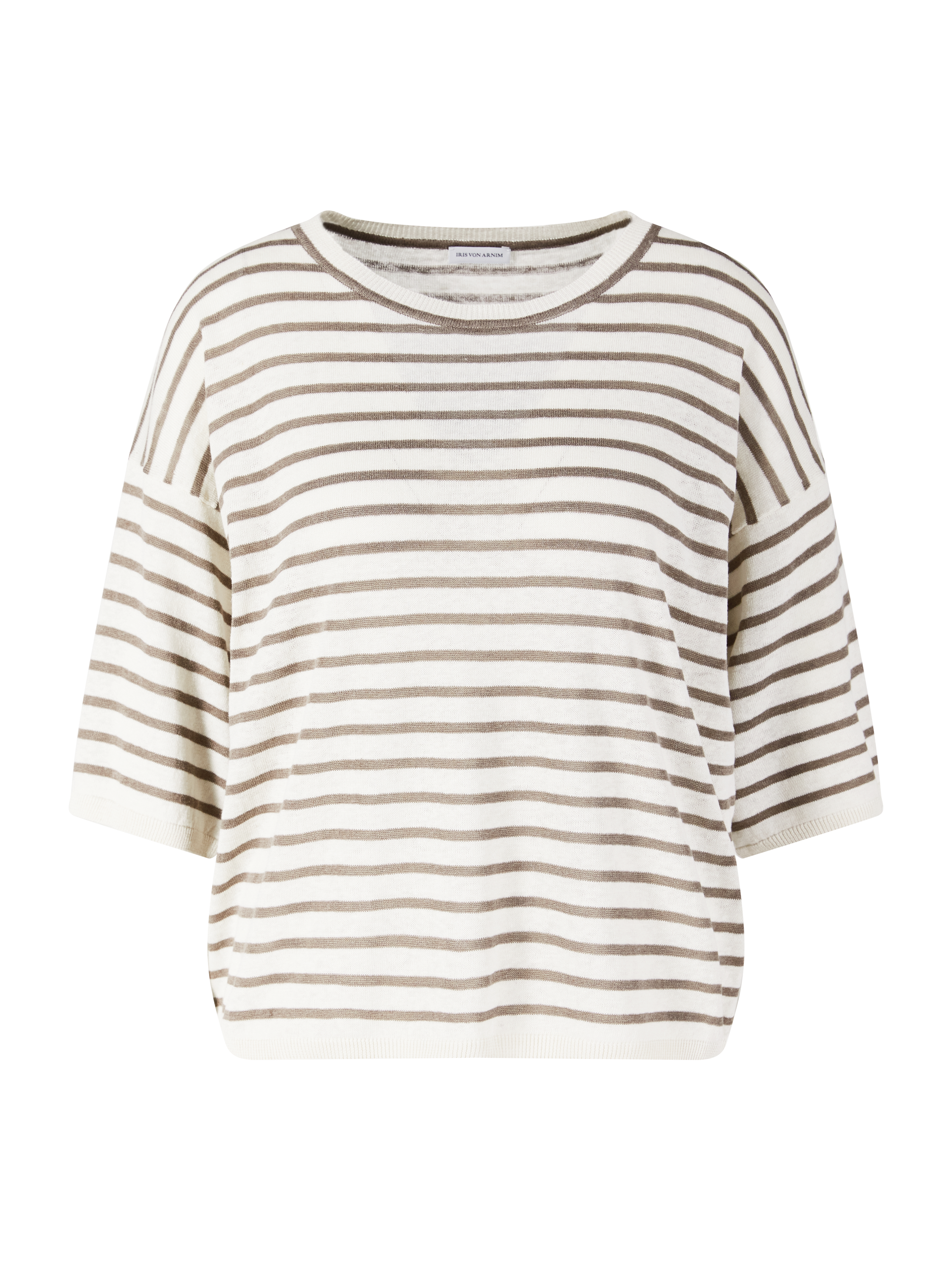Der Pullover 'Emina' in Off White/Taupe von Iris von Arnim wurde aus einer hochwertigen Seiden-Leinenmischung gefertigt und besticht durch die zeitlose Eleganz. Die gerade Passform, der Rundhalsausschnitt und der feine Rippstrick machen das Modell zu einem besonderen Klassiker.