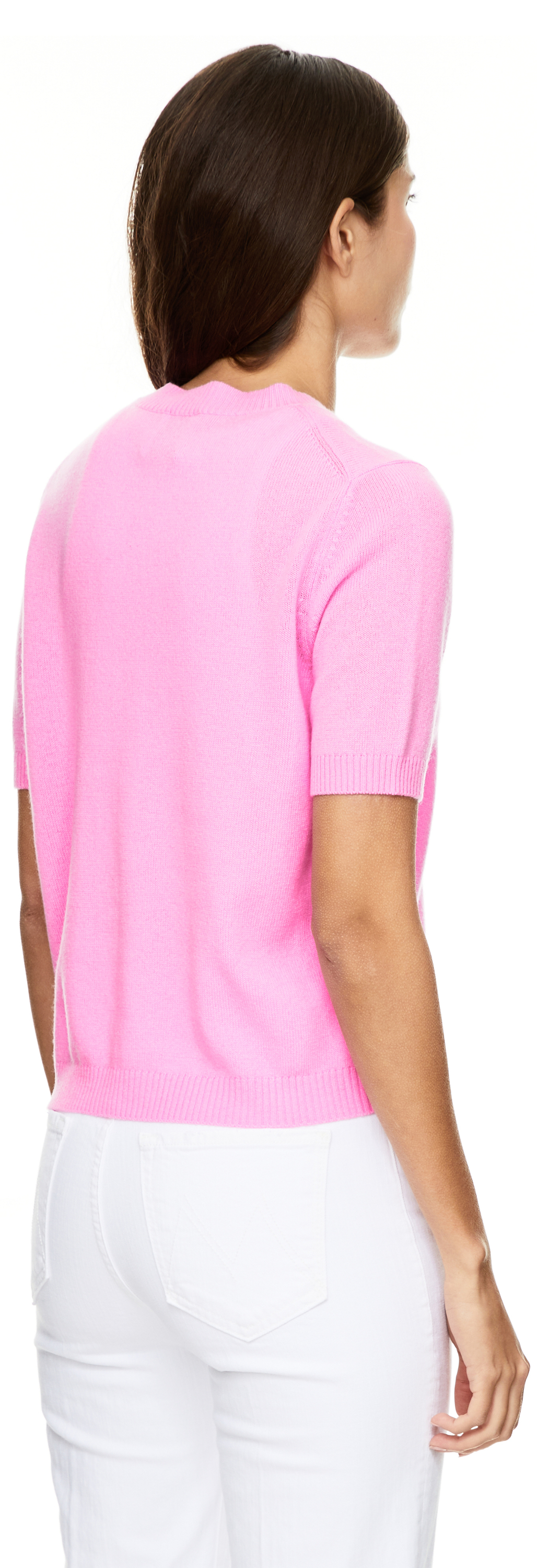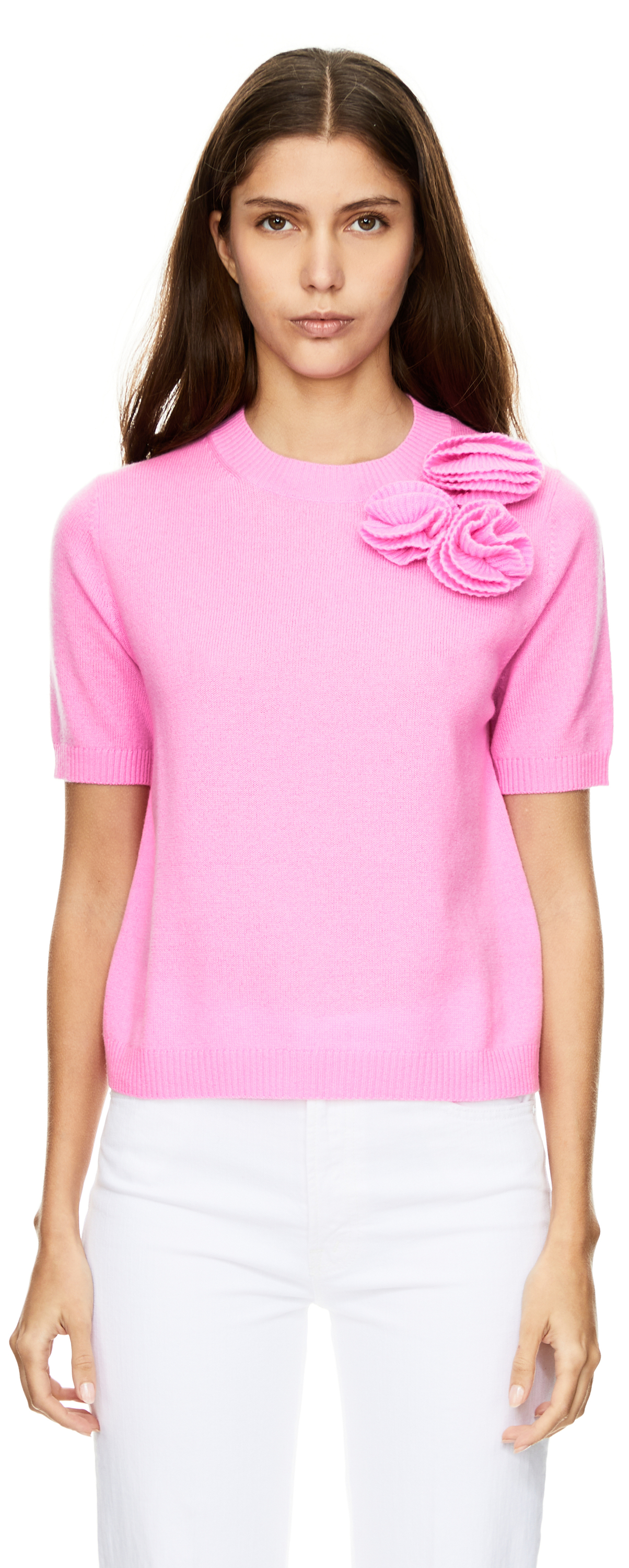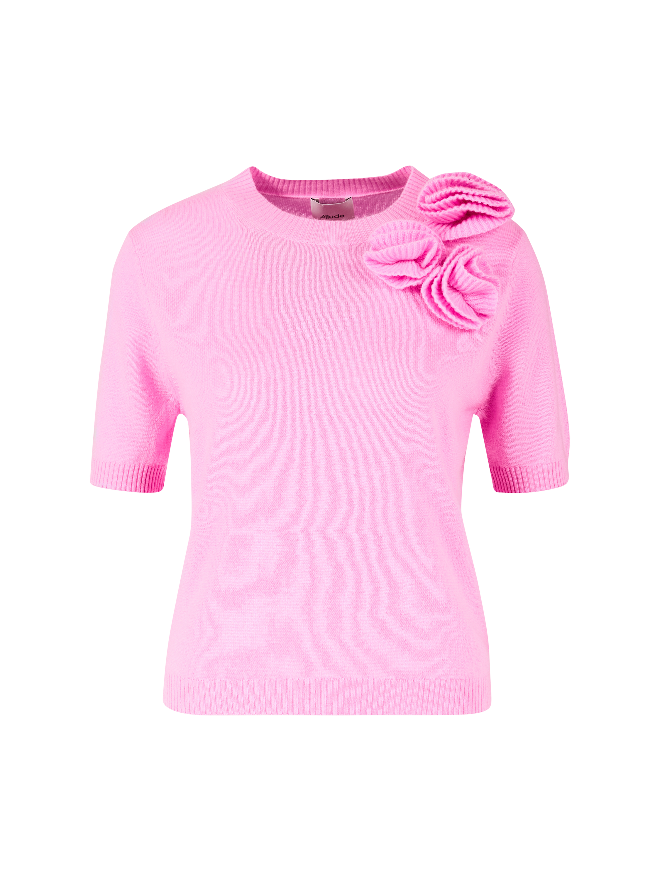 Dieser Pullover in Pink von Allude wurde aus einer Woll-Cashmere-Mischung gefertigt und besticht durch das Blumen-Detail. Der Rundhalsausschnitt, die kurzen Ärmel und der Rippstrick am Saum vollenden diesen Klassiker.