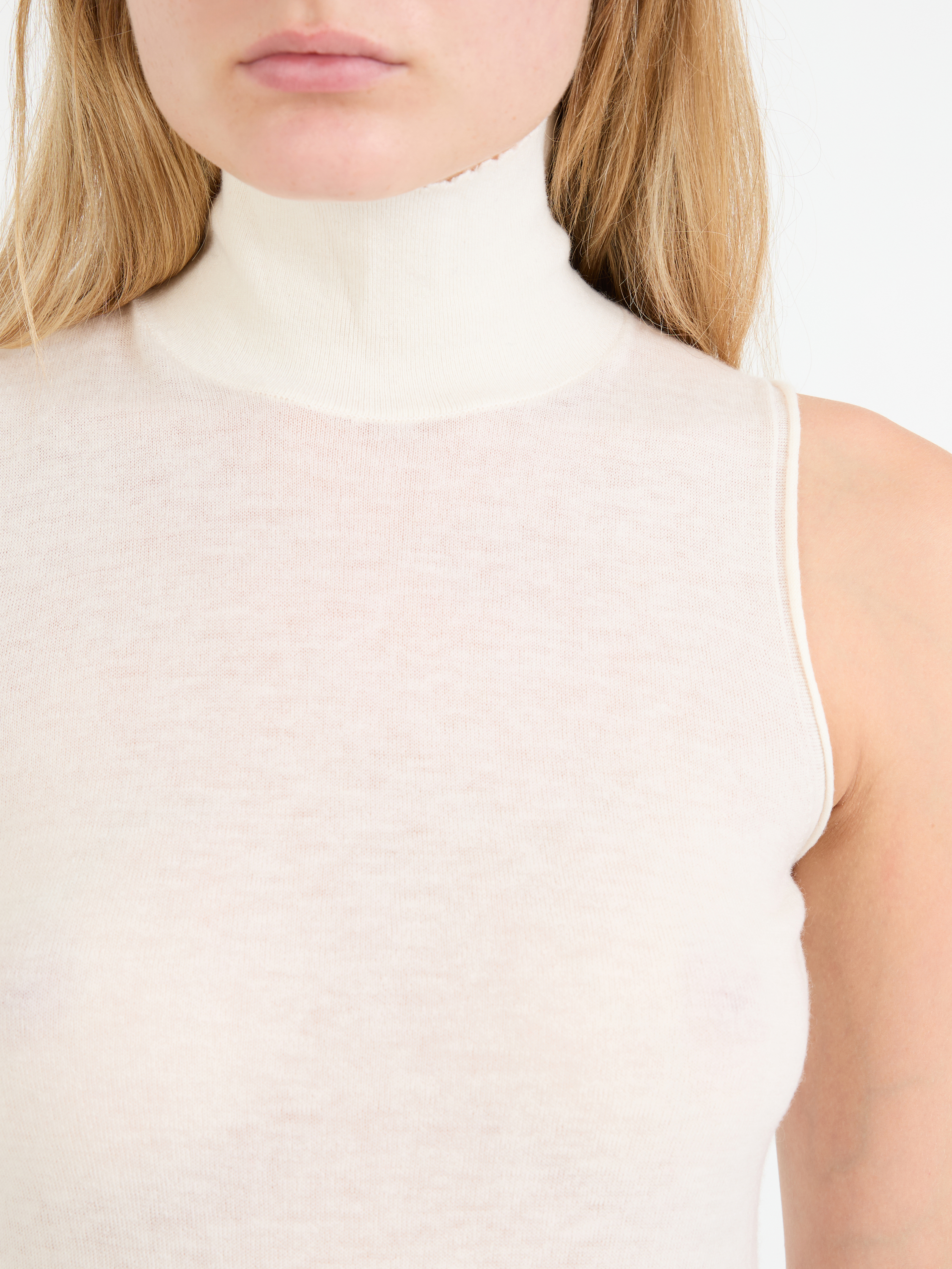 Das Top 'Delicate' in Crème von Dorothee Schumacher wurde aus einer hochwertigen Cashmere-Woll-Mischung gefertigt und besticht durch eine gerade Silhouette. Die körpernahe Passform, das wärmende Material und der Rollkragen perfektionieren dieses modische Modell.