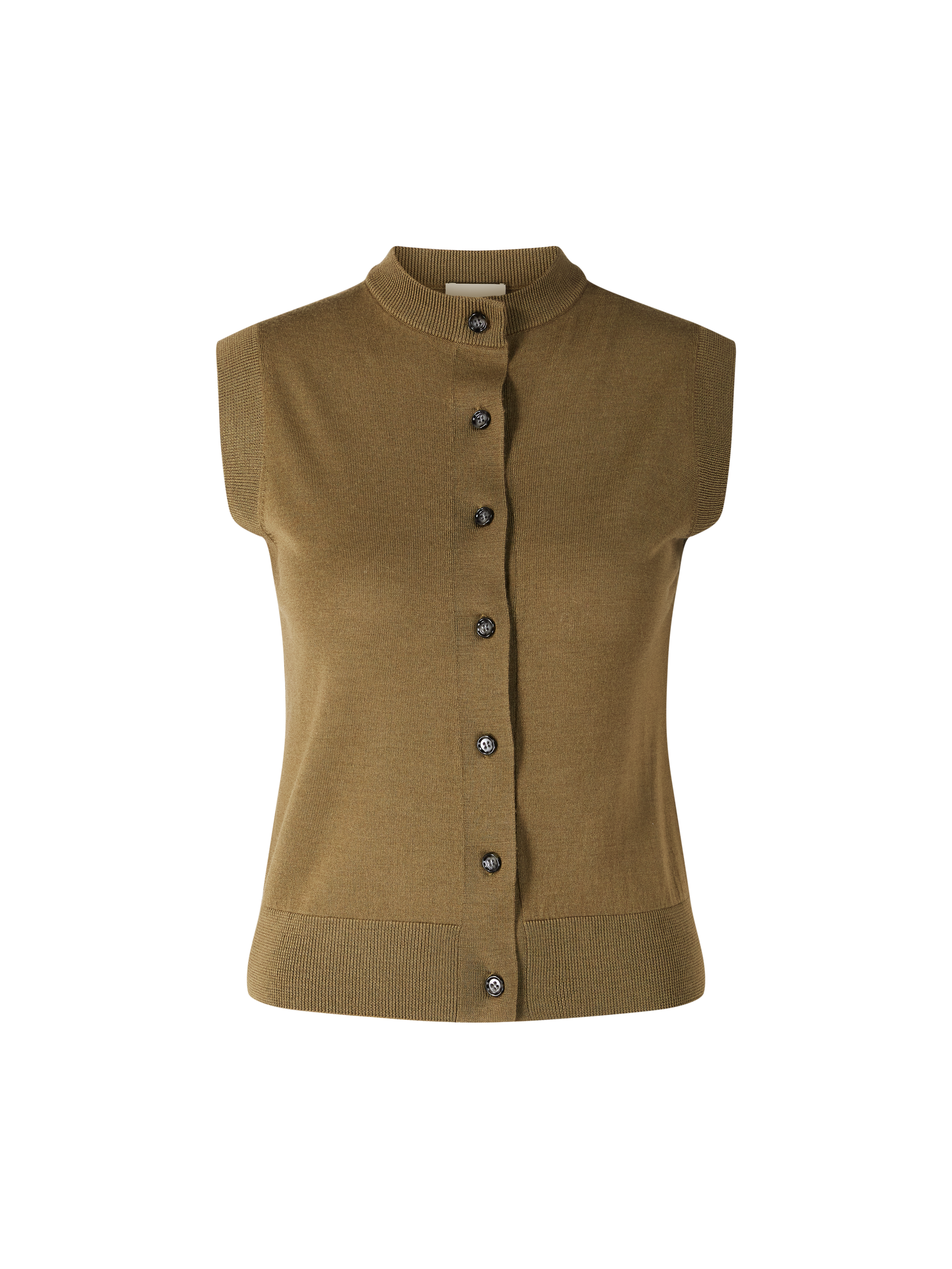 Diese Weste in Olivgrün von Allude wurde aus hochwertiger Schurwolle gefertigt und besticht durch die gerade Silhouette. Die melierte Optik, das ärmellose Design und der Rundhalsausschnitt perfektionieren dieses modische Modell. Die durchgehende Knopfleiste rundet das Design ab.