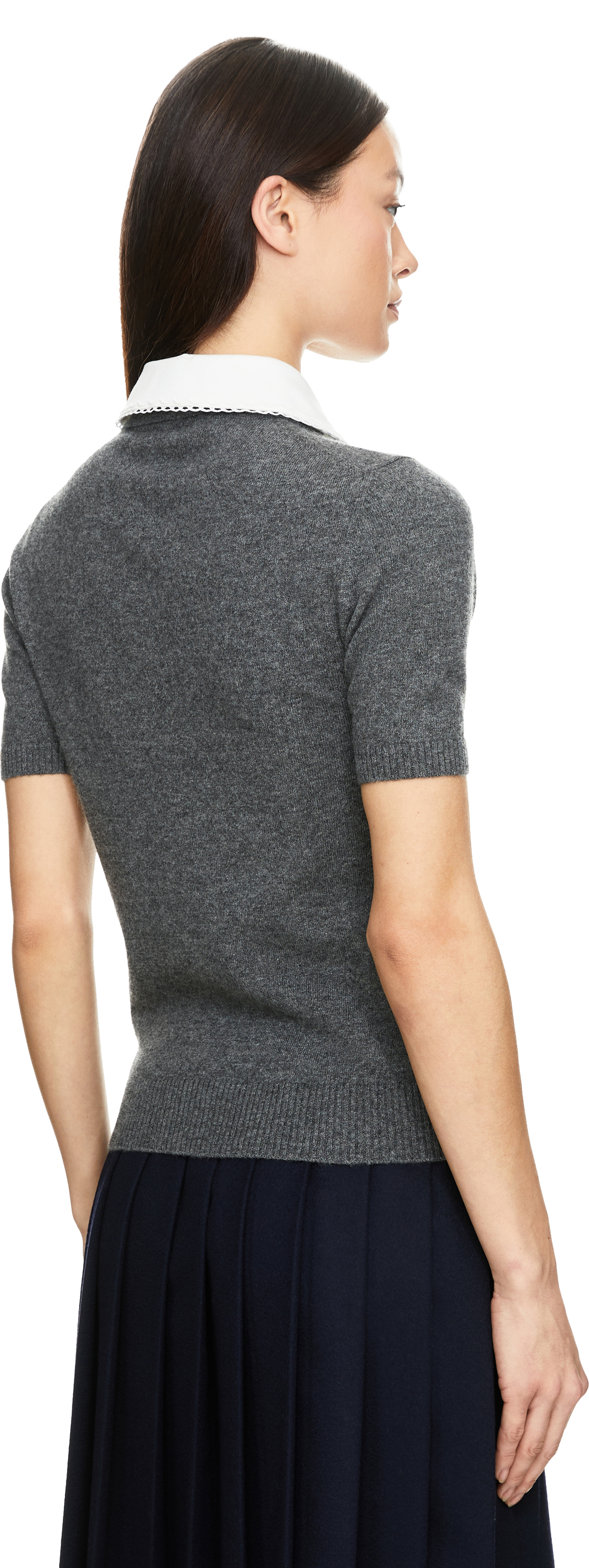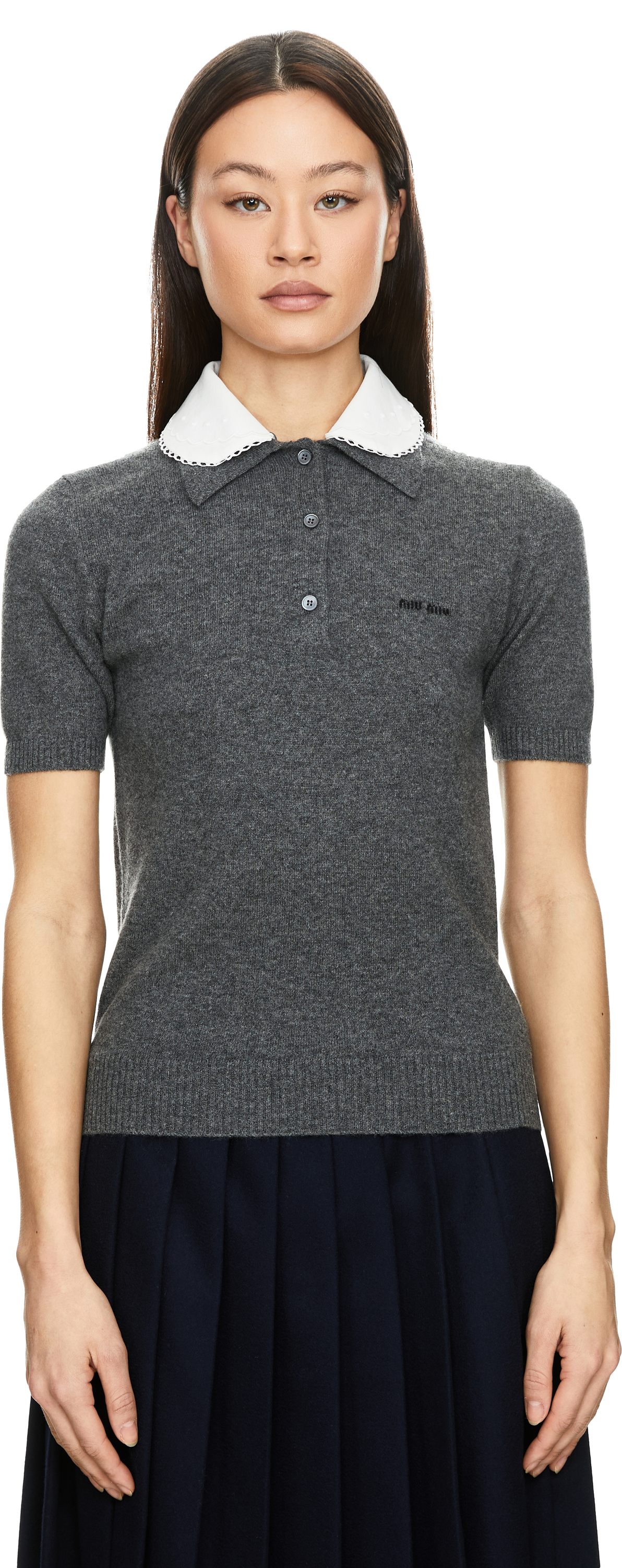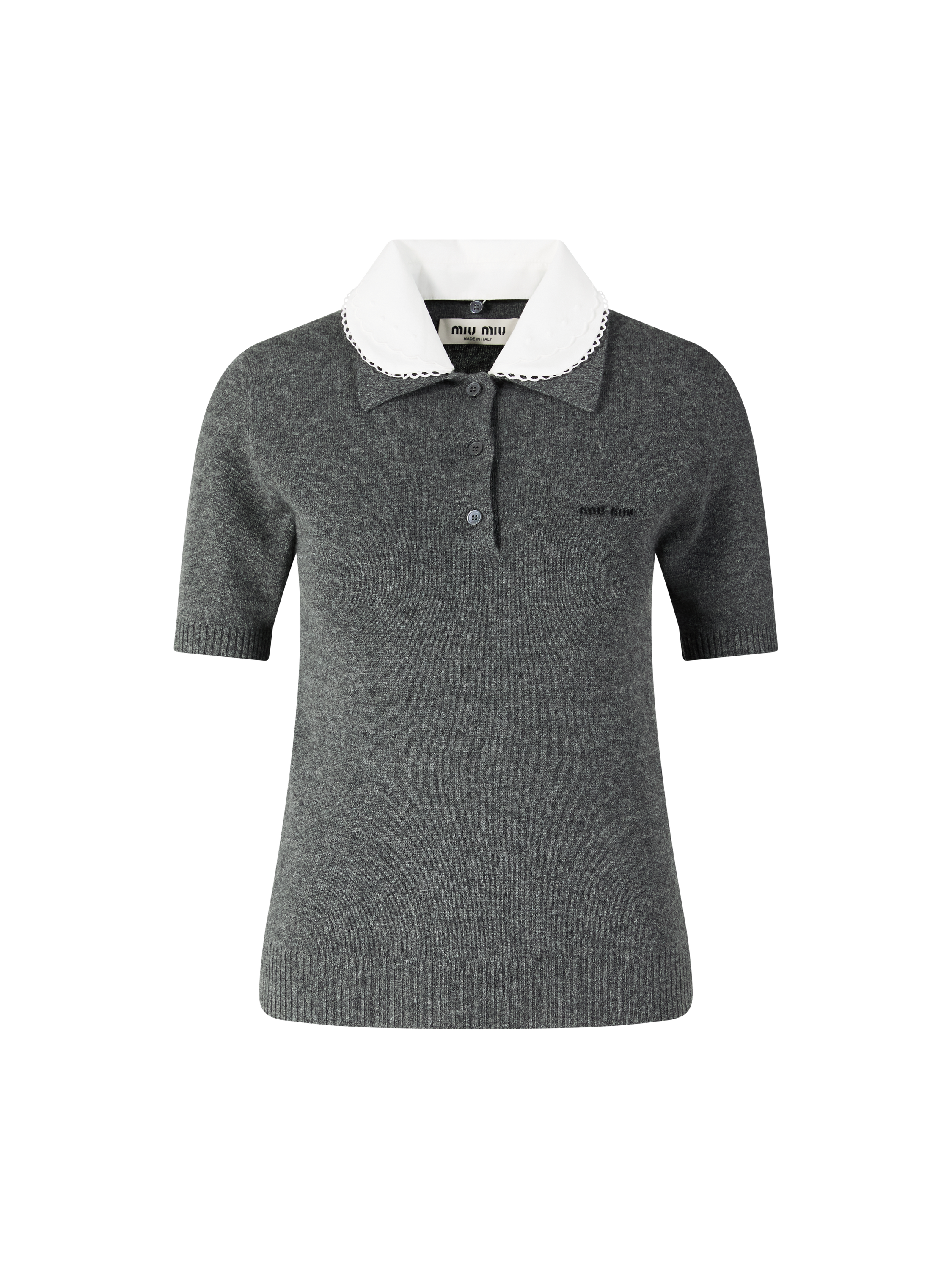 Dieses Poloshirt in Grau von miu miu wurde aus reinem Cashmere gefertigt und besticht durch die normale Passform. Der abnehmbare Popelinekragen mit eleganter Stickerei, die kurzen Ärmel sowie die Popeline-Knopfleiste vollenden dieses stilvolle Modell. Das Intarsienlogo auf der Vorderseite setzt einen dezenten Akzent.