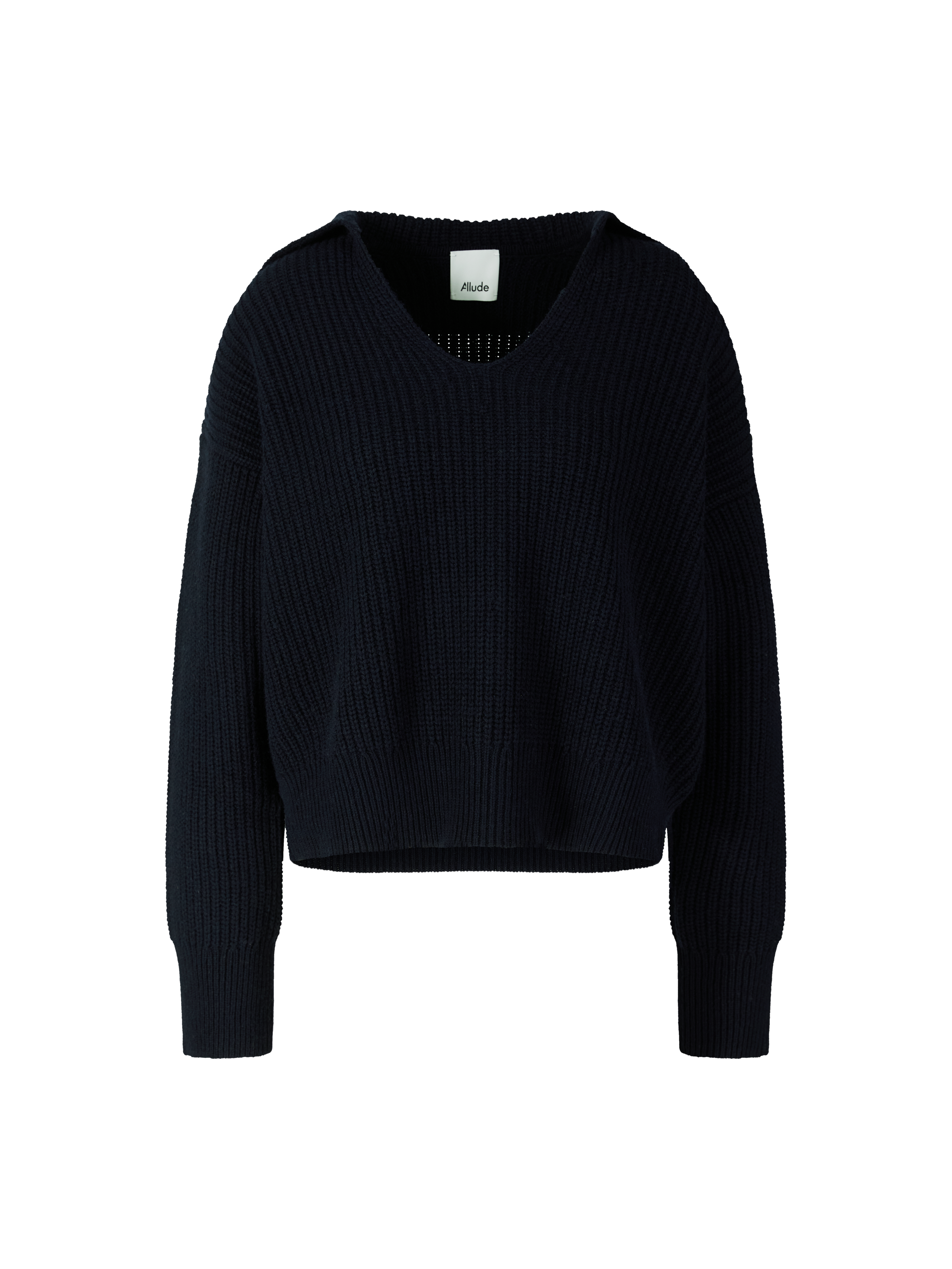 Dieser Pullover in Marineblau von Allude wurde aus einer hochwertigen Baumwoll-Cashmere-Mischung gefertigt und besticht durch seine entspannte Passform. Der Polokragen mit V-Ausschnitt, die überschnittenen Schultern und die verlängerte Rückenpartie zeichnen dieses hochwertige Design aus.