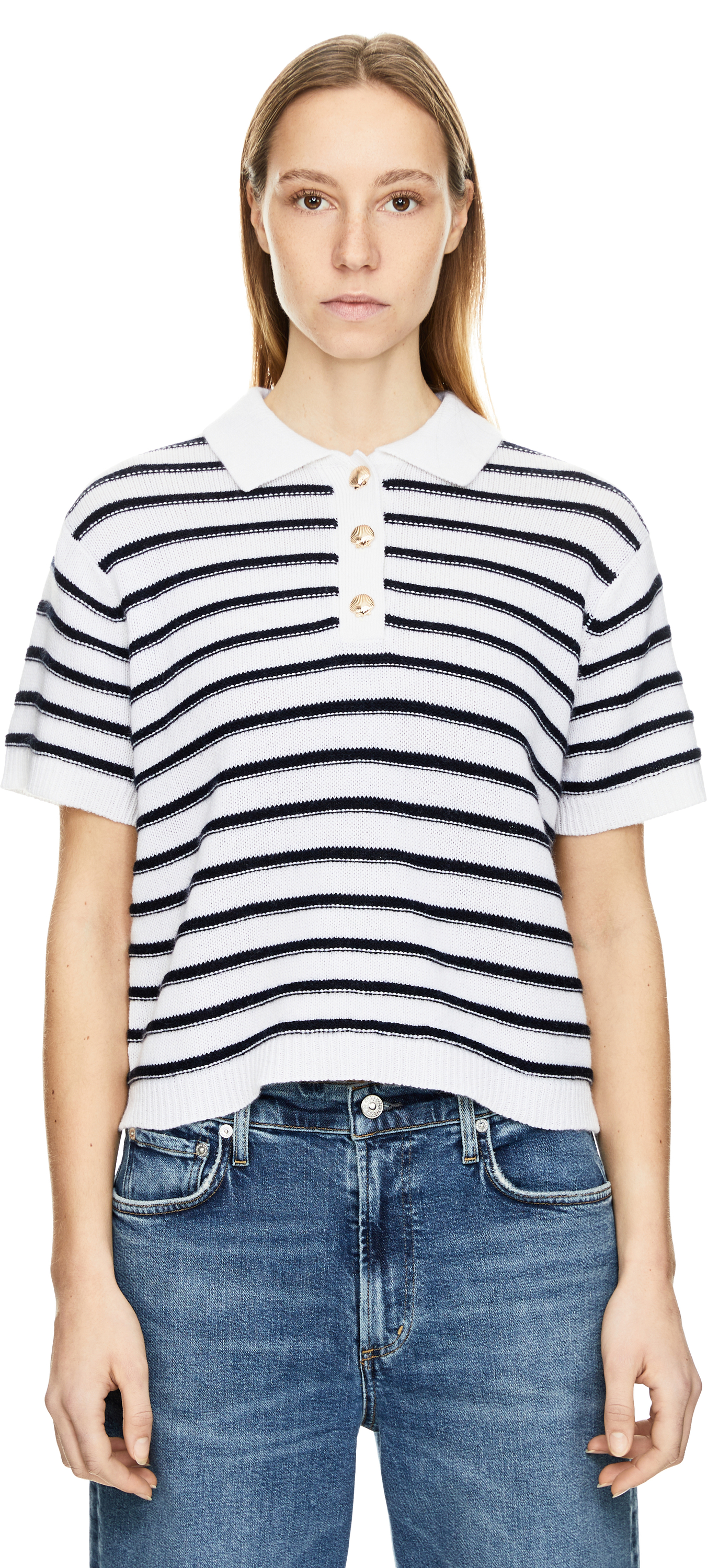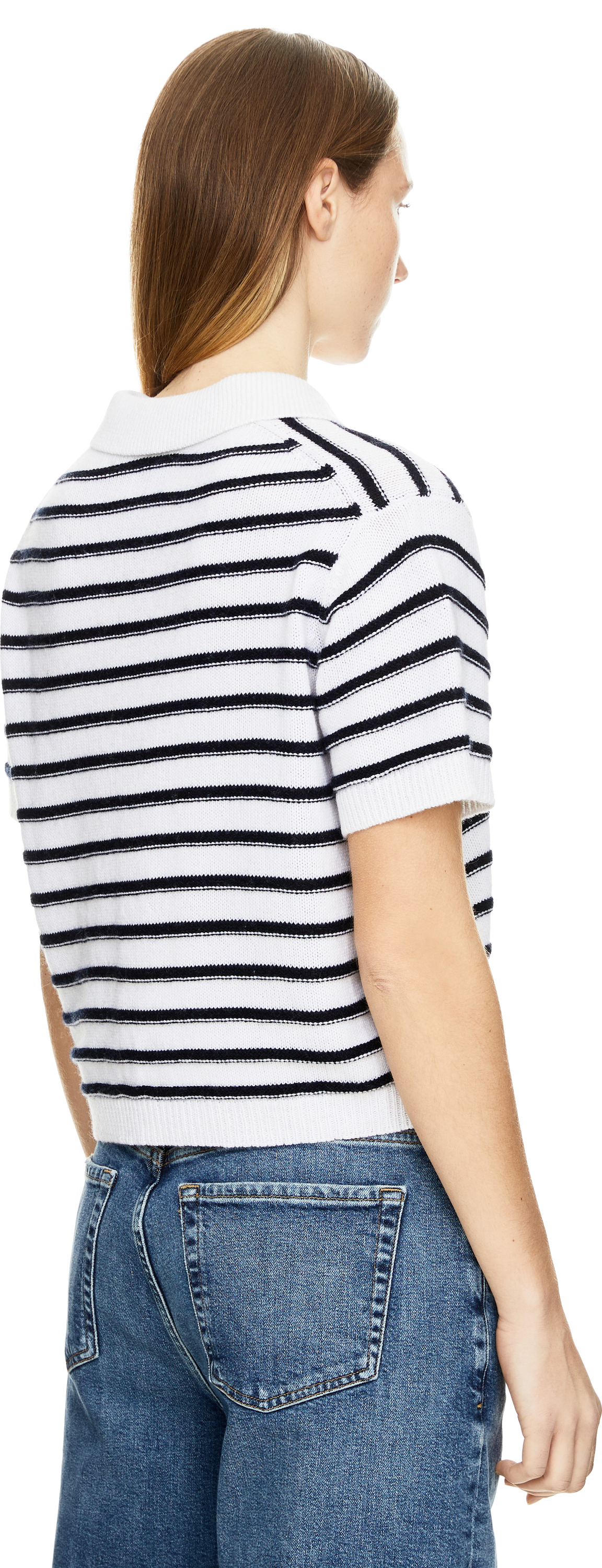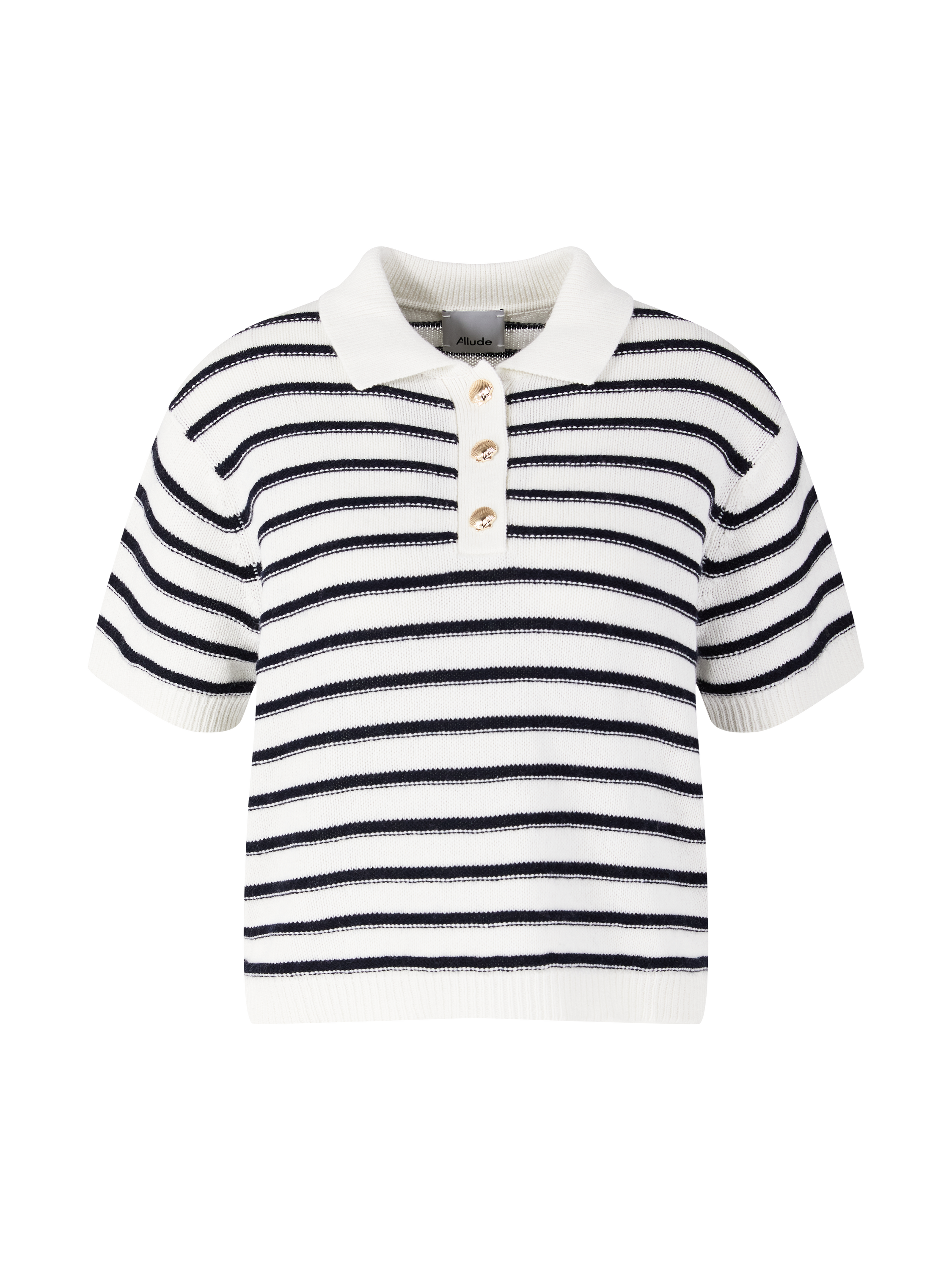 Dieser Pullover in Marineblau von Allude wurde aus einer Baumwoll-Cashmere-Mischung gefertigt und besticht durch den leicht taillierten Schnitt. Die kurzen Ärmel, die Rippbündchen am Saum, der Umlegekragen sowie das Strickmuster runden dieses Design stilvoll ab.