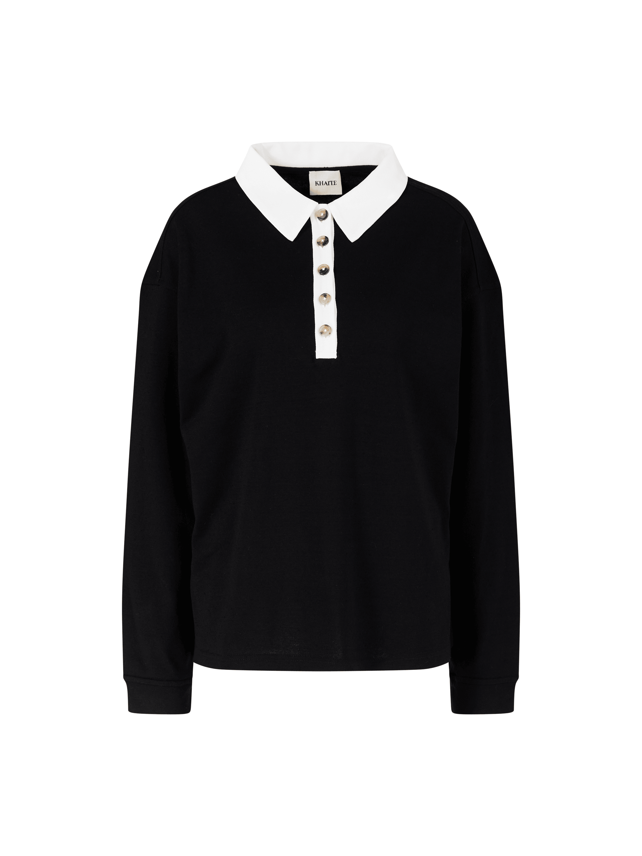 Dieses Poloshirt in Schwarz von Khaite wurde aus einer Baumwolle gefertigt und besticht durch die gerade Silhouette. Der Kragen aus Seide und die verkürzte Knopfleiste mit Logoprägung setzten einen eleganten Akzent.