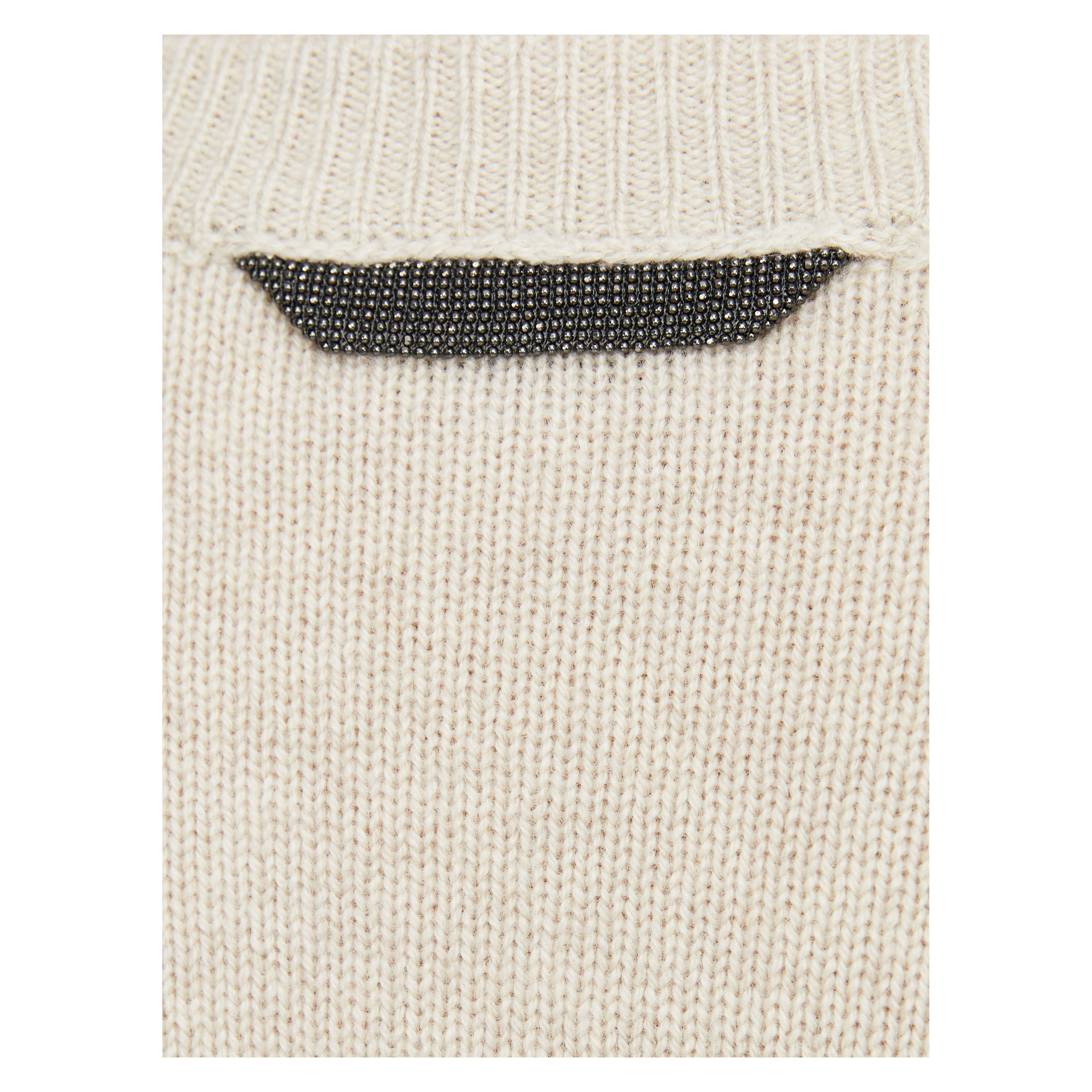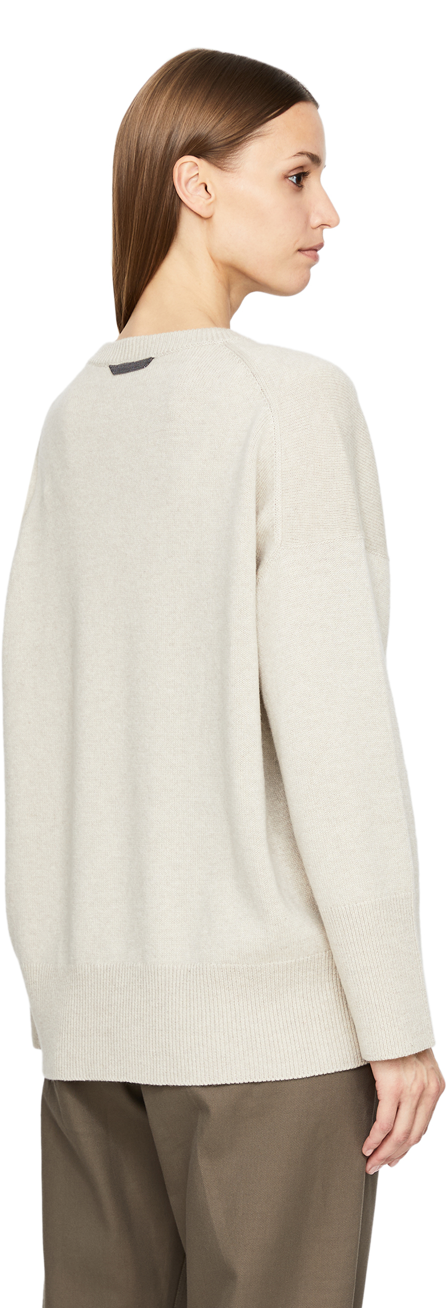 Dieser Pullover in Beige von Brunello Cucinelli wurde aus reinem Cashmere gefertigt und besticht durch die Monili-Perlen am Nacken. Die überschnittenen Schultern, der Rundhalsausschnitt und der Feinstrick perfektionieren das Design.
