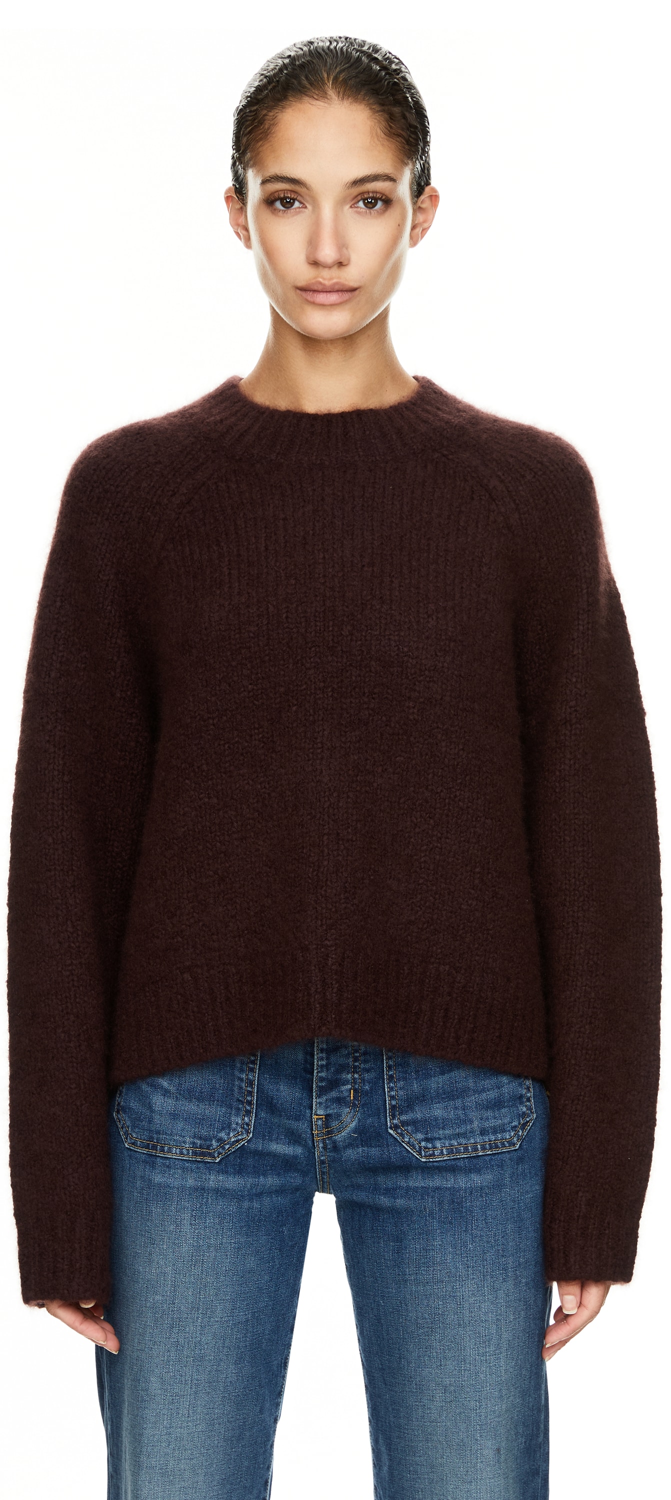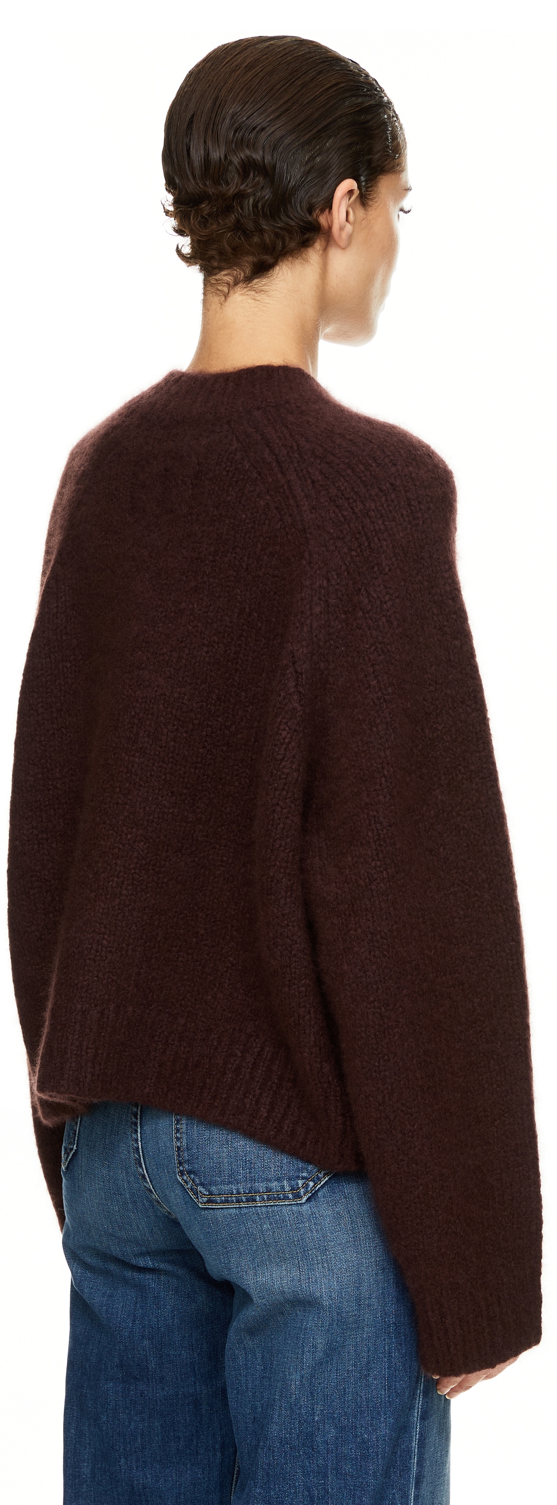 Der Pullover 'Tomaso' in Bordeaux von NILI LOTAN wurde aus einer weichen, mittelschweren Cashmere-Seidenmischung gefertigt und besticht durch die leicht lockere Kastenform. Der hohe, weite Halsausschnitt, die Raffungen am Armausschnitt, die Rippstrickbündchen an Saum und Ärmeln sowie das Zopfmuster im Rücken verleihen diesem hochwertigen Modell seinen besonderen Charakter.