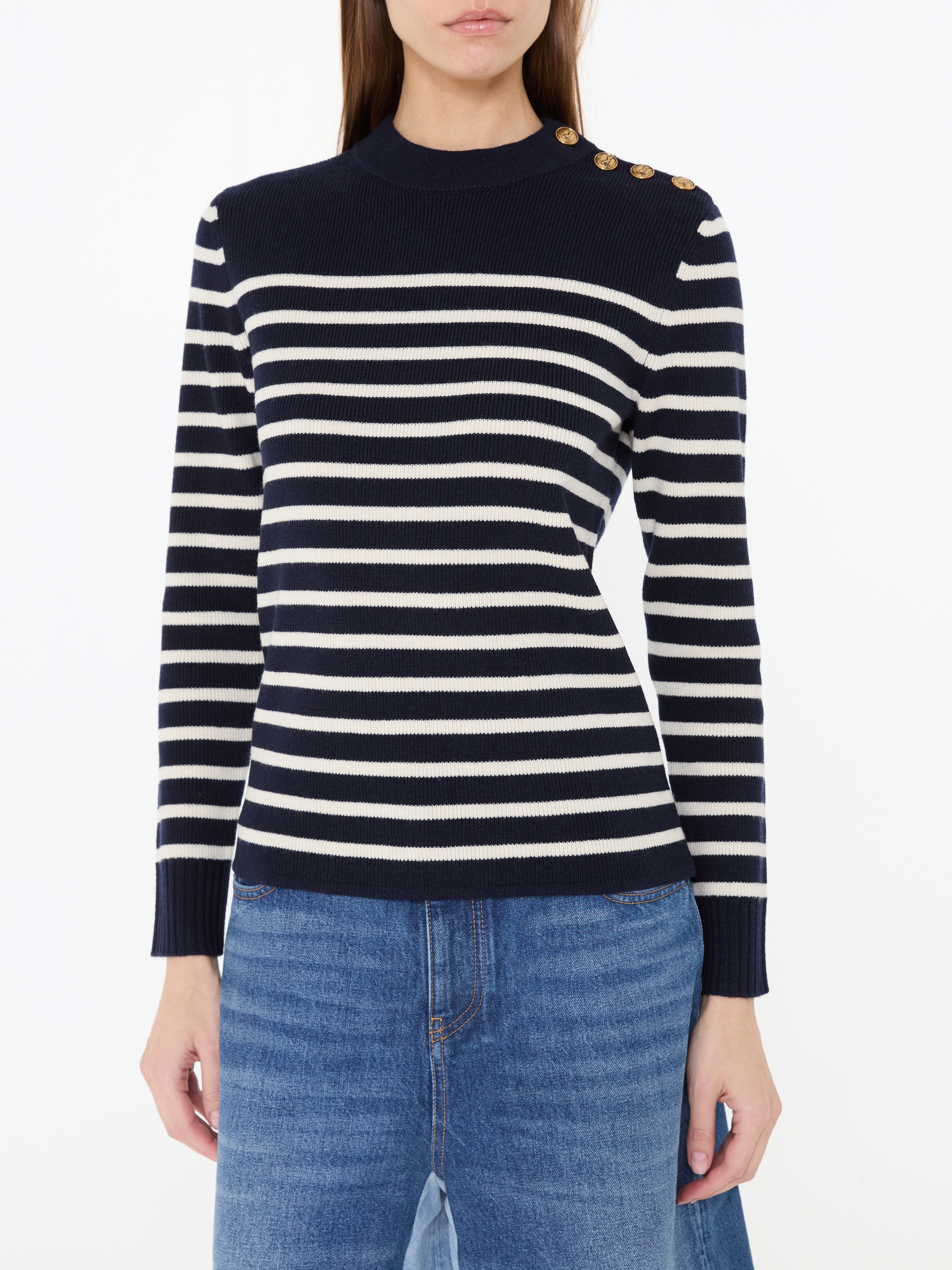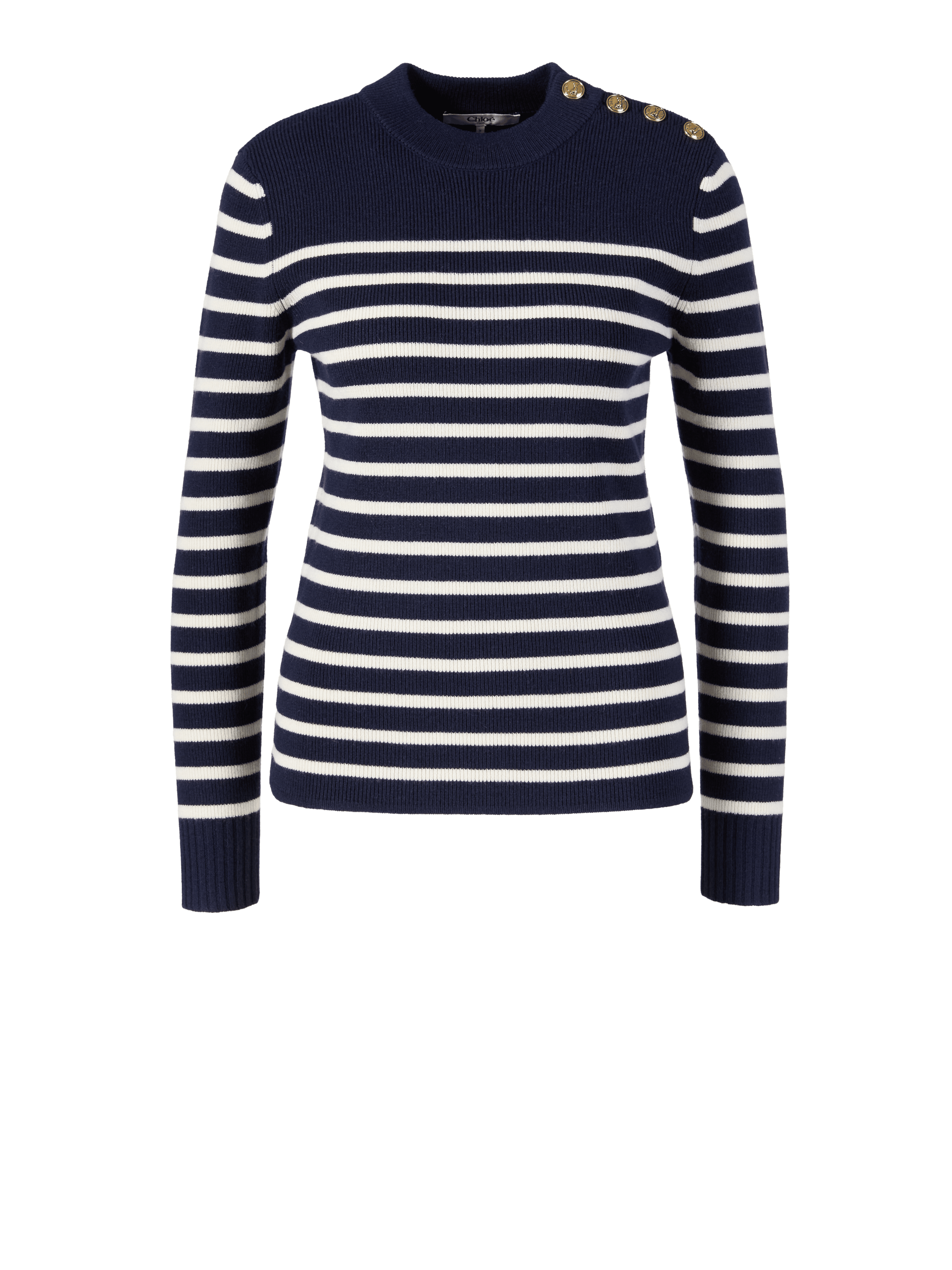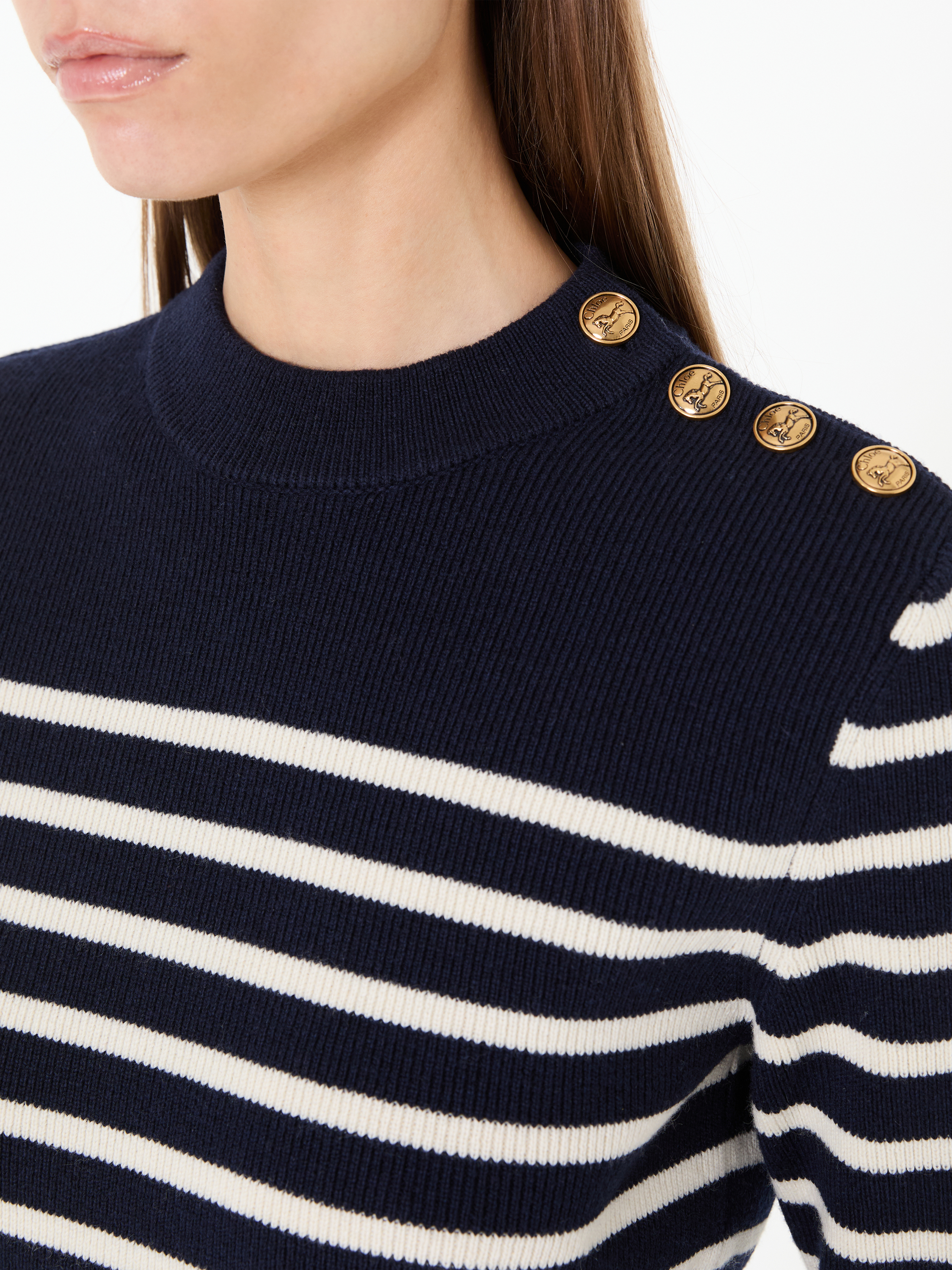 Dieser Pullover in Marineblau/Weiß von Chloé wurde aus einer hochwertigen Mischung aus Schurwolle und Cashmere gefertigt. Die goldfarbenen Militärknöpfe an der rechten Schulter und die maritime Optik runden dieses Design stilvoll ab.