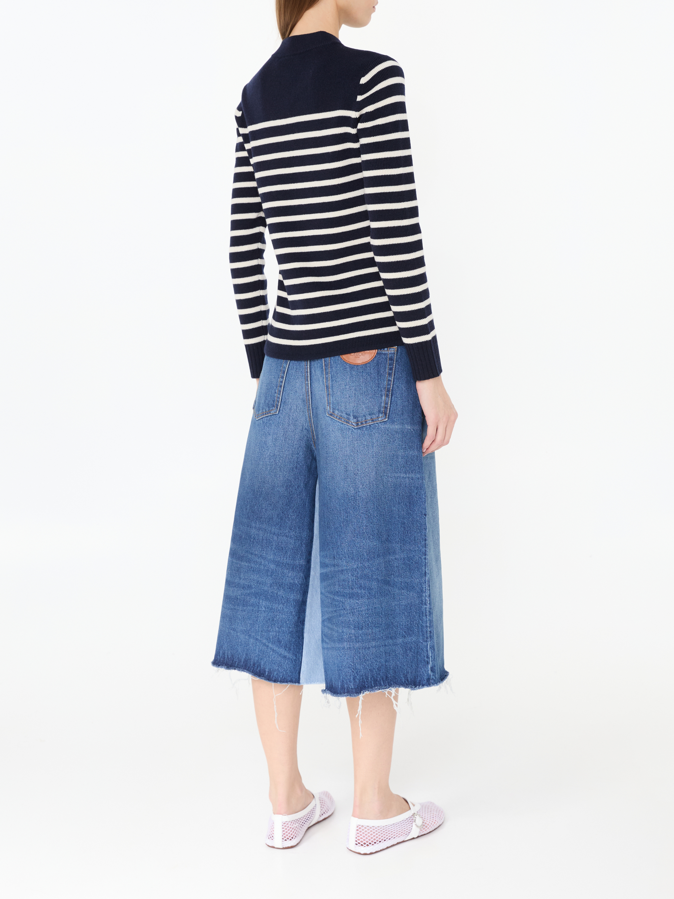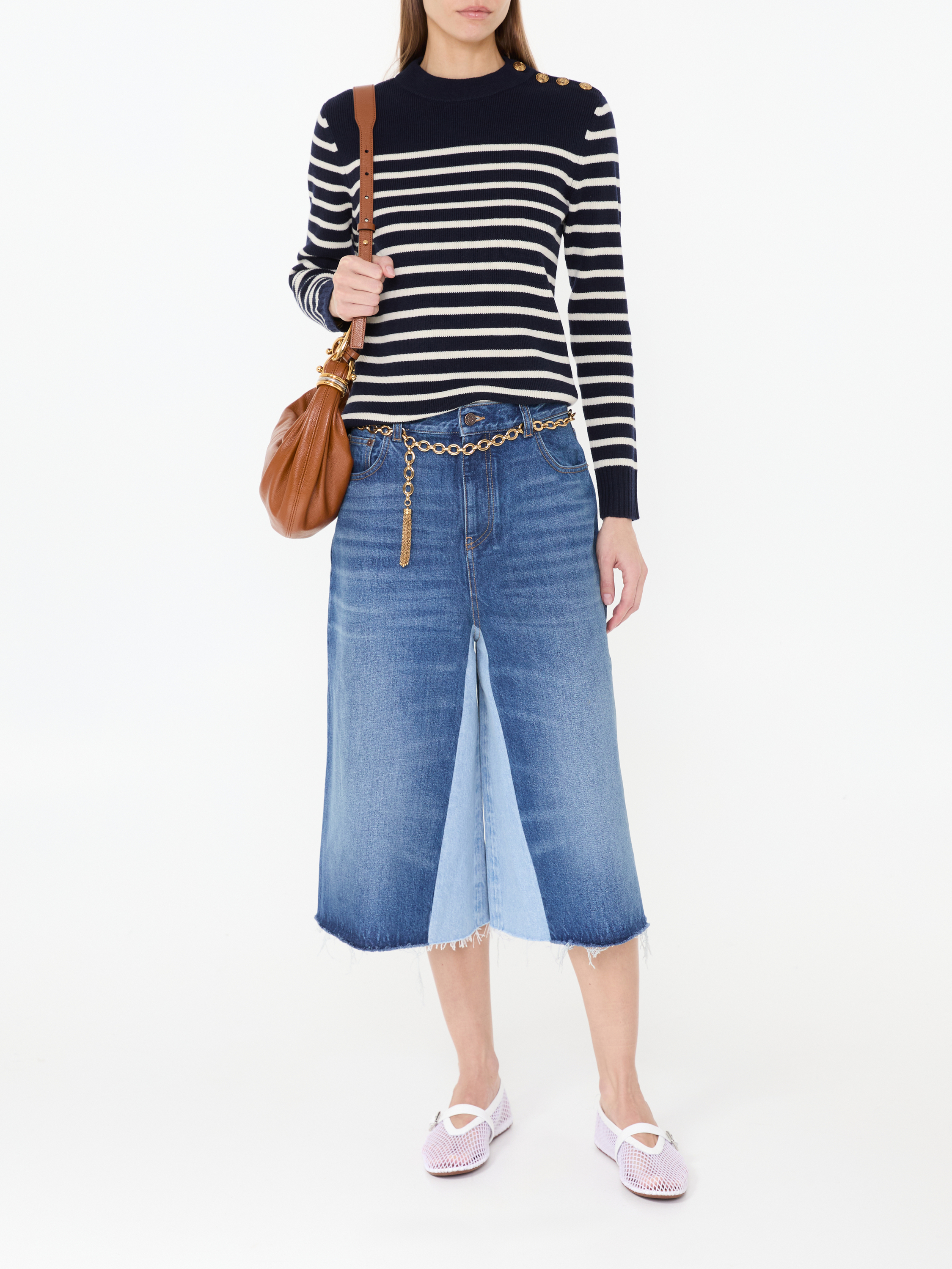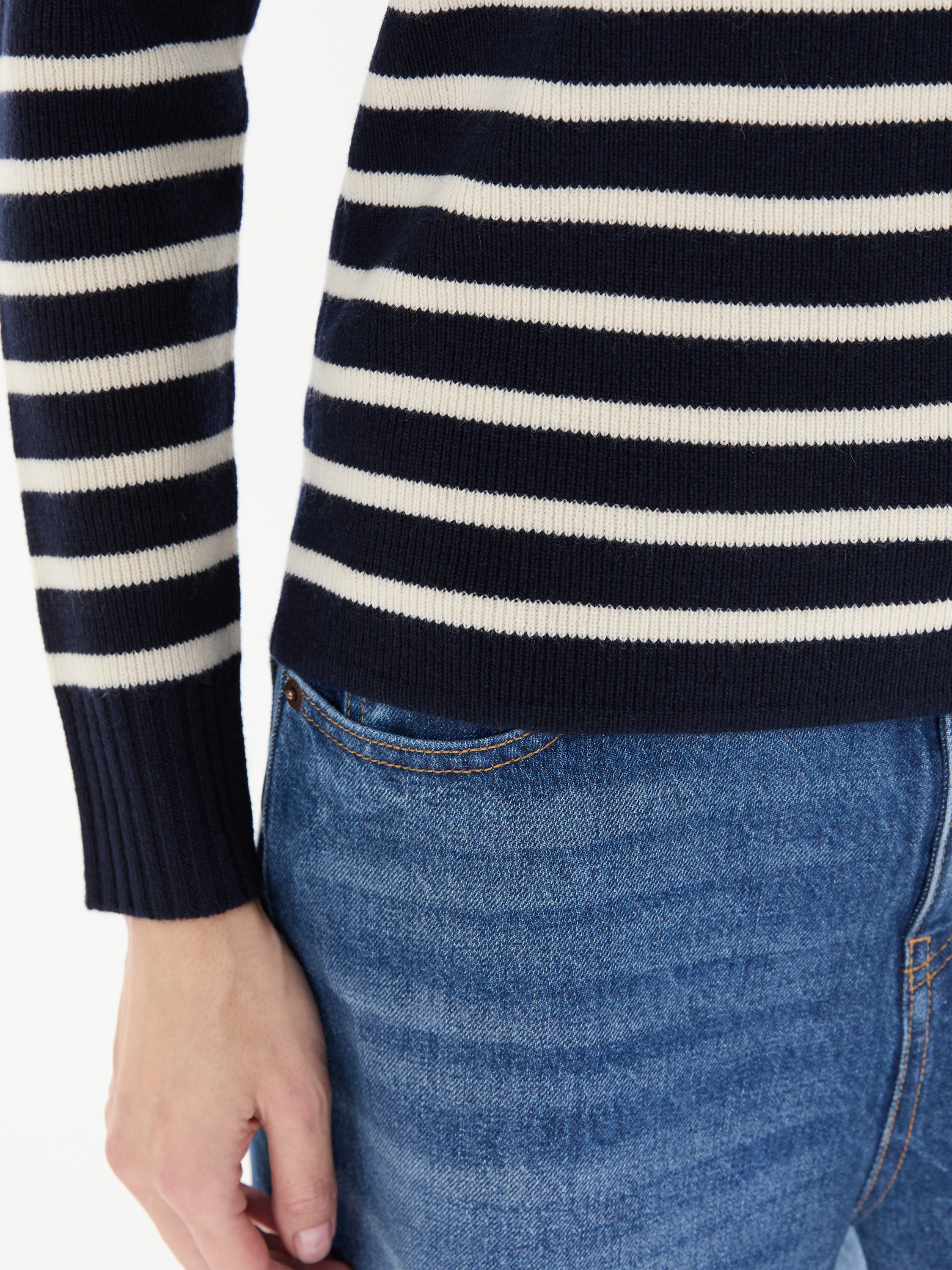 Dieser Pullover in Marineblau/Weiß von Chloé wurde aus einer hochwertigen Mischung aus Schurwolle und Cashmere gefertigt. Die goldfarbenen Militärknöpfe an der rechten Schulter und die maritime Optik runden dieses Design stilvoll ab.