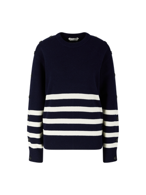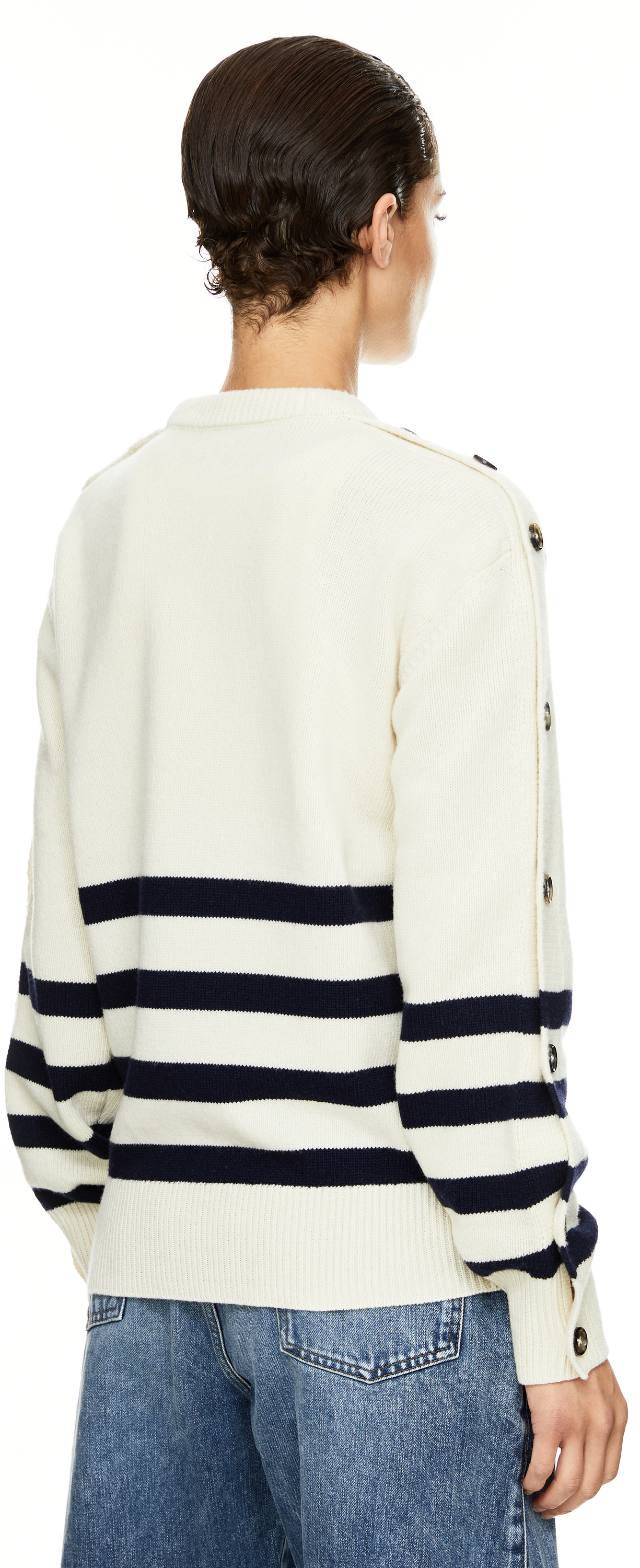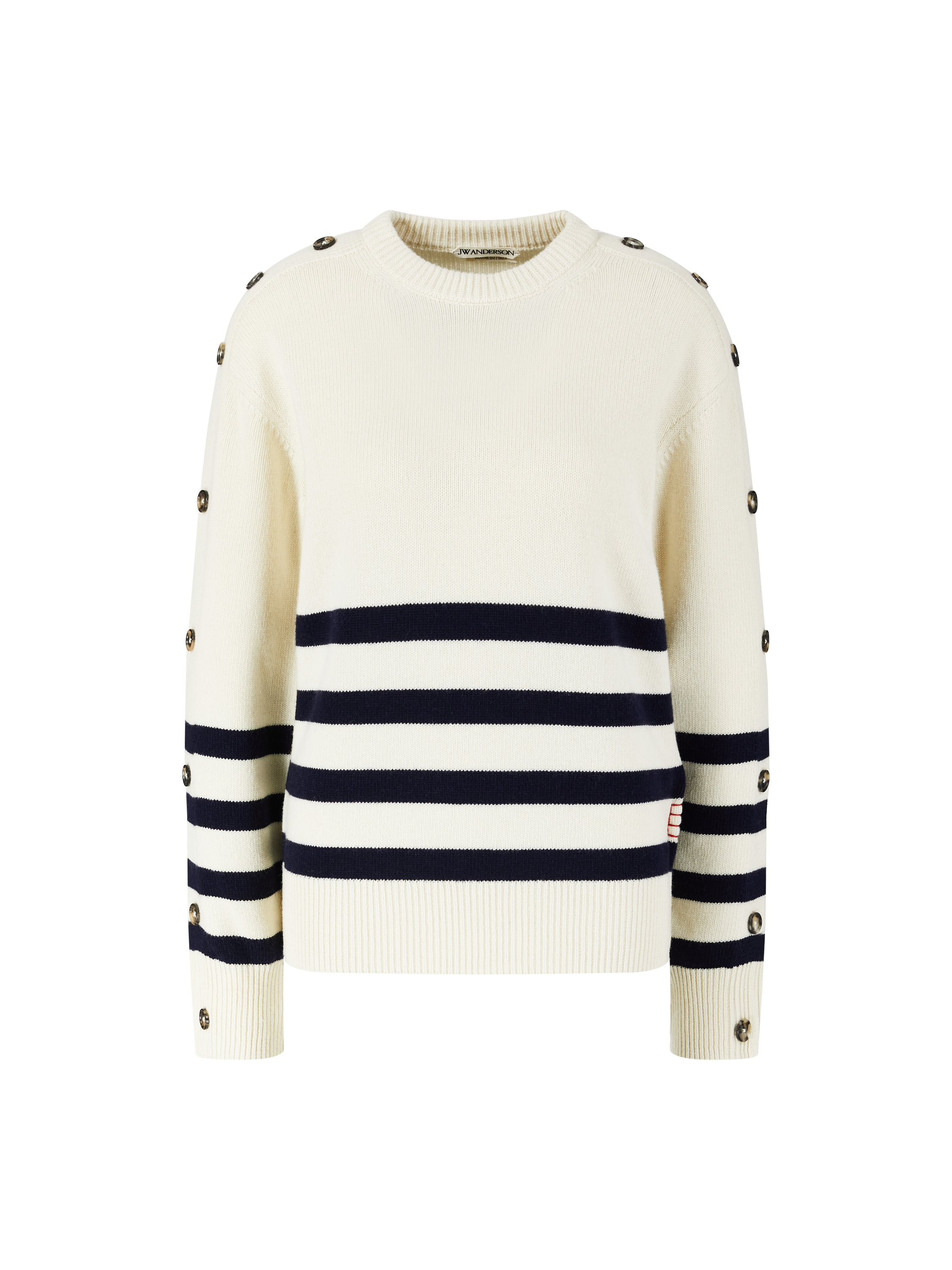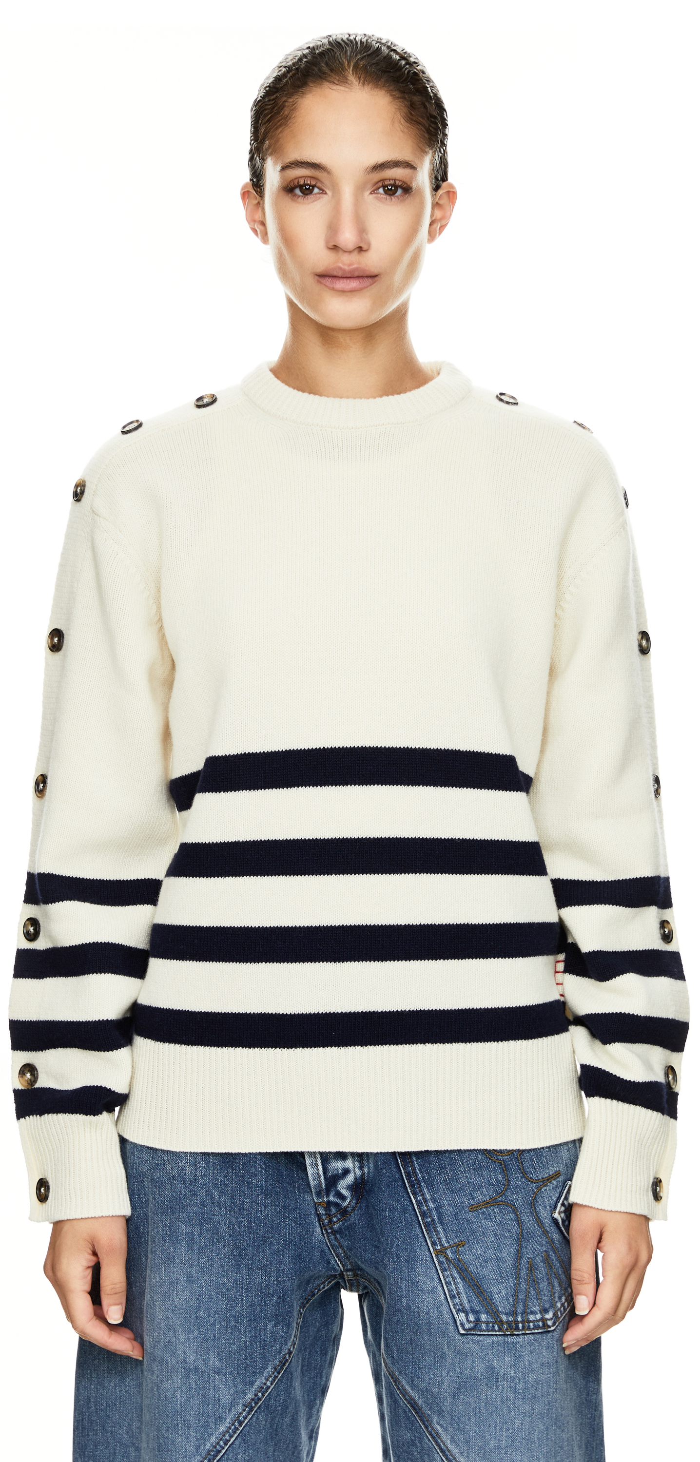 Dieser Pullover in Crème von JW Anderson wurde aus hochwertiger Schafswolle gefertigt und besticht durch die leicht, übergroße Passform. Die Knopfdetails an Schulter und Ärmeln mit Logo-Gravur, der Rundhalsausschnitt und die breiten weißen Streifen am Saum und an den Ärmeln runden dieses Design stilvoll ab.