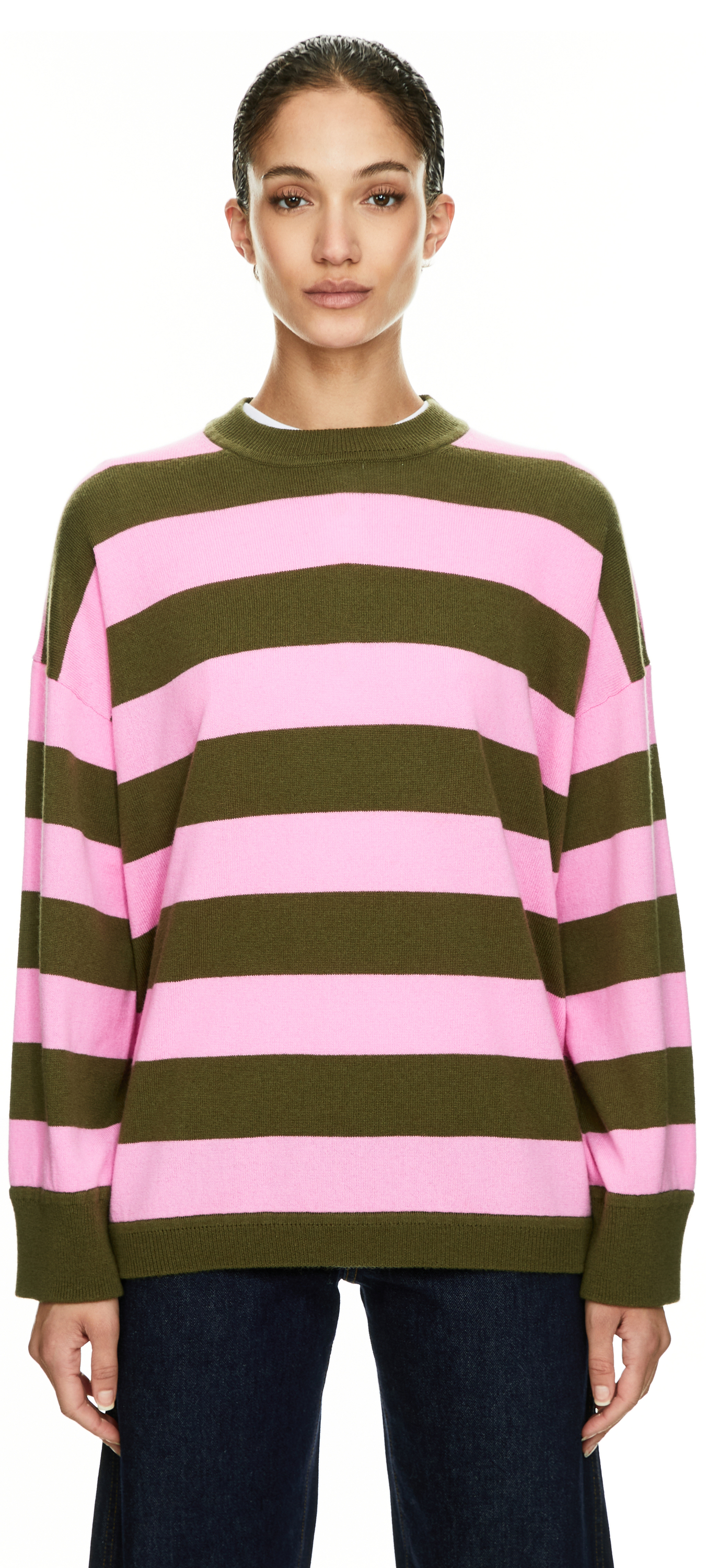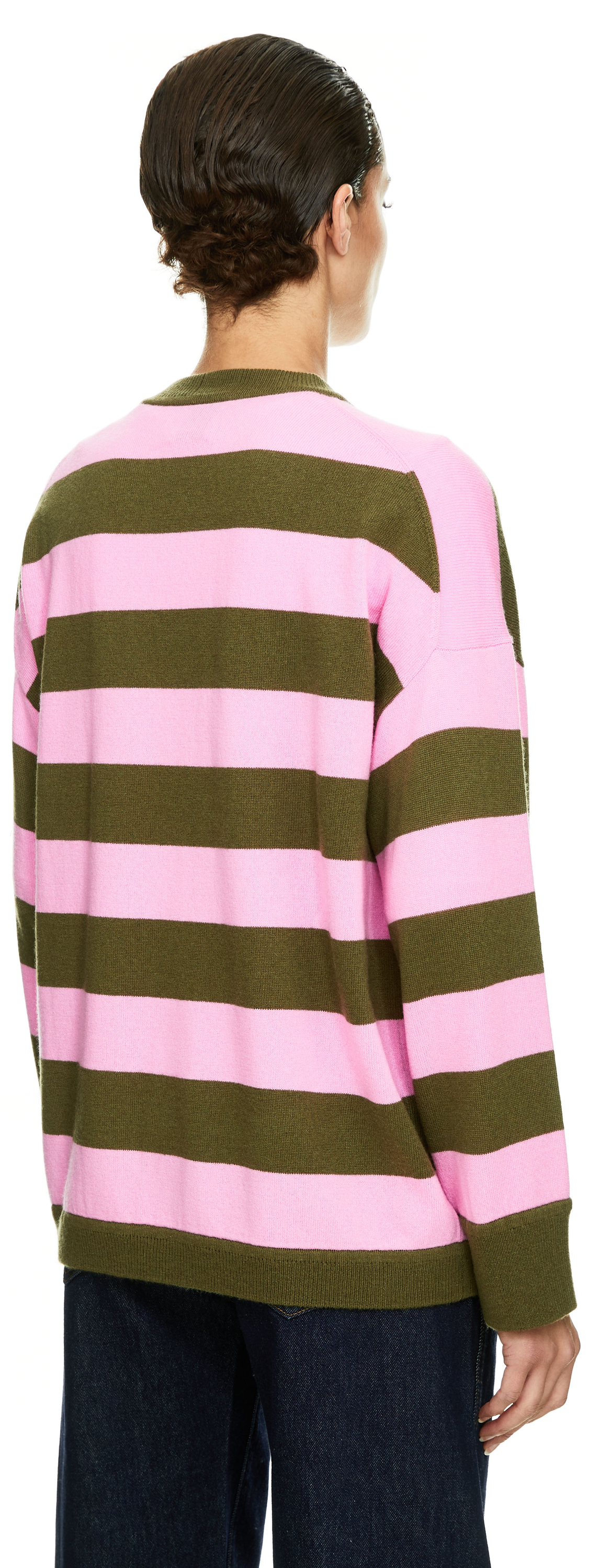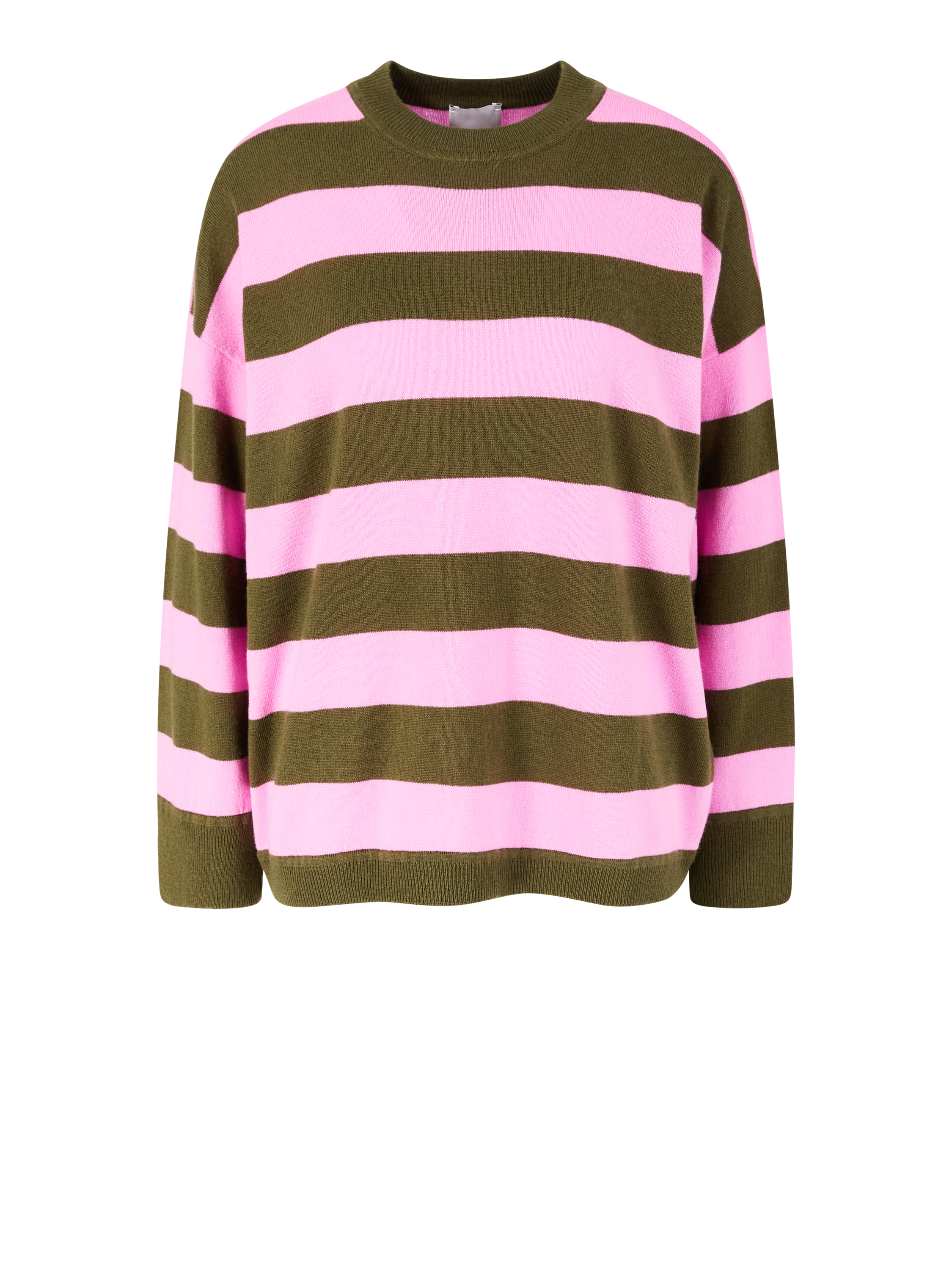 Dieser Pullover in Pink/Khaki von Allude wurde aus einer hochwertigen Woll-Cashmere-Mischung gefertigt und besticht durch das markante Streifenmuster, das dem Design eine moderne Note verleiht. Der Oversized Fit sorgt für eine lässige Silhouette, während der klassische Rundhalsausschnitt und die weiche Haptik den hohen Tragekomfort unterstreichen.
