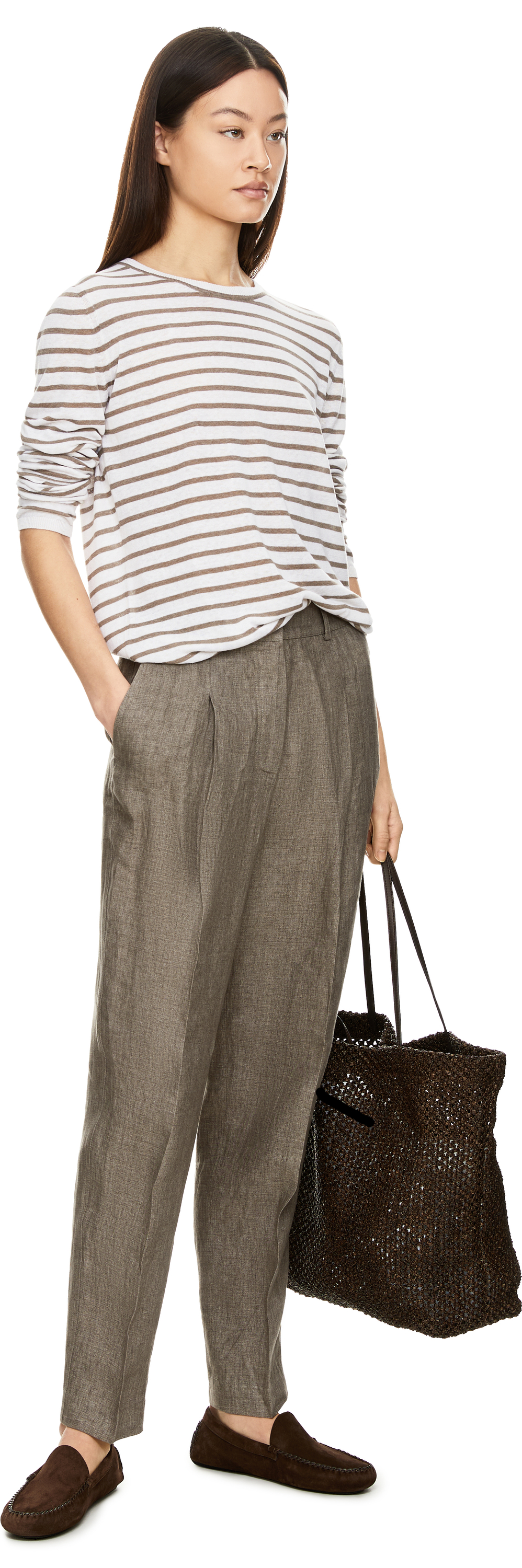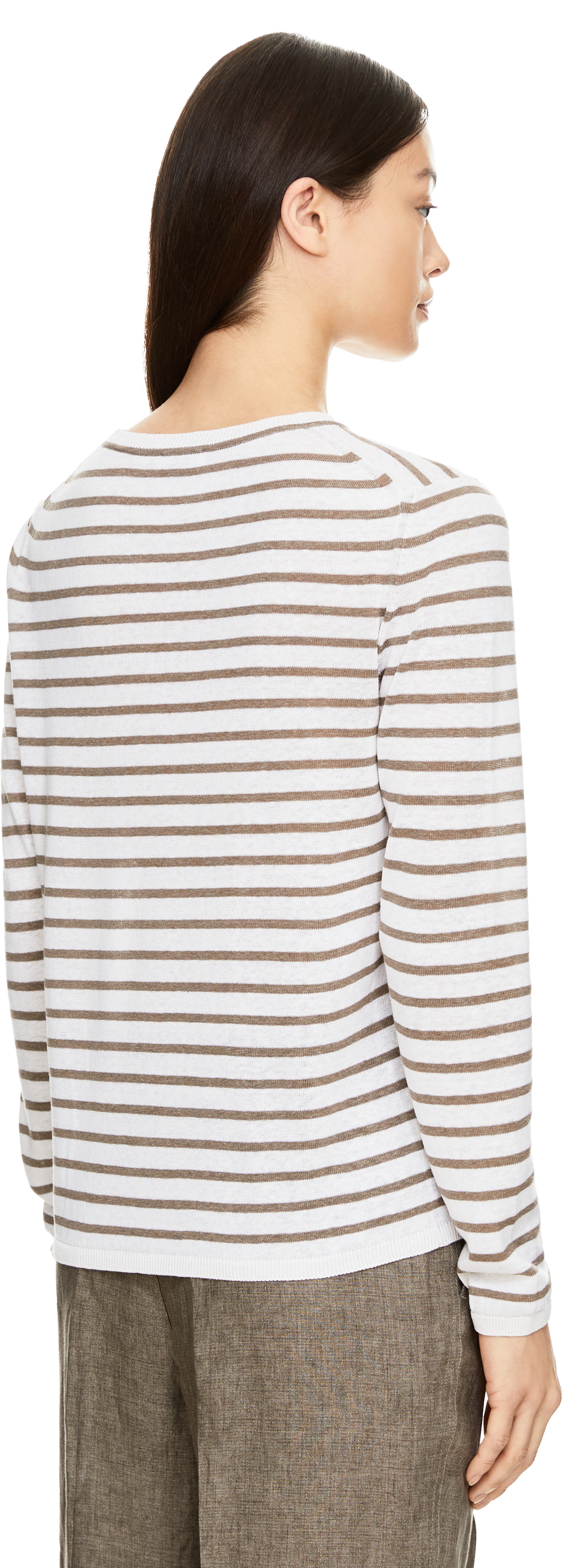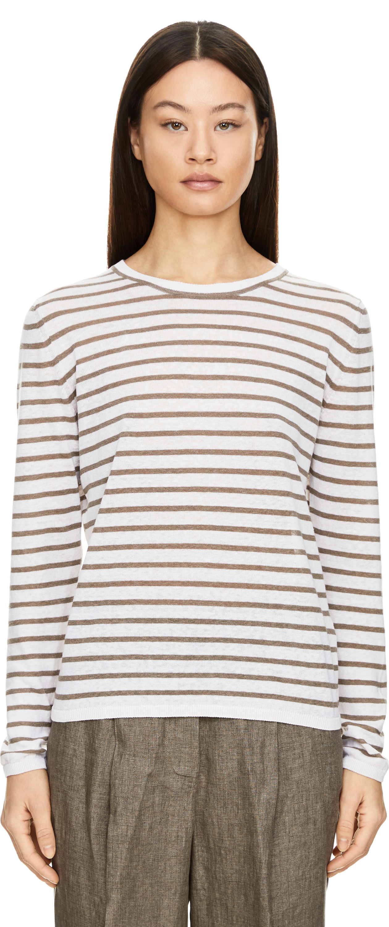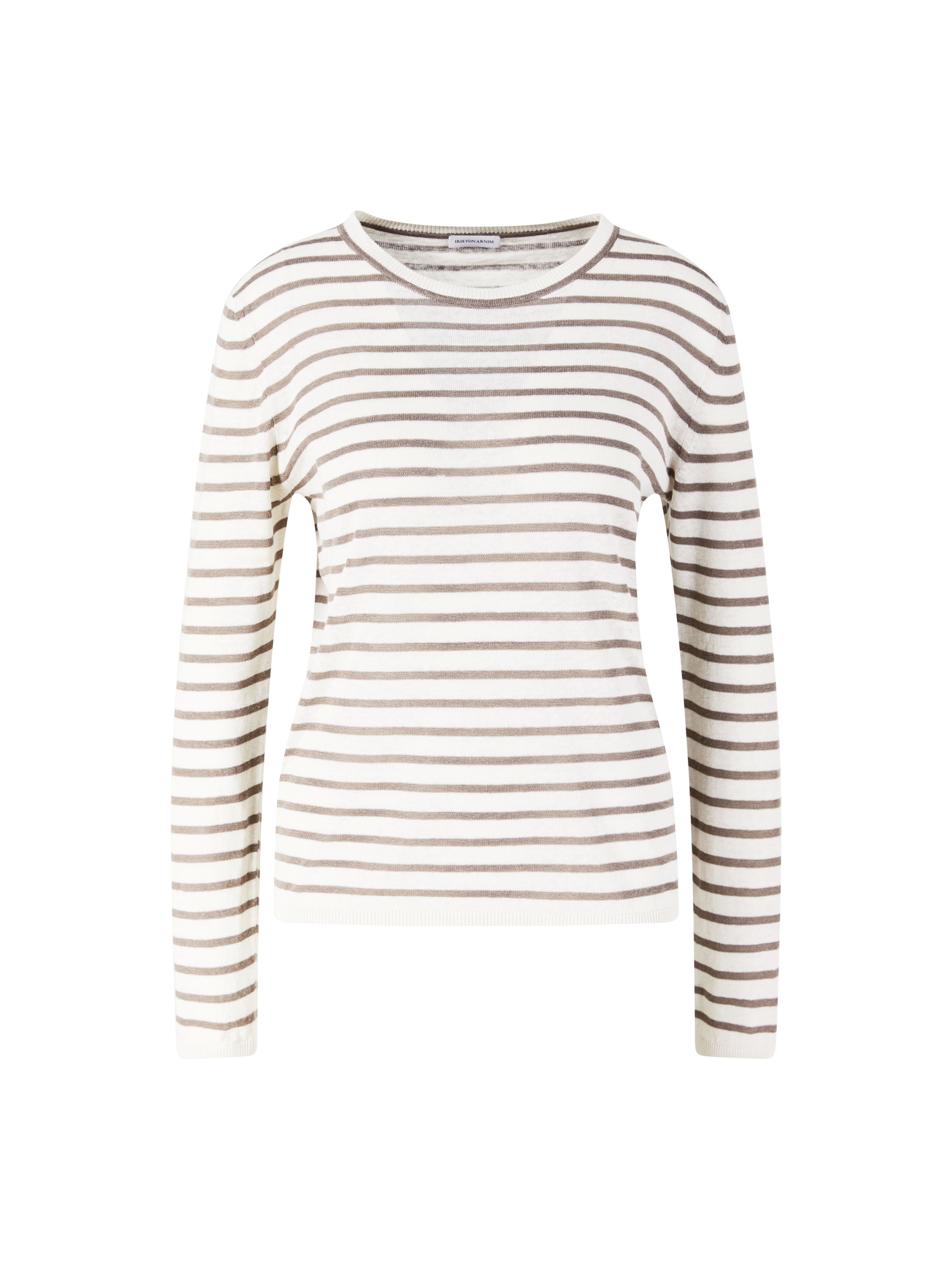 Das Shirt 'Elyse' in Off White/Taupe von Iris von Arnim wurde aus einer hochwertigem Seiden-Leinenmischung gefertigt und besticht durch das Streifenmuster. Die gerade Passform, der Rundhalsausschnitt sowie der feine Rippstrick runden das Modell elegant ab.
