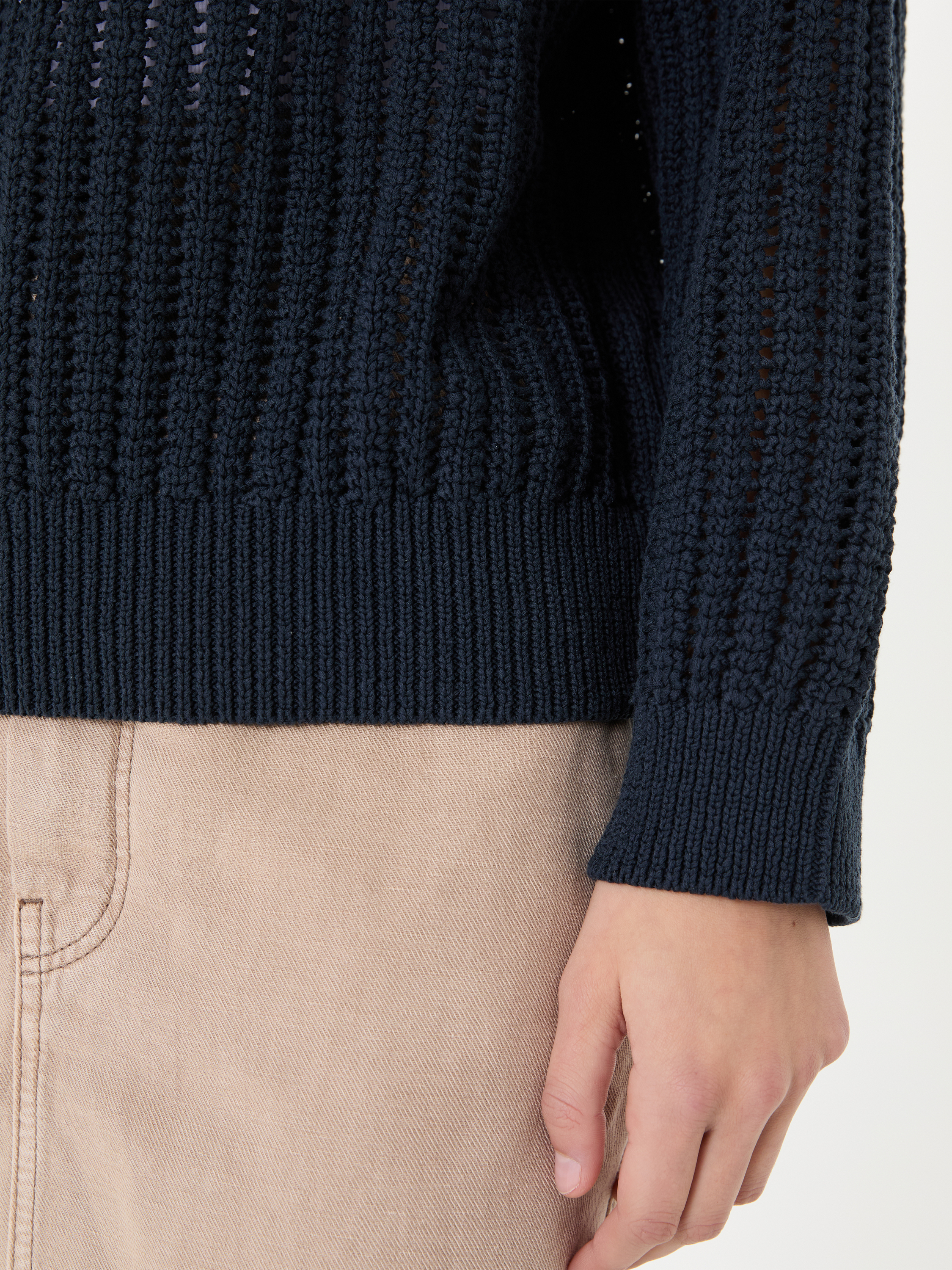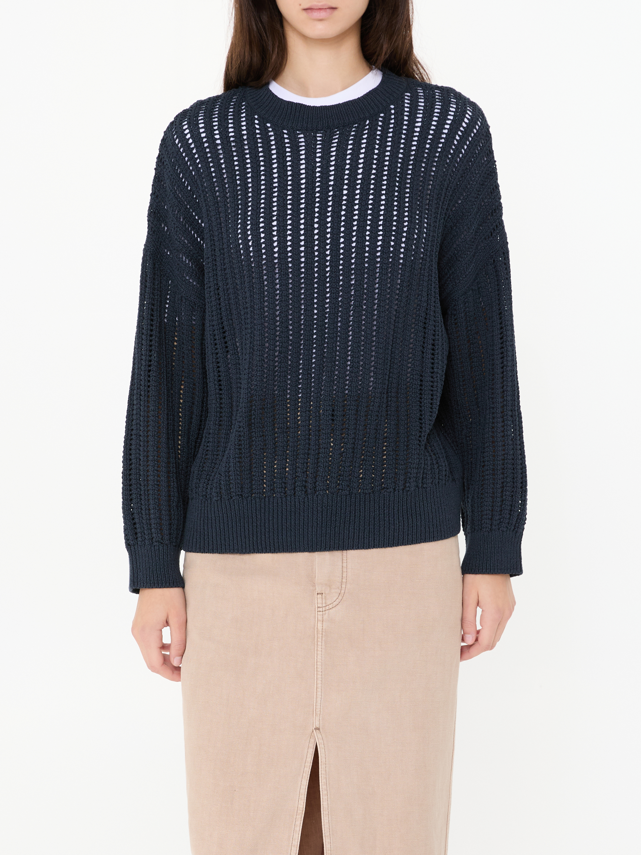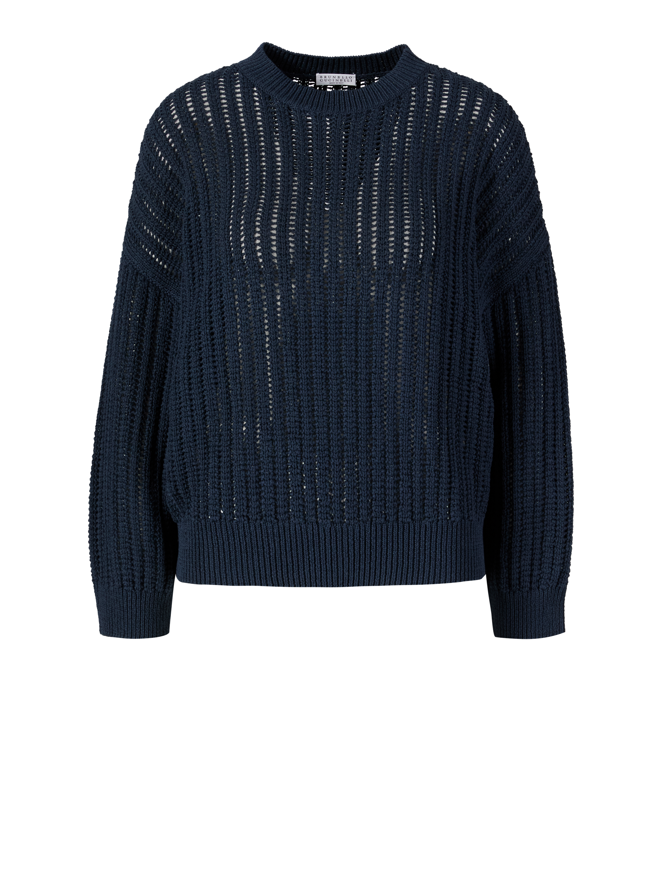 Dieser Pullover in Marineblau von Brunello Cucinelli wurde aus Baumwolle gefertigt und besticht durch ein lässiges Lochmuster. Der Rippstricksaum und die eingearbeiteten Pailletten vollenden dieses besondere Modell.