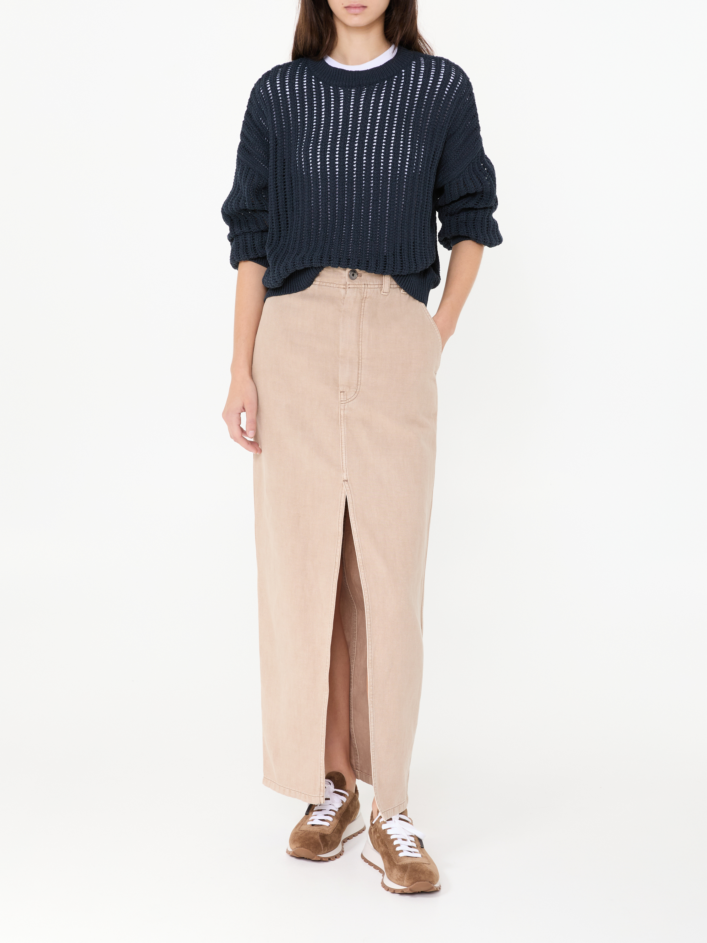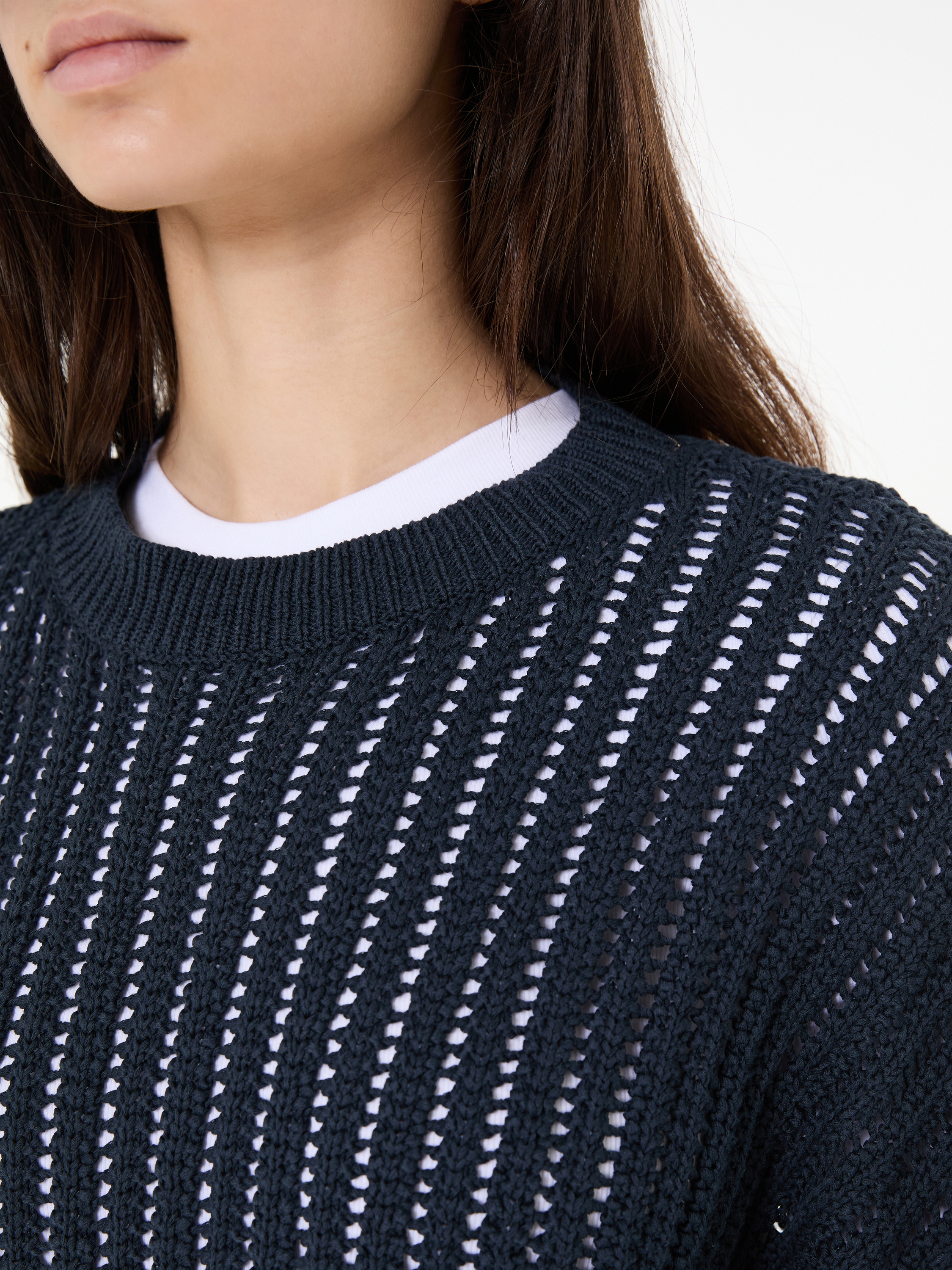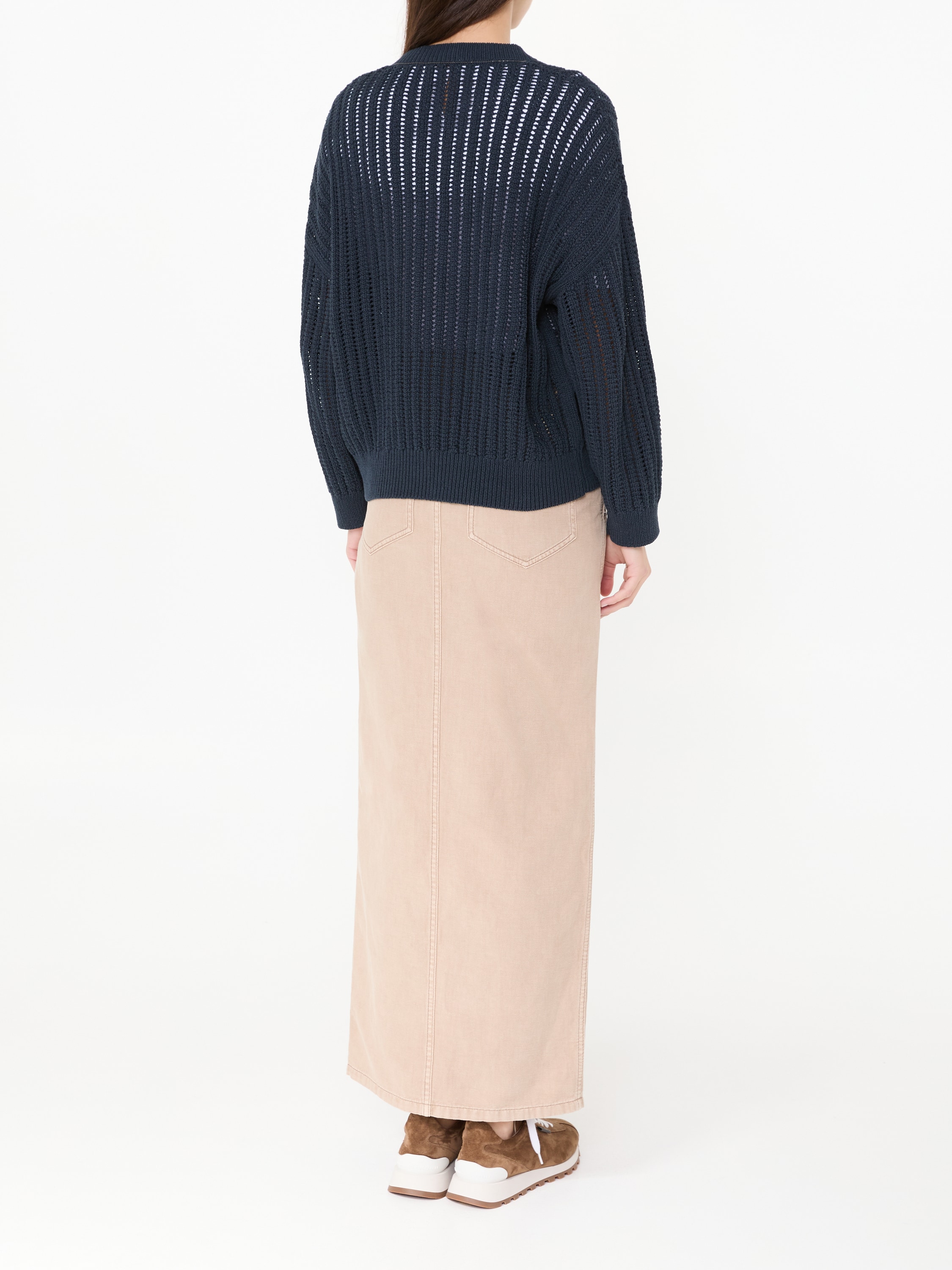 Dieser Pullover in Marineblau von Brunello Cucinelli wurde aus Baumwolle gefertigt und besticht durch ein lässiges Lochmuster. Der Rippstricksaum und die eingearbeiteten Pailletten vollenden dieses besondere Modell.