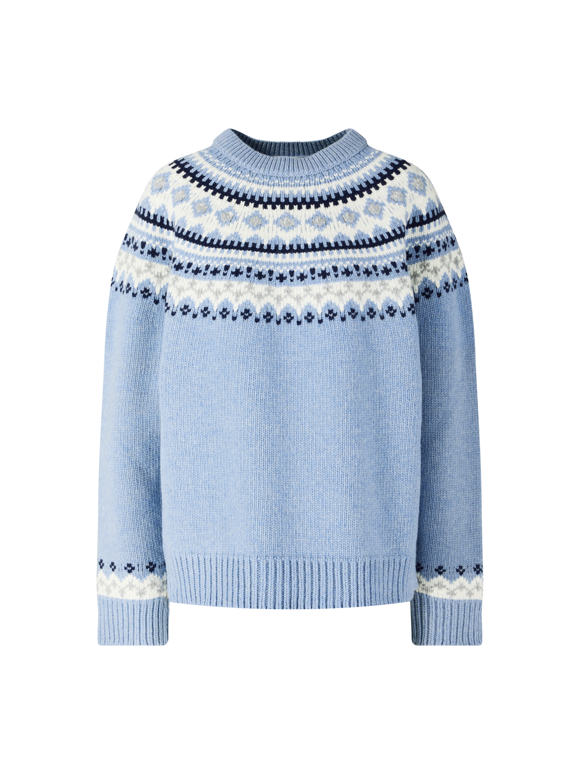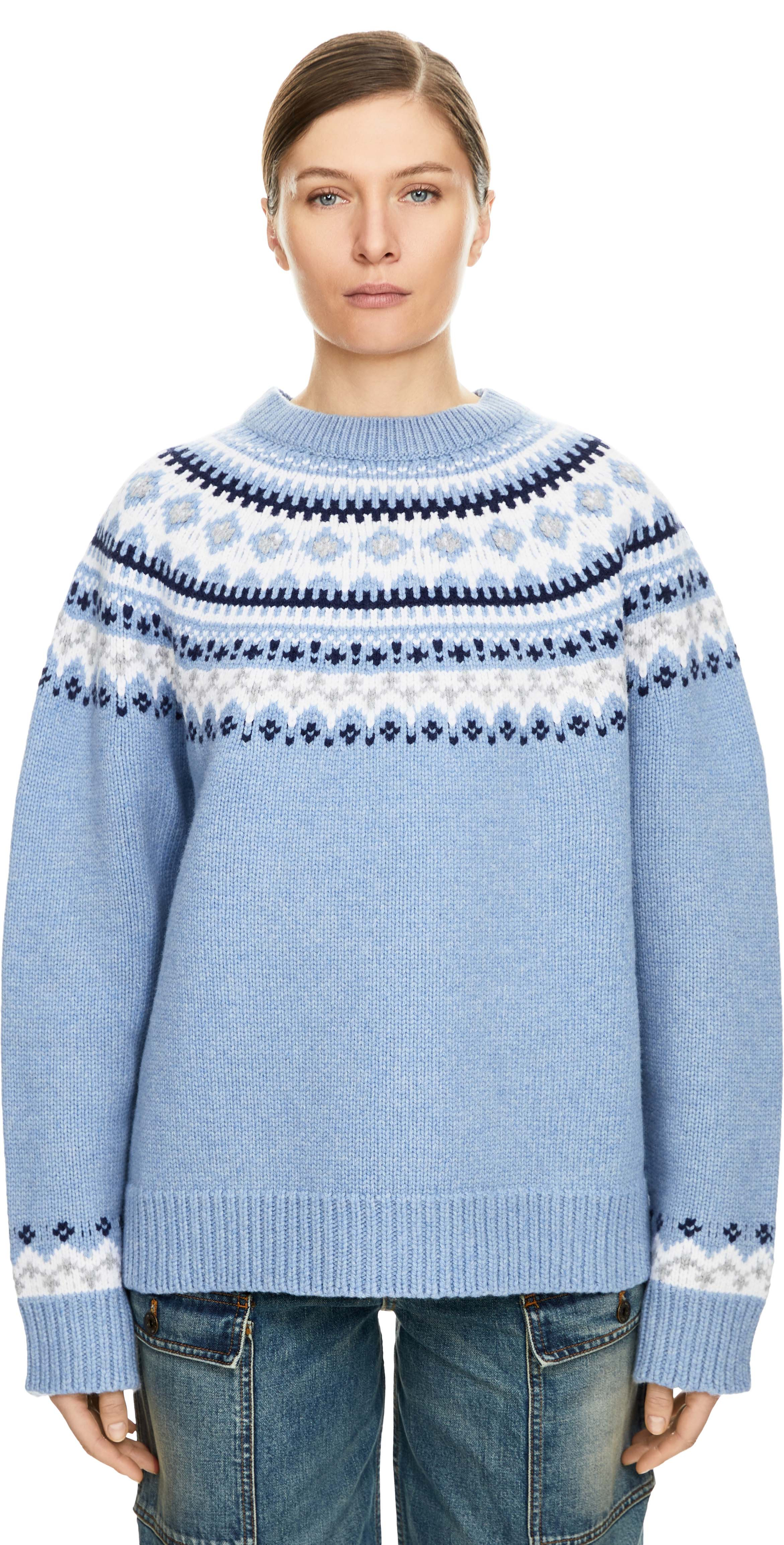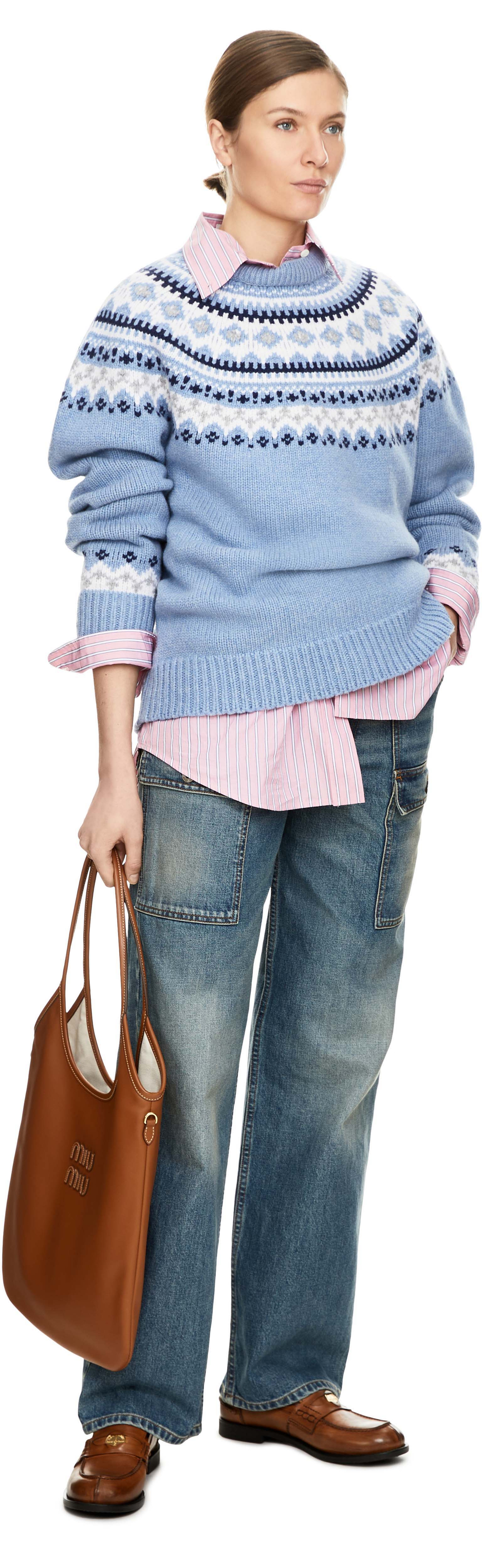 Dieser Pullover in Hellblau von miu miu wurde aus hochwertiger Wolle gefertigt und besticht durch die Oversize-Passform. Der Jacquard-Strick, der Rundhalsausschnitt, die Rippstrickbündchen, der gehäkelte Logo-Aufnäher auf der Rückseite sowie die weiche Haptik runden dieses hochwertige Design stilvoll ab.