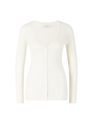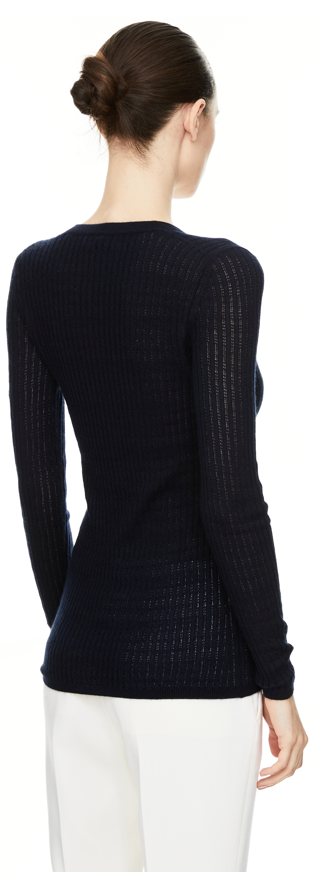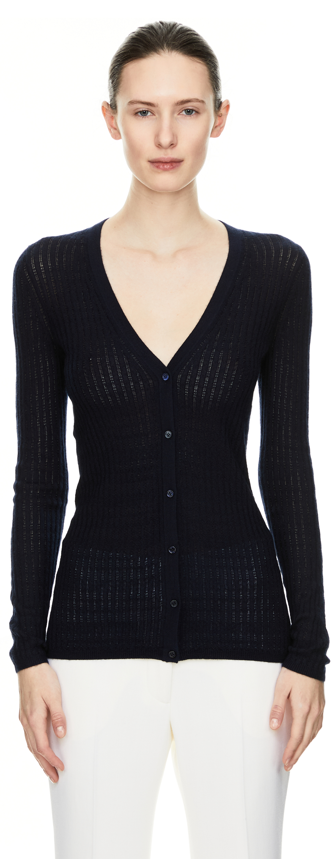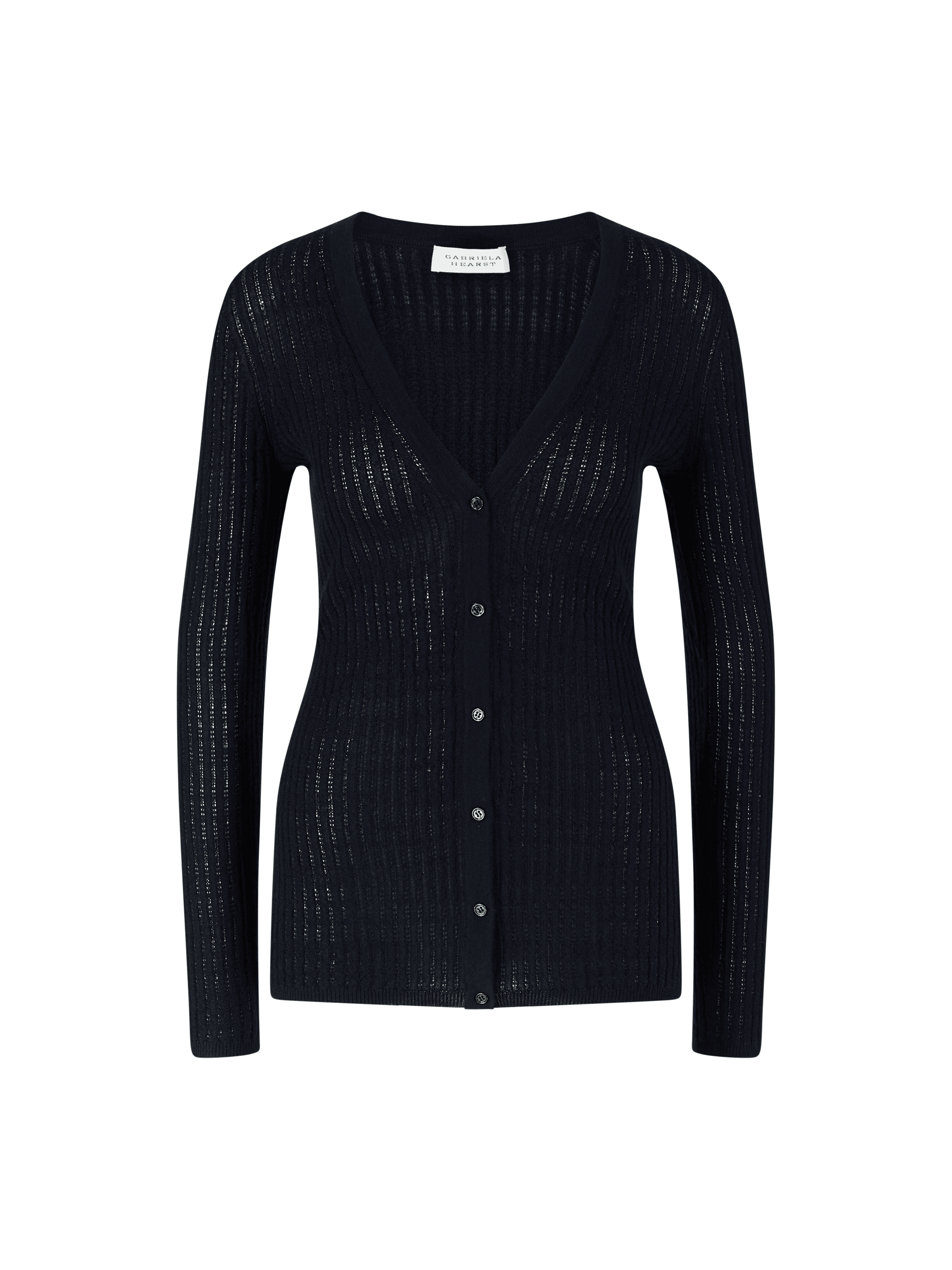 Die Strickjacke 'Emma' in Marineblau von Gabriela Hearst wurde aus einer weichen Cashmere-Seidenmischung gefertigt und besticht durch die feine Lochmusterung. Die längliche, figurbetonte Passform sowie der V-Ausschnitt sorgen für eine feminine Linienführung. Die semitransparente Optik und die tonale Knopfleiste unterstreichen die puristische Eleganz des Designs.