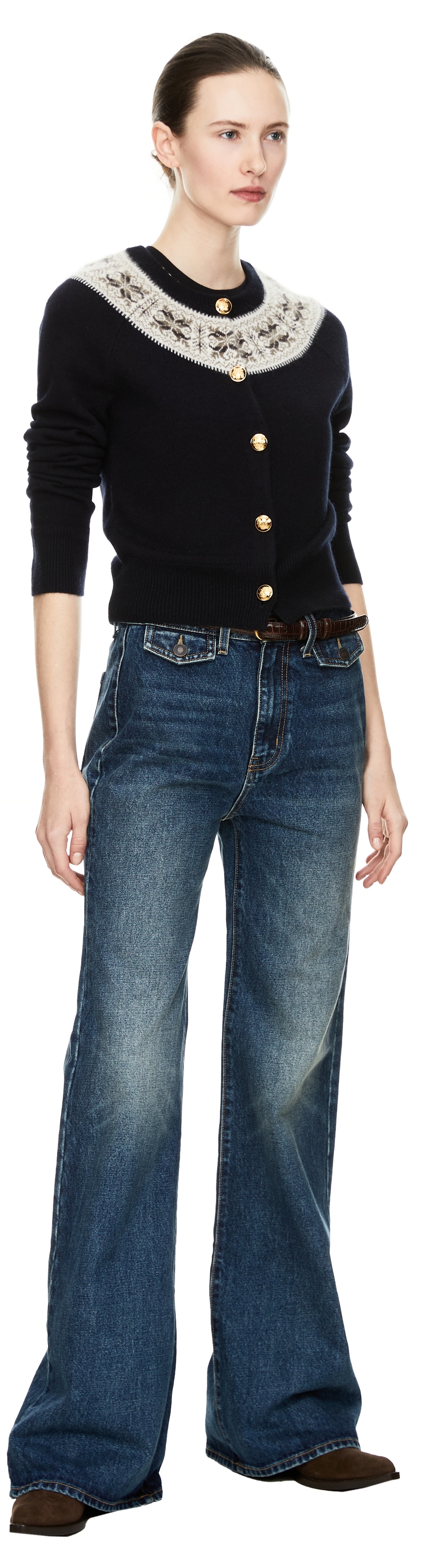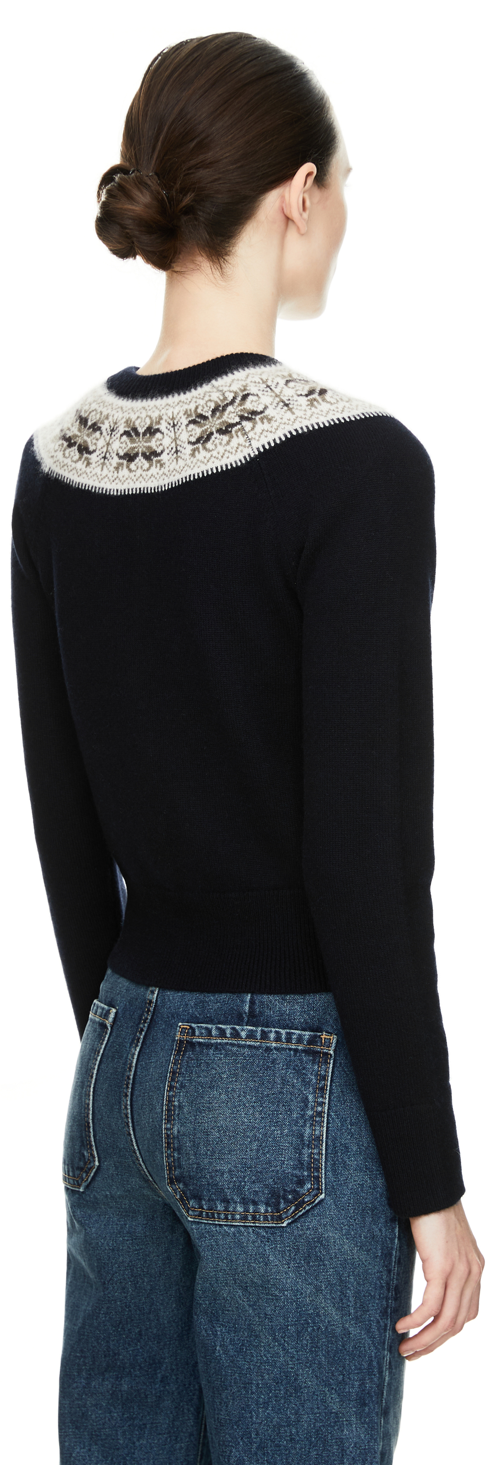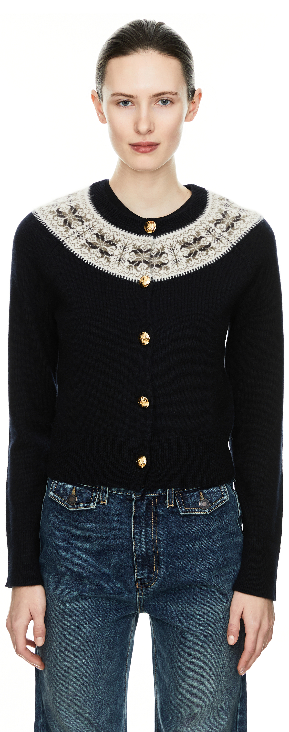 Die Strickjacke 'Josefa' in Marineblau von NILI LOTAN wurde aus hochwertigem Cashmere gefertigt und besticht durch das Jacquard-Fair-Isle-Muster. Die schmale Passform, die Raglanärmel, die Rippstrickbündchen an Ärmeln und Saum sowie die vordere Knopfleiste mit goldenen Wappenknöpfen zeichnen dieses hochwertige Modell aus.