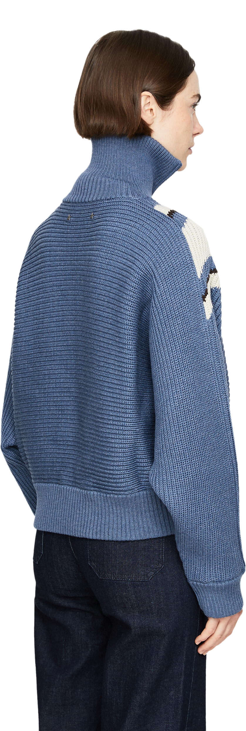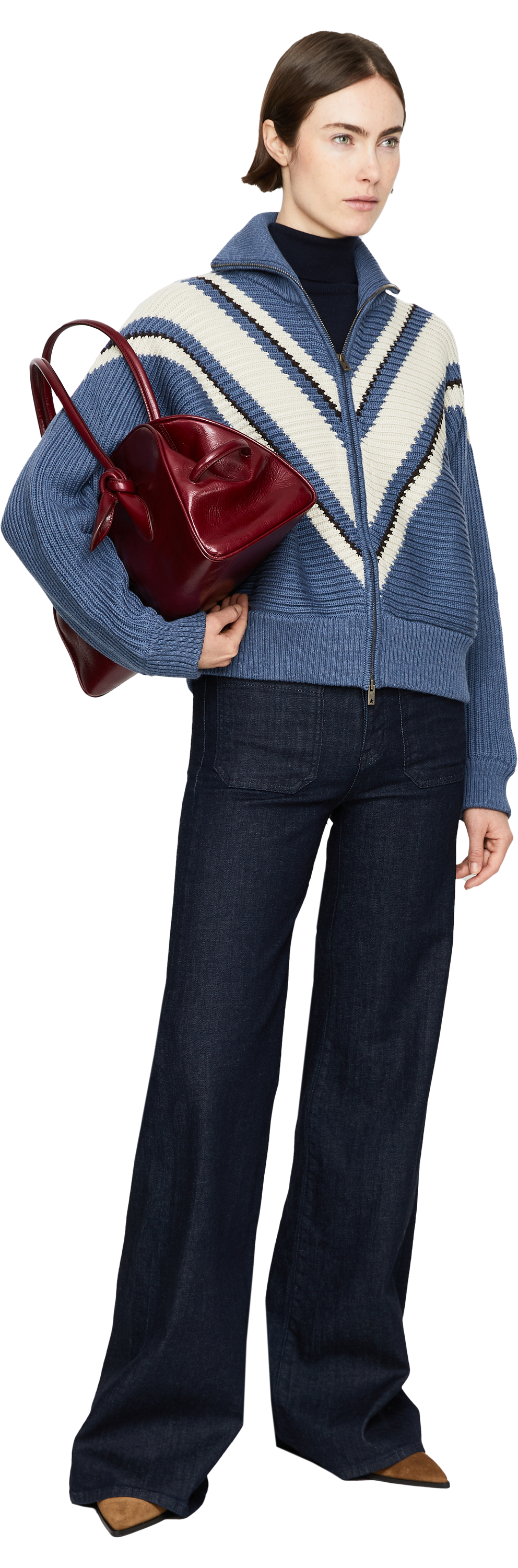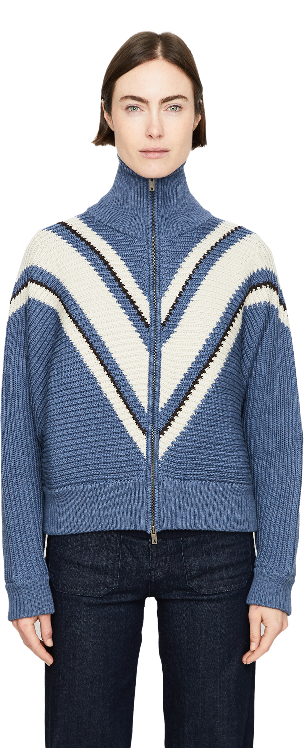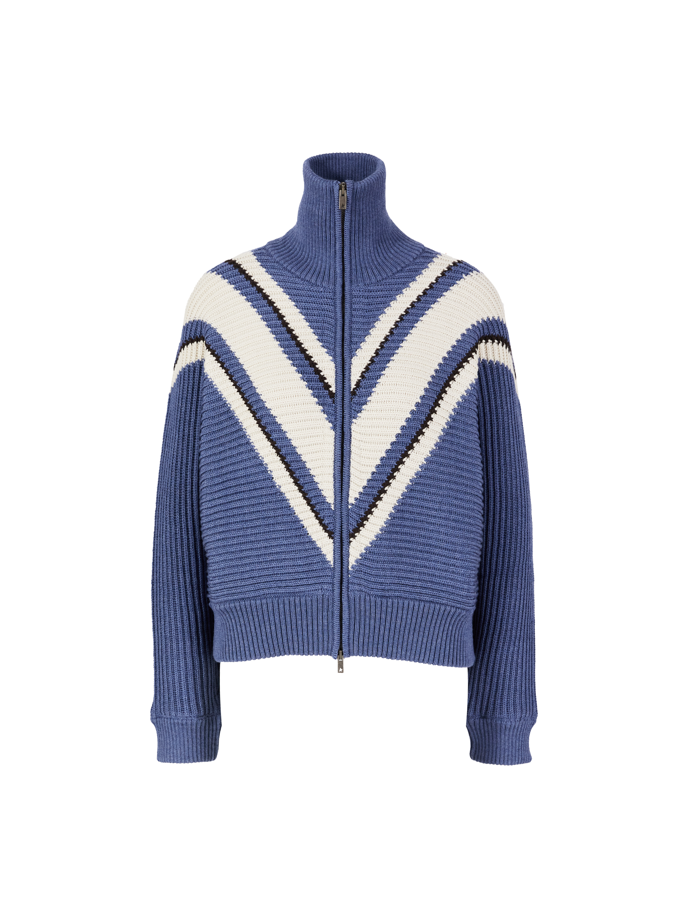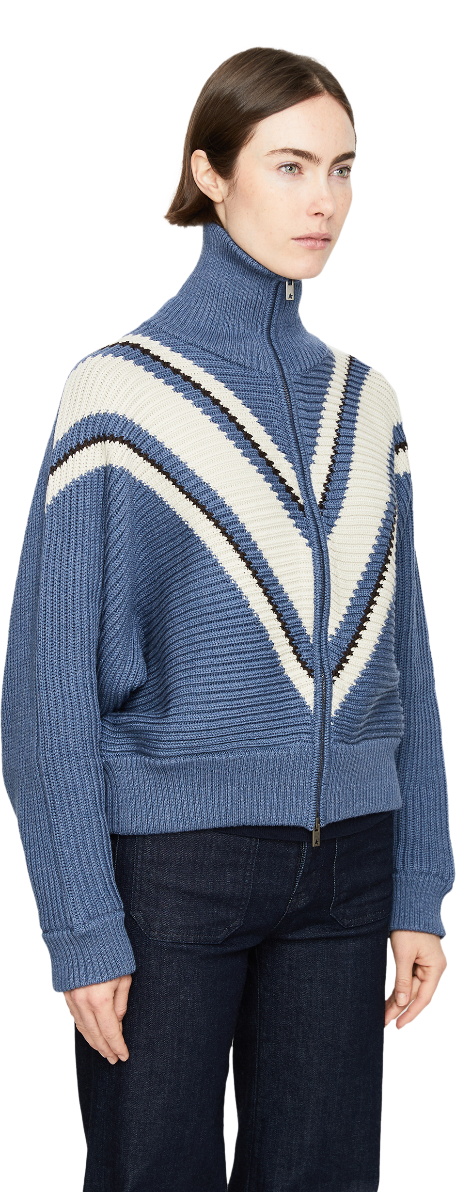 Die Strickjacke 'Odilia' in Blau von GOLDEN GOOSE wurde aus einer hochwertigen Schurwolle gefertigt und besticht durch die Chevron-Streifen auf der Vorderseite. Der Grobstrick, der Reißverschluss und der Stehkragen zeichnen das Design aus.