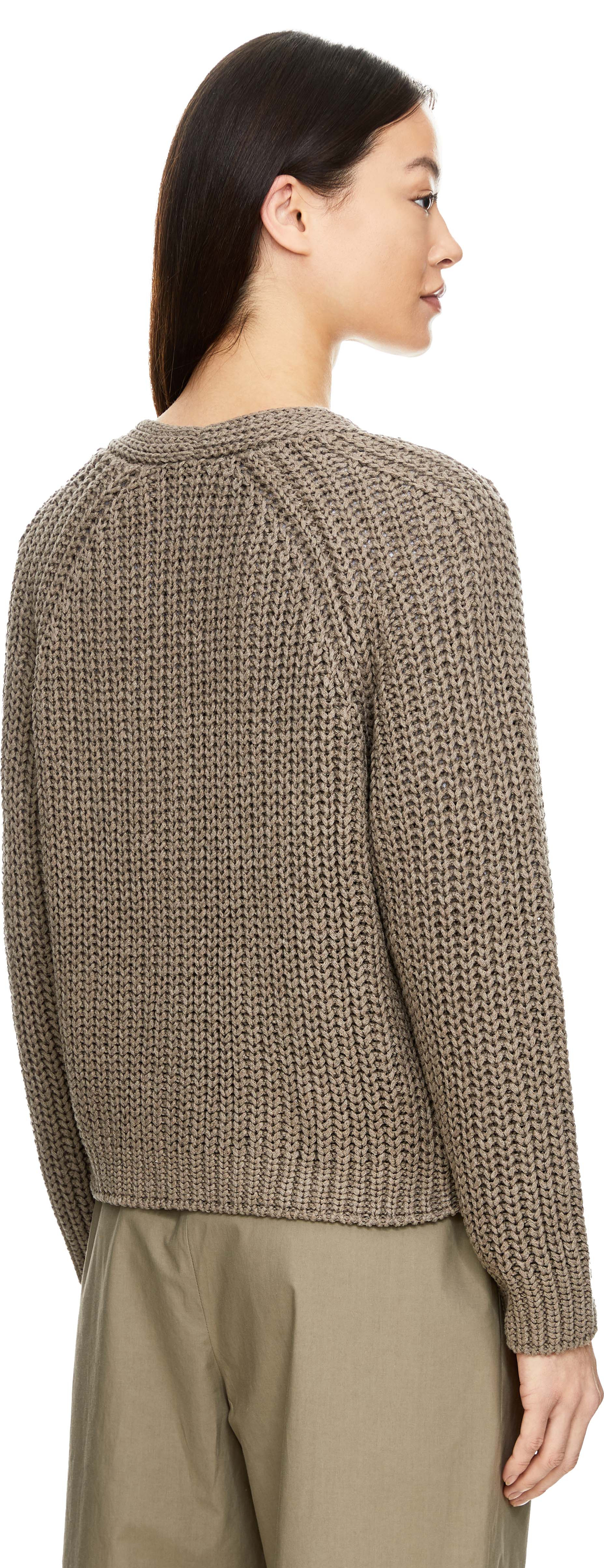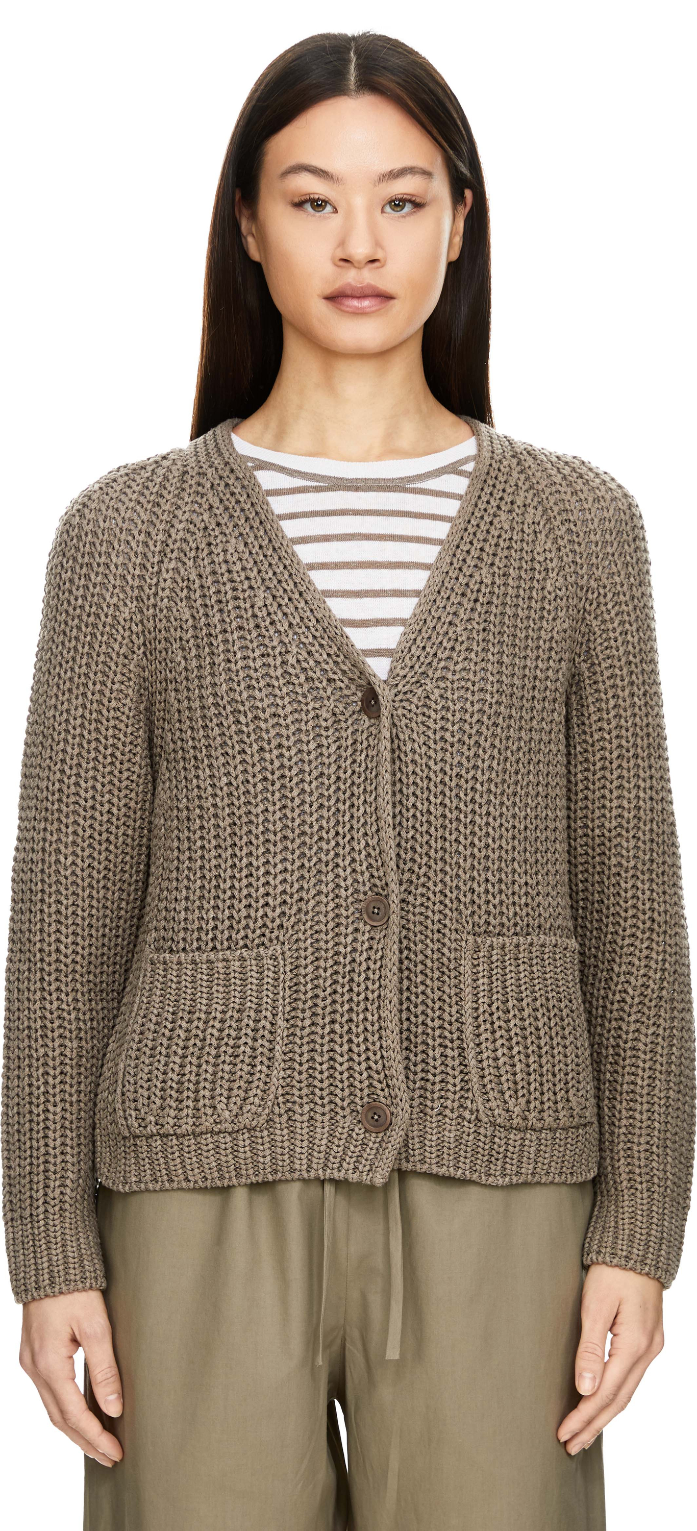 Die Strickjacke 'Aliva' in Taupe von Iris von Arnim wurde aus einer hochwertigen Seiden-Leinenmischung gefertigt und besticht durch die elegante Lochstruktur. Der V-Ausschnitt, die zwei aufgesetzten Taschen sowie die durchgehende Knopfleiste mit Logoprägung verleihen der Jacke einen stilvollen Charakter. Die weiche Haptik sorgt für ein besonders angenehmes Tragegefühl.