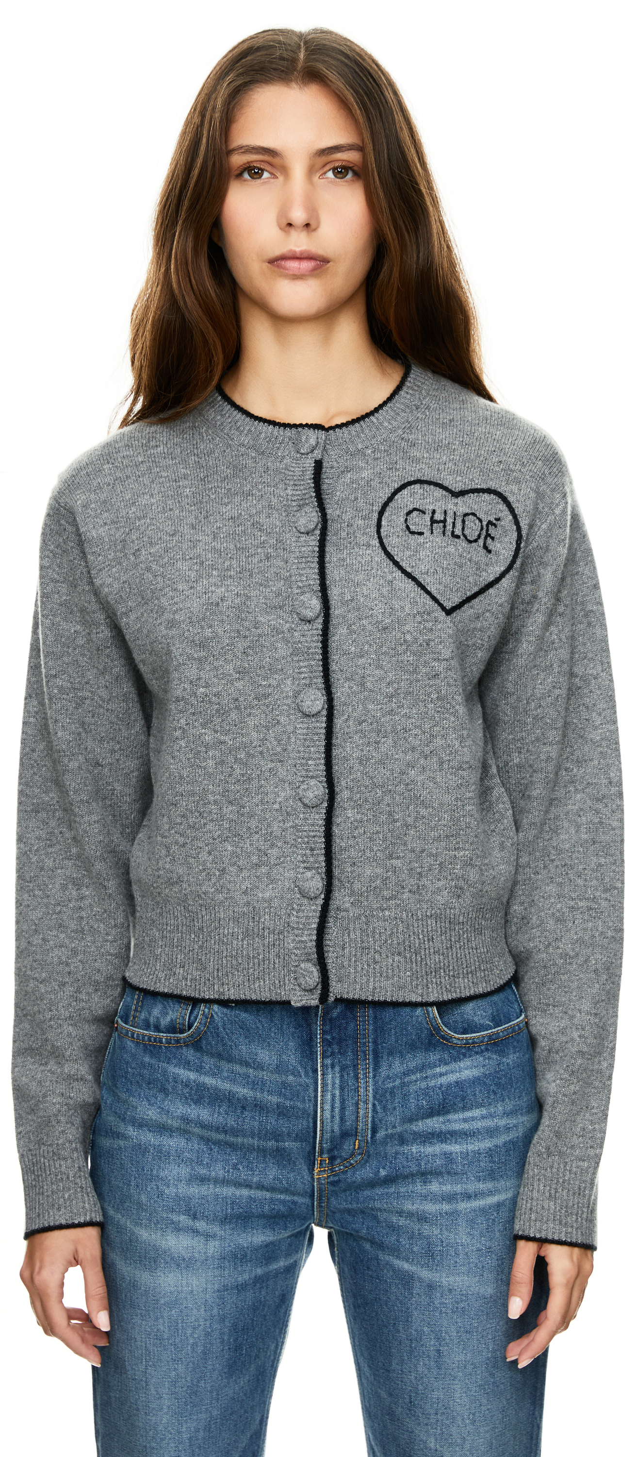Diese Strickjacke in Grau von Chloé wurde aus einer weichen Woll-Cashmere-Mischung gefertigt und besticht durch die verspielte Logo-Stickerei, die von einem Herz umrahmt wird. Die taillierte Silhouette und die kontrastierenden Kanten verleihen dem Modell eine feminine Note. Die stoffbezogenen Knöpfe und klassischen Rippstrickbündchen runden das Design stilvoll ab.