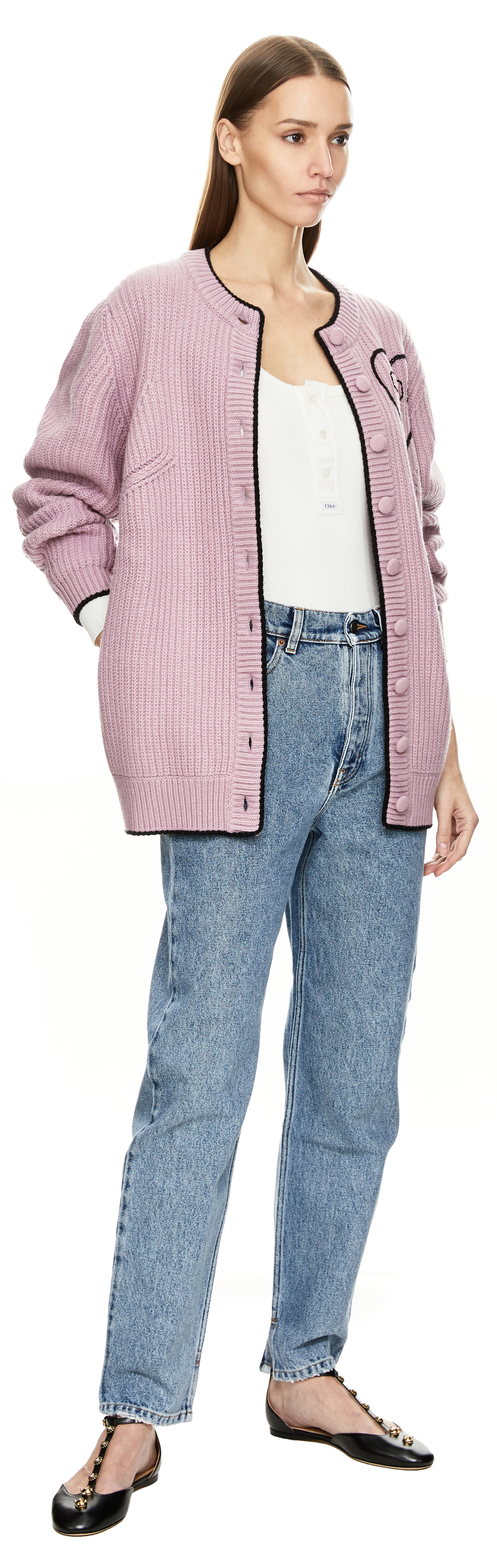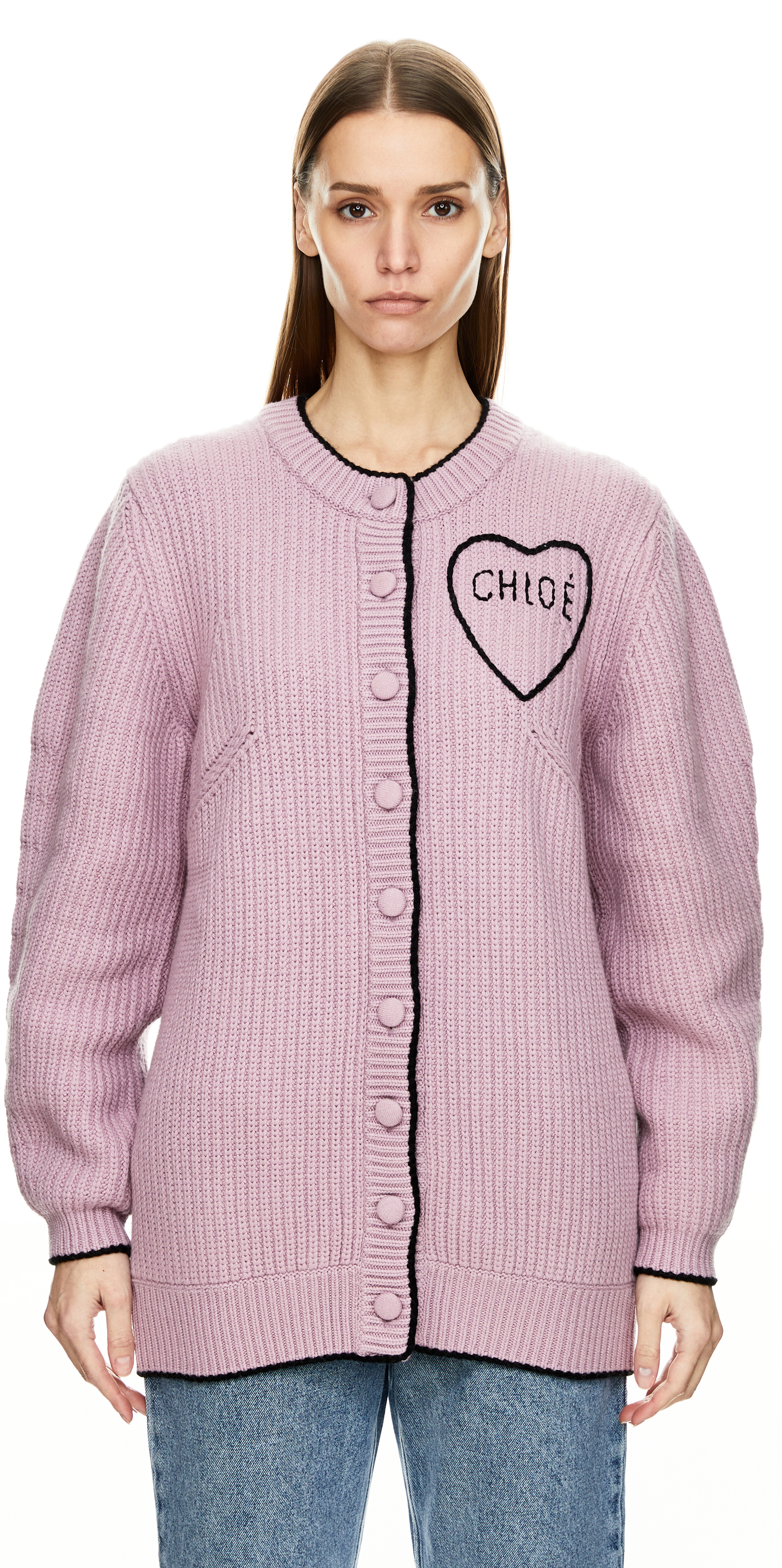 Diese Strickjacke in Violett von Chloé wurde aus einer Woll-Cashmere-Mischung gefertigt und besticht durch die lange Silhouette. Der Rippstrick, der Rundhalsausschnitt, die stoffbezogenen Knöpfe sowie die Chloé-Logo-Stickerei in einem Herz zeichnen dieses hochwertige Modell aus.