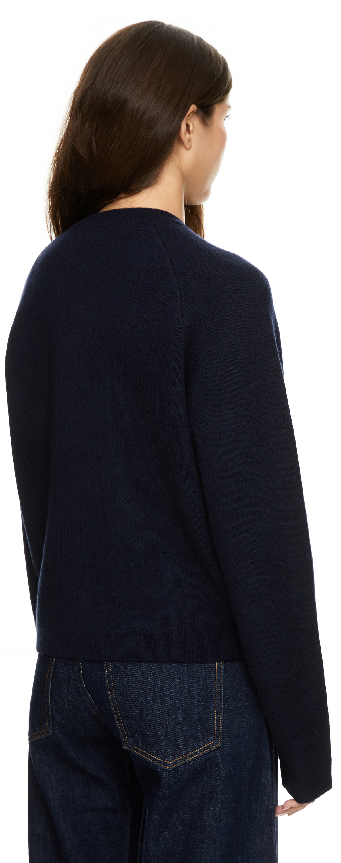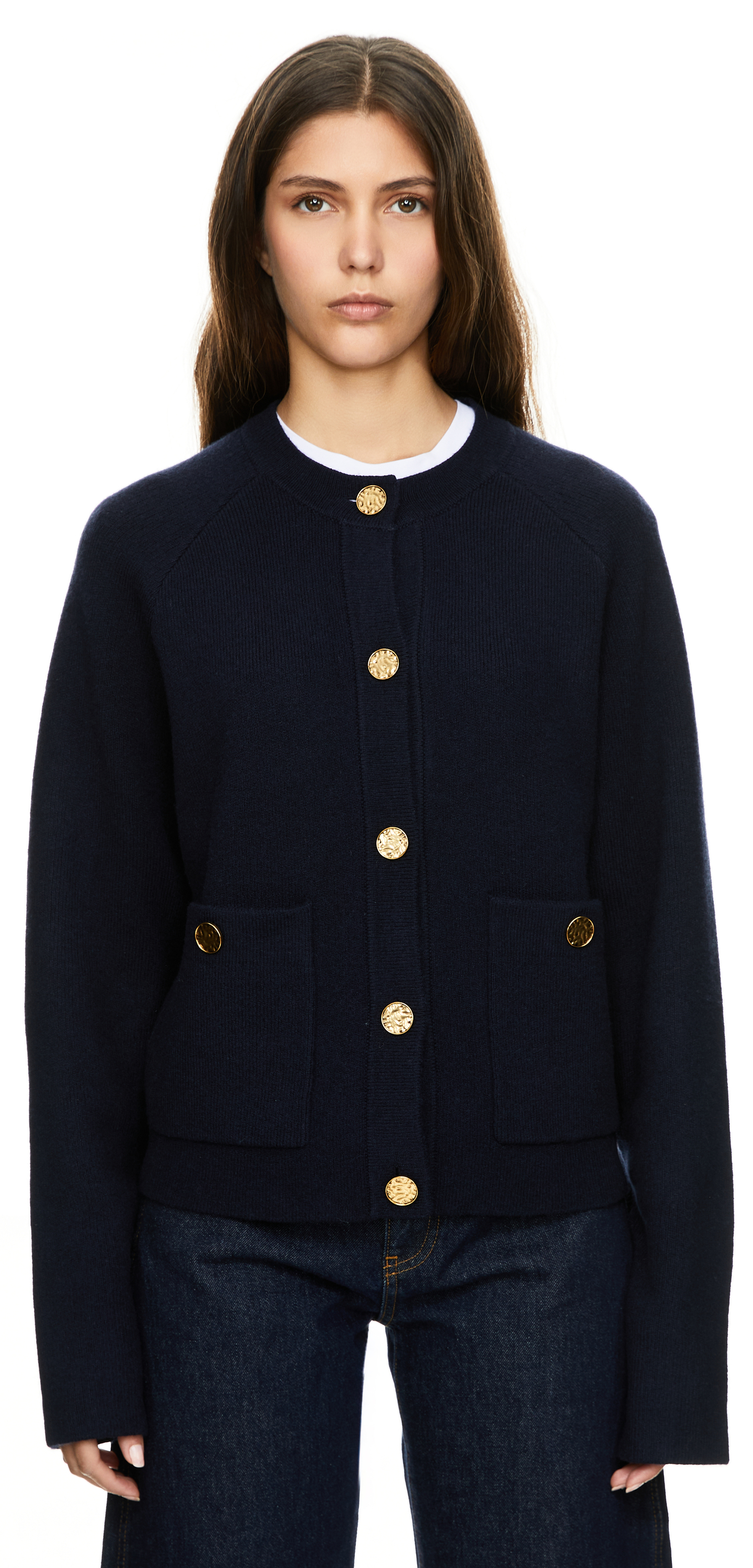 Diese Strickjacke in Marineblau von TOTEME wurde aus einer weichen Wollmischung gefertigt und besticht durch die gehämmerten Ösenknöpfe. Die gerade Silhouette und die Raglanärmel verleihen dem Modell eine moderne Lässigkeit. Die aufgesetzten Taschen auf der Vorderseite runden das Design harmonisch ab.