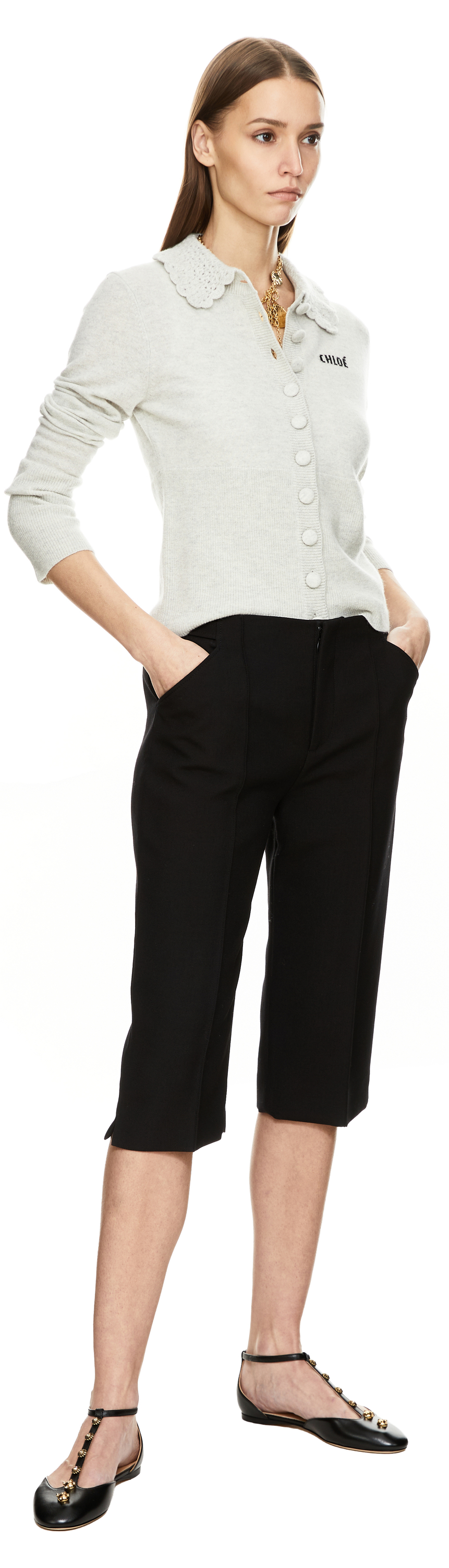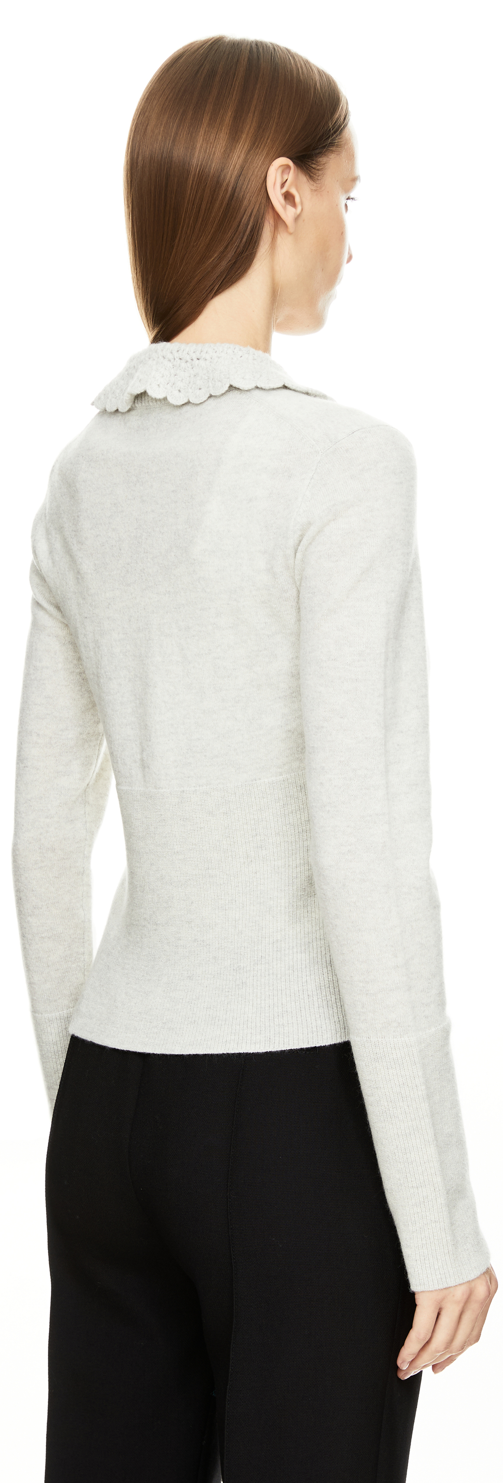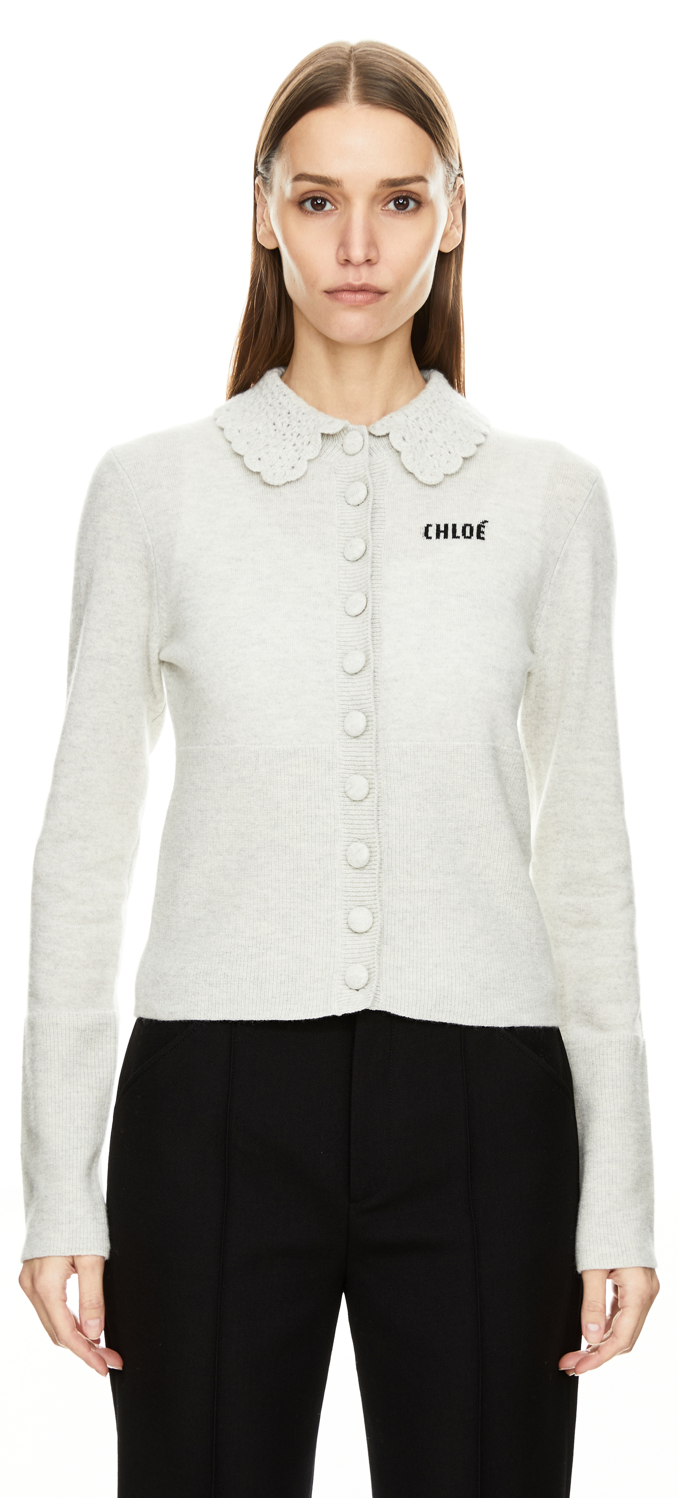 Diese Strickjacke in Grau von Chloé wurde aus reiner Schurwolle gefertigt und besticht durch die körperbetonte Passform. Die unterschiedlichen Strickmuster, der Guipure-Kragen sowie die Chloé-Logo-Stickerei auf der Brust verleihen diesem hochwertigen Modell besonderen Charakter.