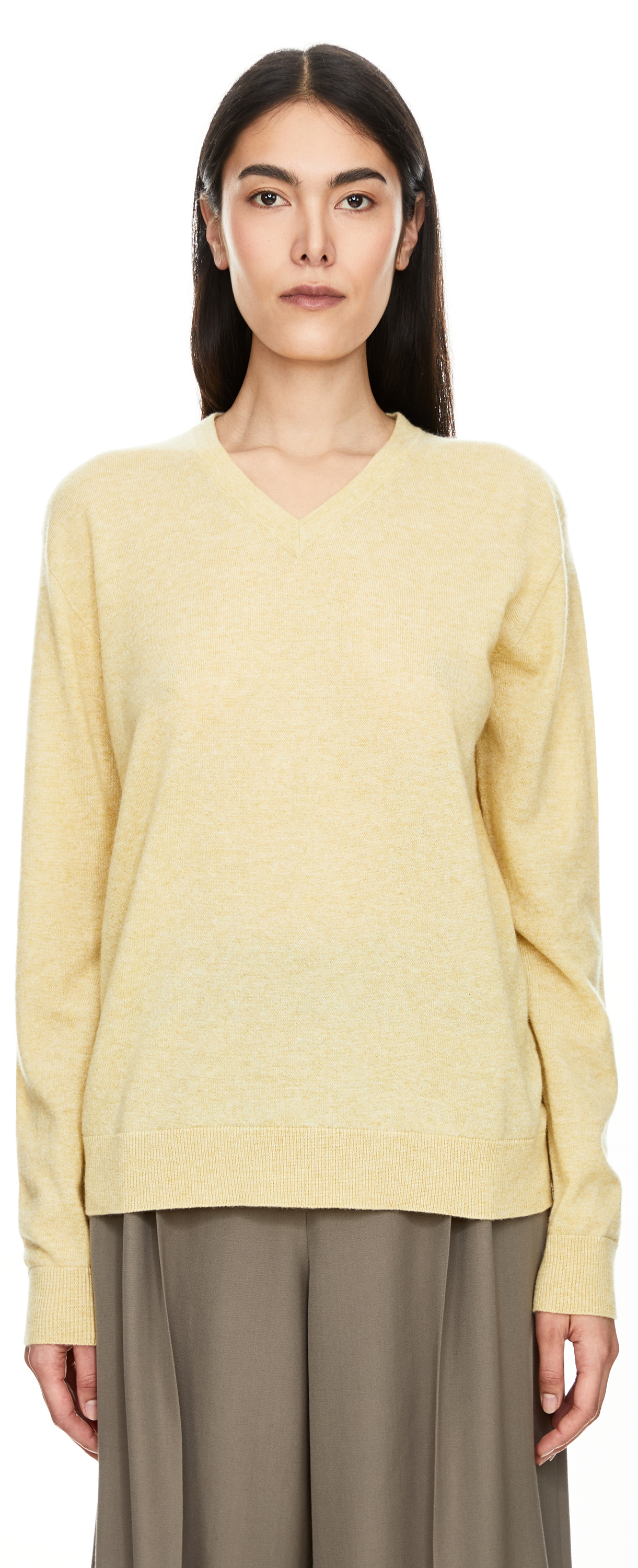Der Pullover 'Nian' in Gelb von The Row wurde aus feinem schottischem Cashmere gefertigt und besticht durch den kastenförmigen Schnitt. Die langen Ärmel, der V-Ausschnitt sowie der gerippte Ausschnitt, die Bündchen und der Saum prägen das Design. Mit seinem atmungsaktiven Finish bietet das ultraleichte Strickmaterial natürliche Wärme und ist zu jeder Jahreszeit tragbar.