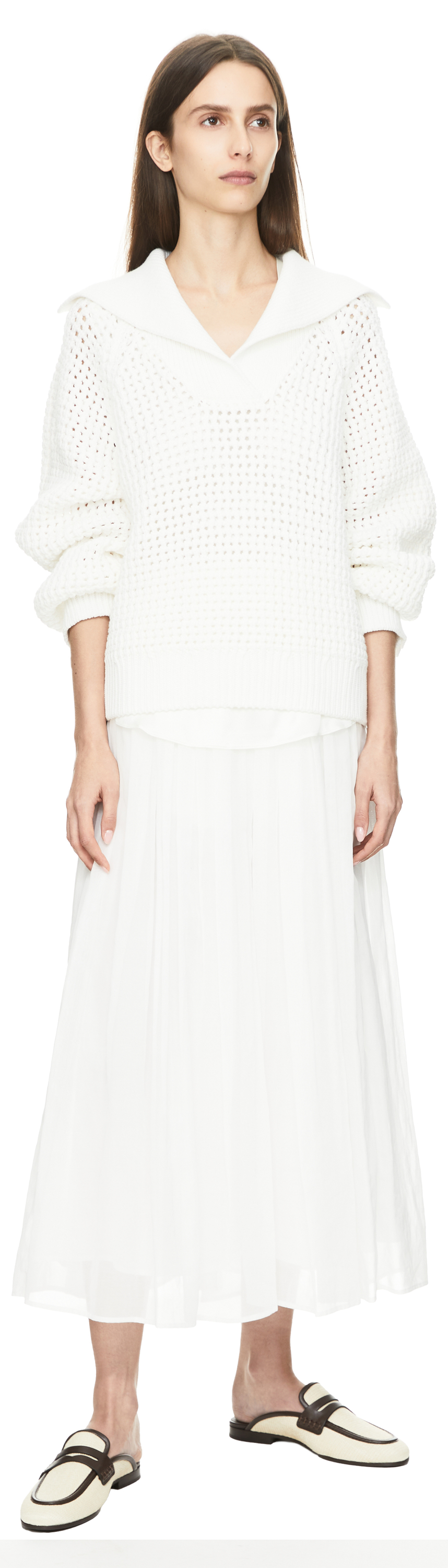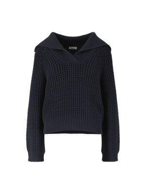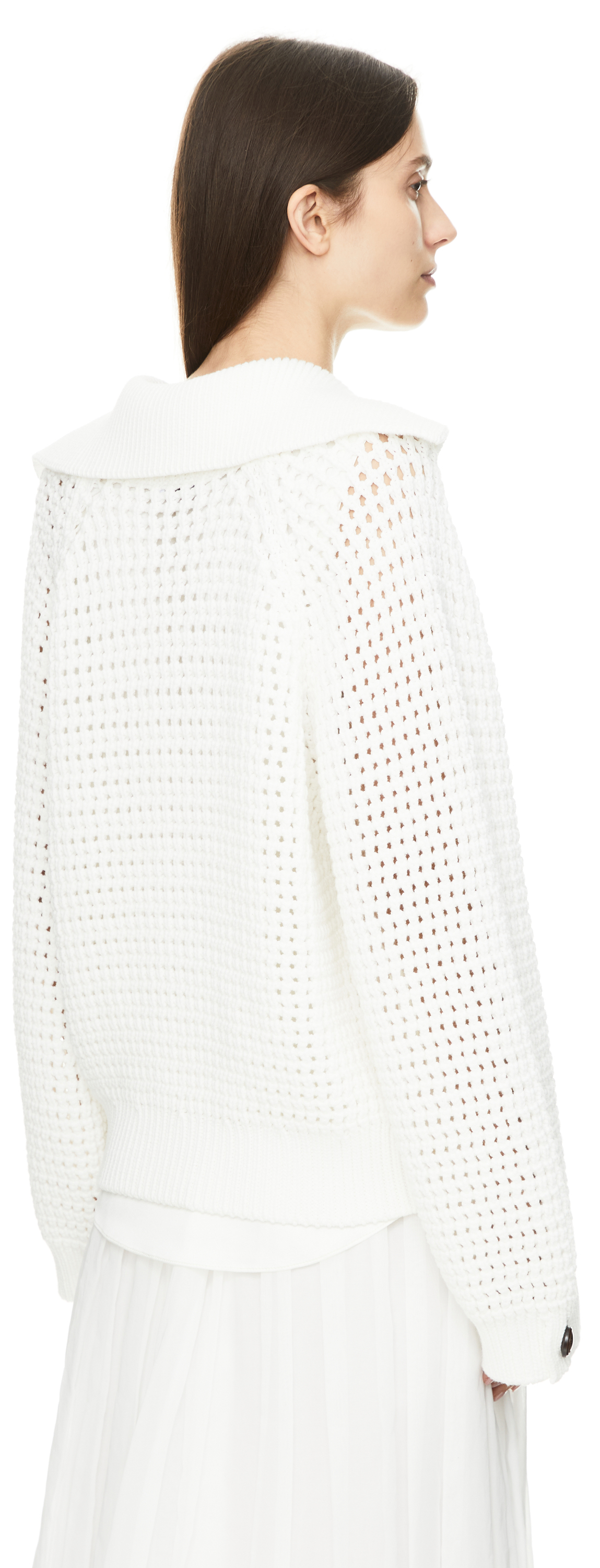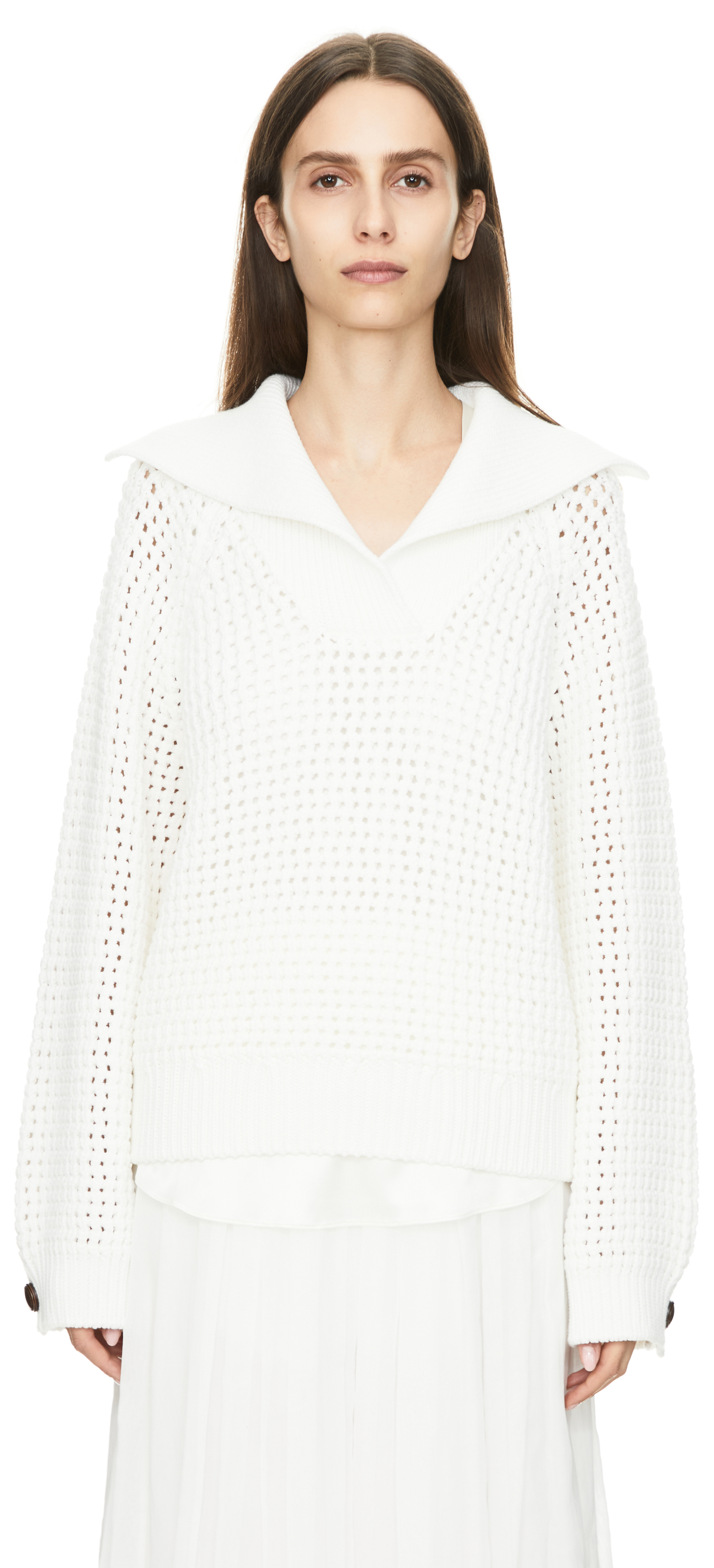 Dieser Strickpullover in Crème von Brunello Cucinelli wurde aus einer weichen Baumwollmischung gefertigt und besticht durch die raffinierte Ajour-Lochmusterung. Die oversized Passform und der V-Ausschnitt verleihen dem Modell eine moderne Silhouette. Die Ein-Knopf-Manschetten mit geprägtem Logo setzen dezente Akzente und runden das Design stilvoll ab.