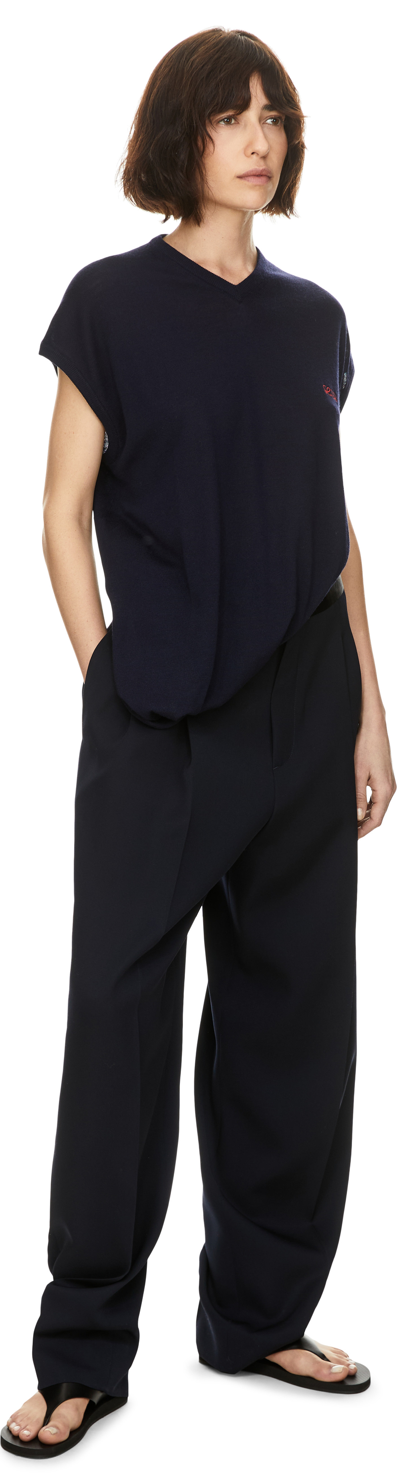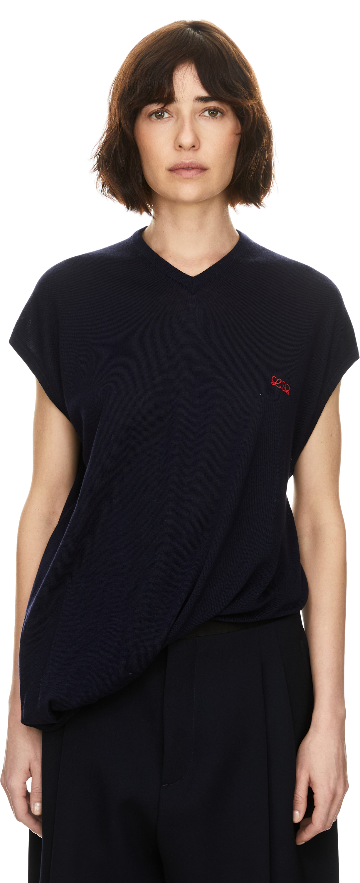 Der Pullover 'Draped' in Marineblau von LOEWE wurde aus leichter Wolle gefertigt und besticht durch die entspannte Passform. Die asymmetrische Silhouette mit gedrehter, drapierter Konstruktion, der V-Ausschnitt sowie die Doppel-L-Stickerei auf der Brust setzen besondere Akzente.