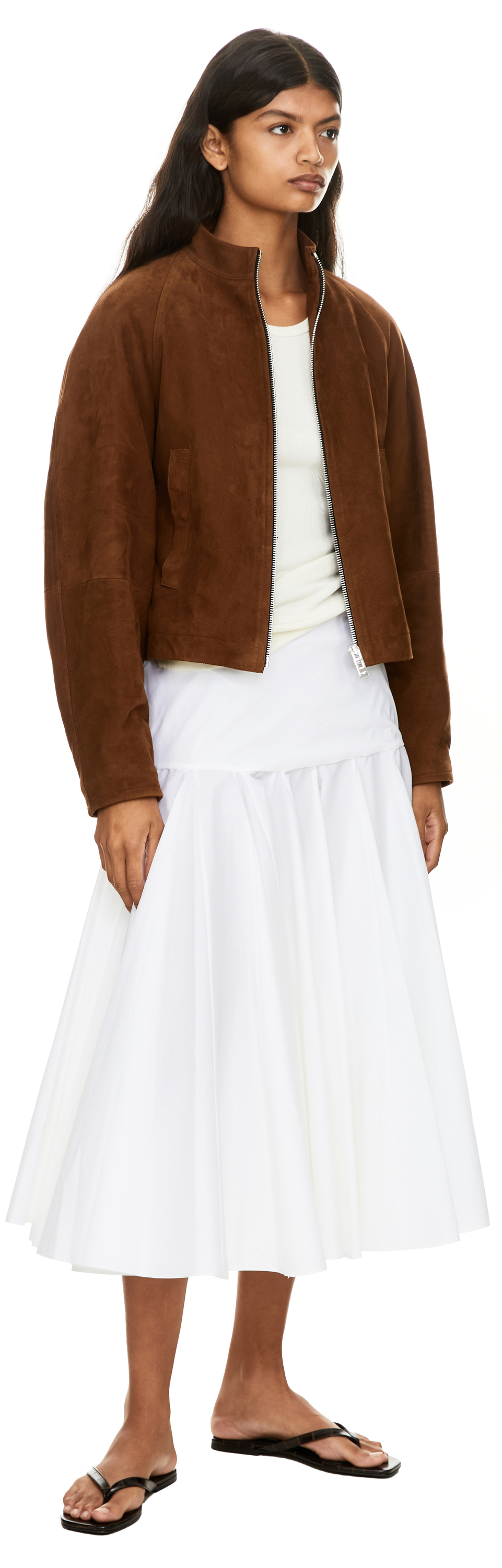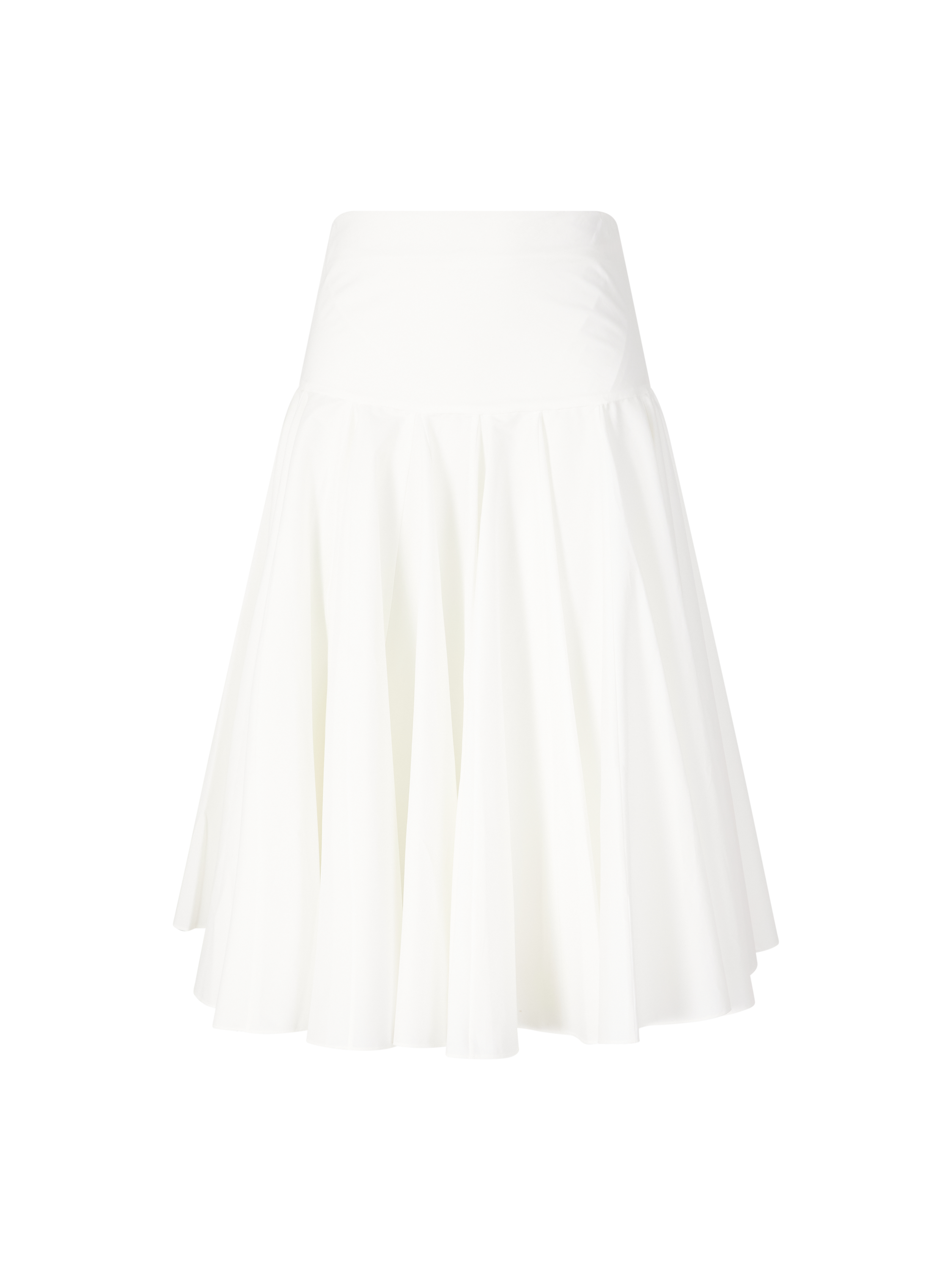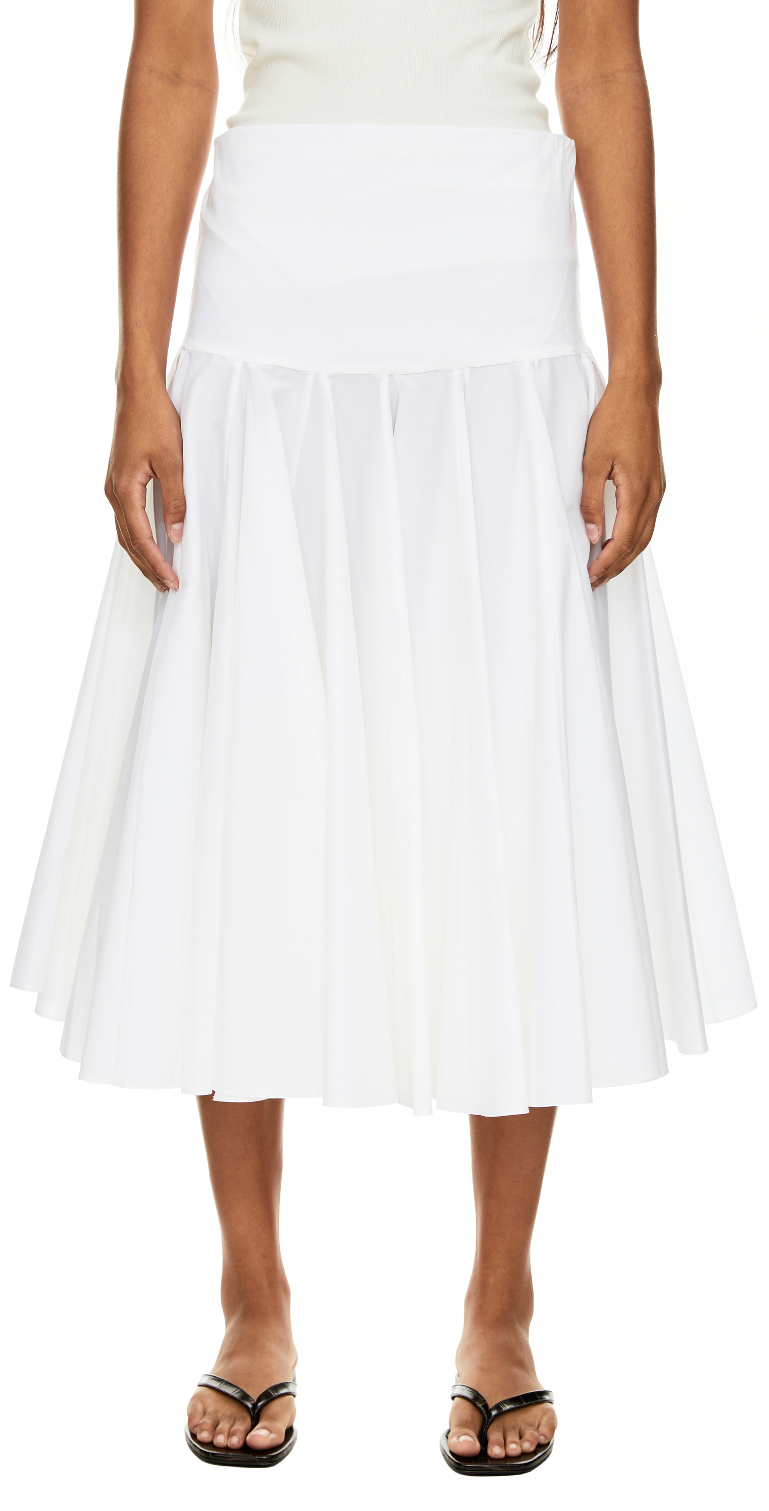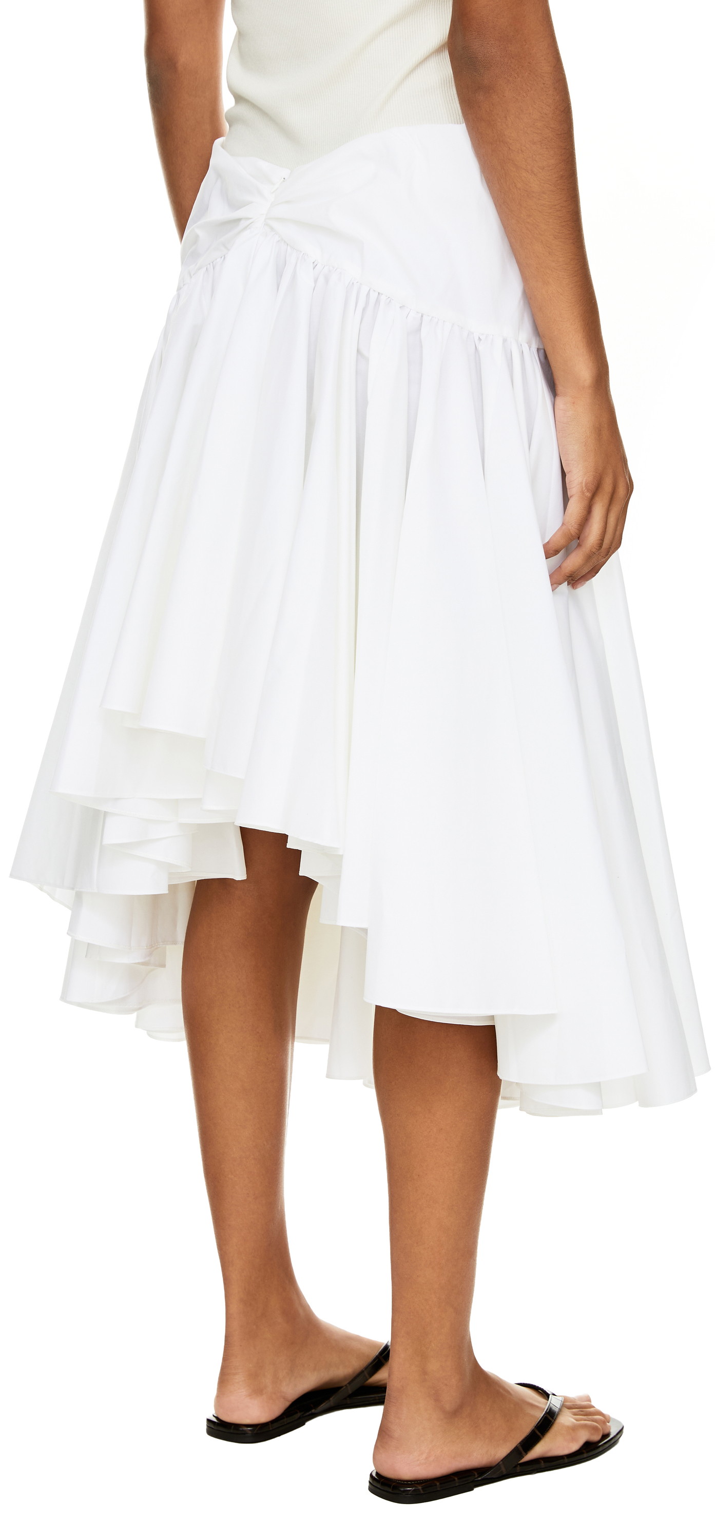 Der Rock 'Le Jupon' in Weiß von JACQUEMUS wurde aus einer Baumwollmischung gefertigt und besticht durch den drapierten Bund. Die hohe Leibhöhe, der ab der Hüfte ausgestellte Schnitt mit Godets, der hintere Hakenverschluss sowie der fließende hintere Rocksaum verleihen dem Modell einen stilvollen, eleganten Charakter.
