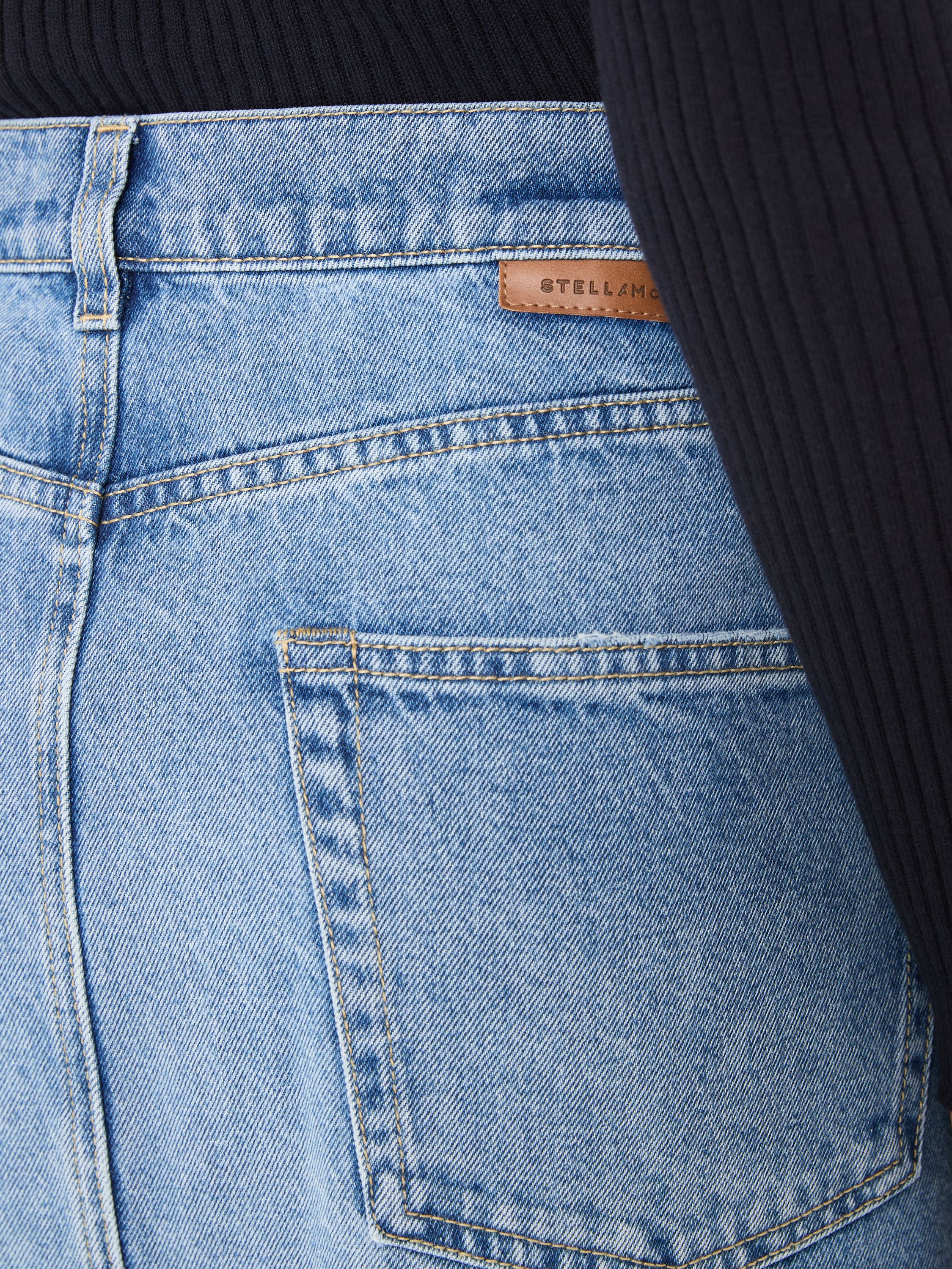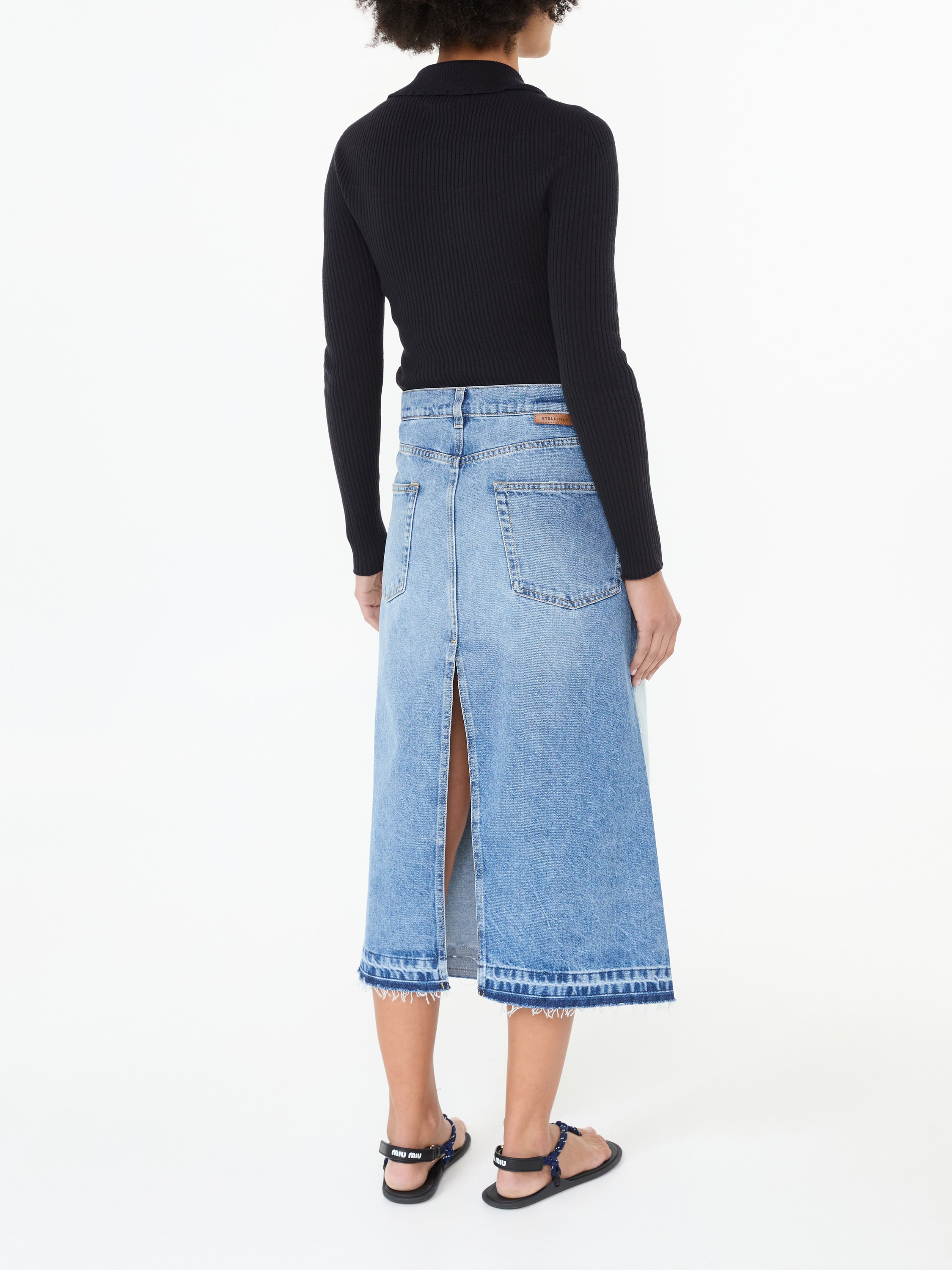 Dieser Rock in Blau von Stella McCartney wurde aus reiner hochwertigen Baumwolle gefertigt und besticht durch einen Schlitz auf der Vorder- und Rückseite. Die Kombination aus dunklen und hellen Einsätzen zeichnet dieses Modell aus. Die hohe Leibhöhe, die Kontrastnähte und die silberfarbende Hardware runden das Design stilvoll ab.