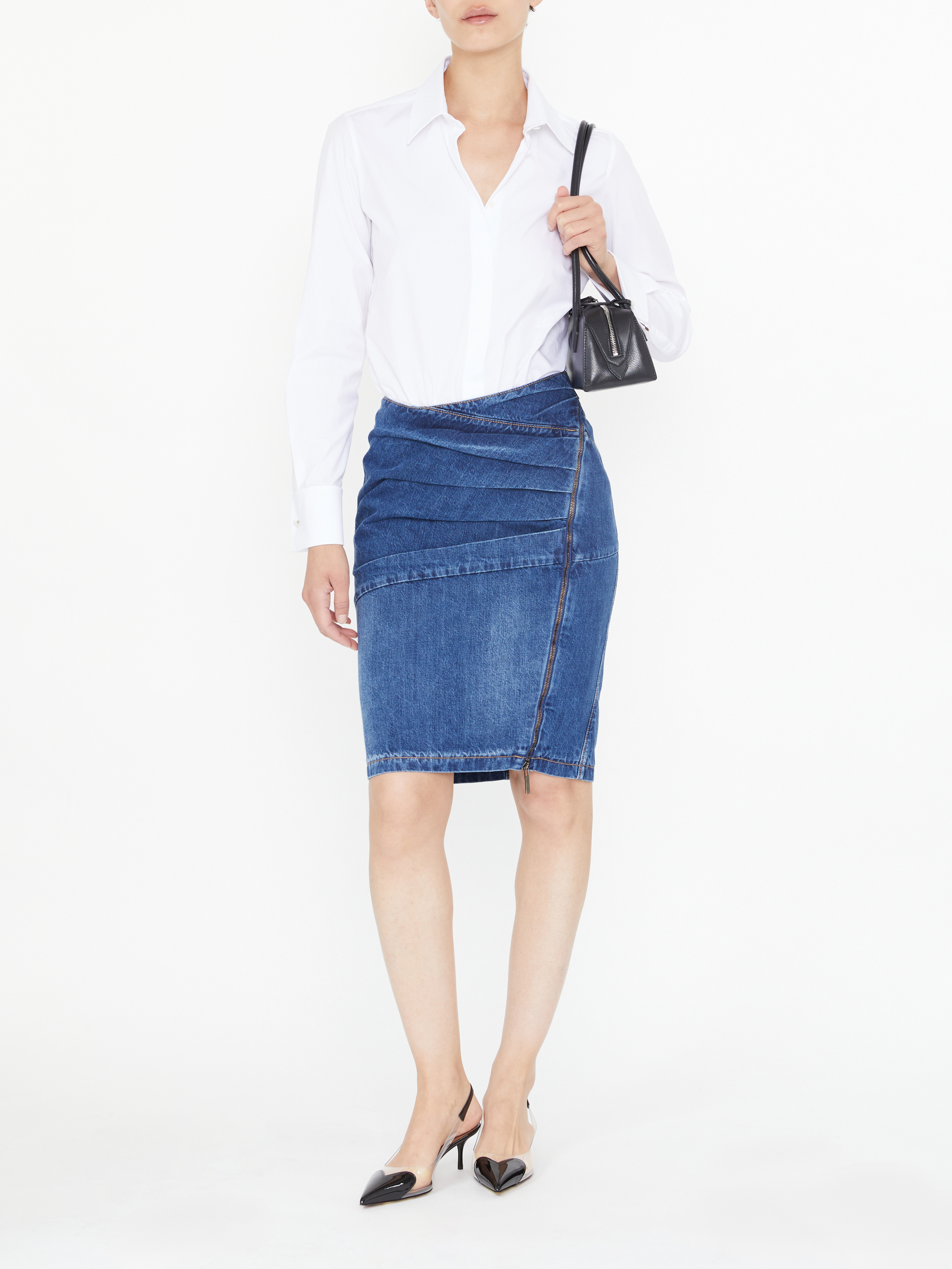 Dieser Jeansrock in Mittelblau von NENSI DOJAKA wurde aus einer festen Baumwolle gefertigt und besticht durch den asymmetrischen Schnitt. Die Knielänge, der Reißverschluss und die Kontrastnähte vollenden dieses hochwertige Design.