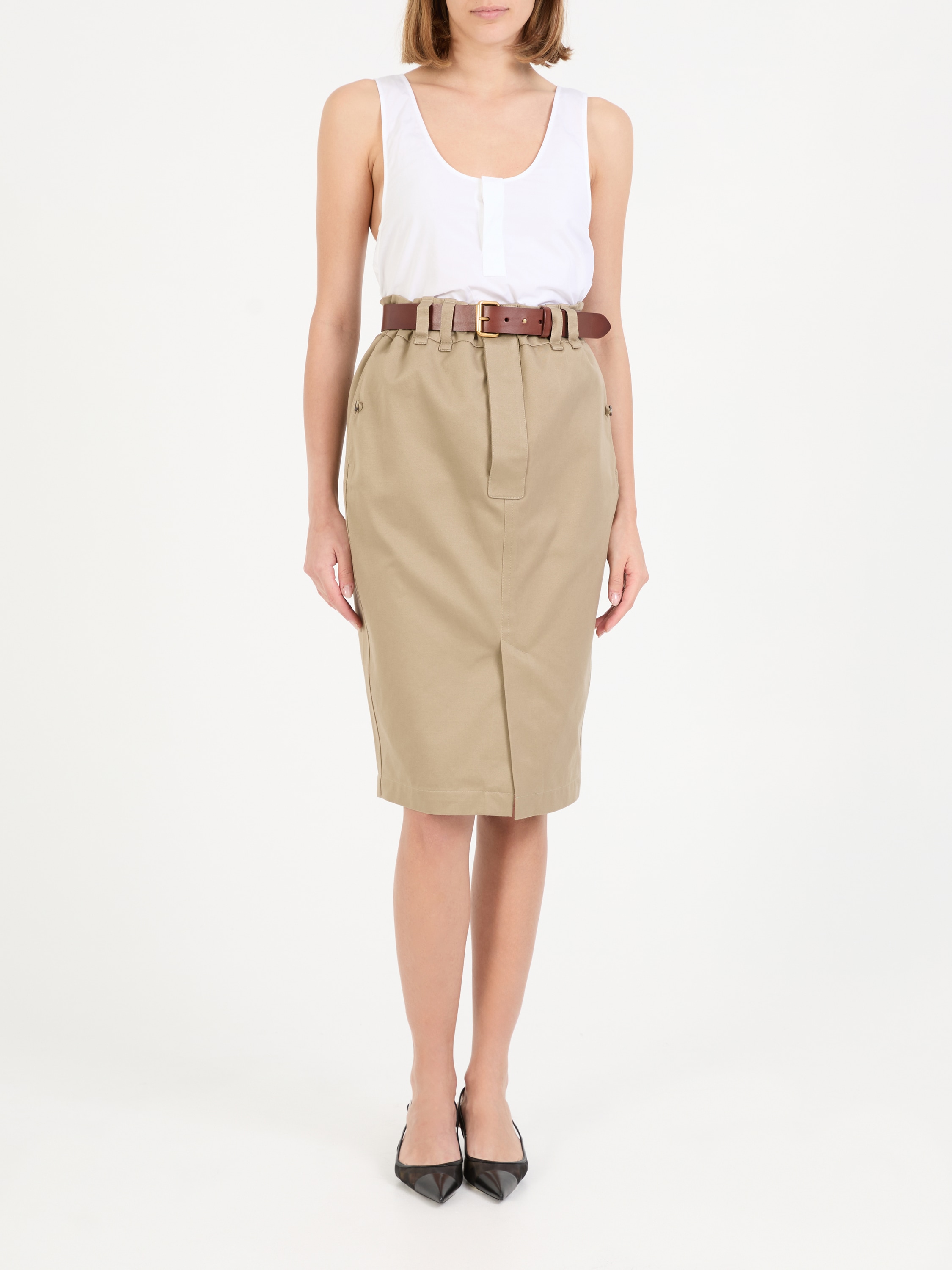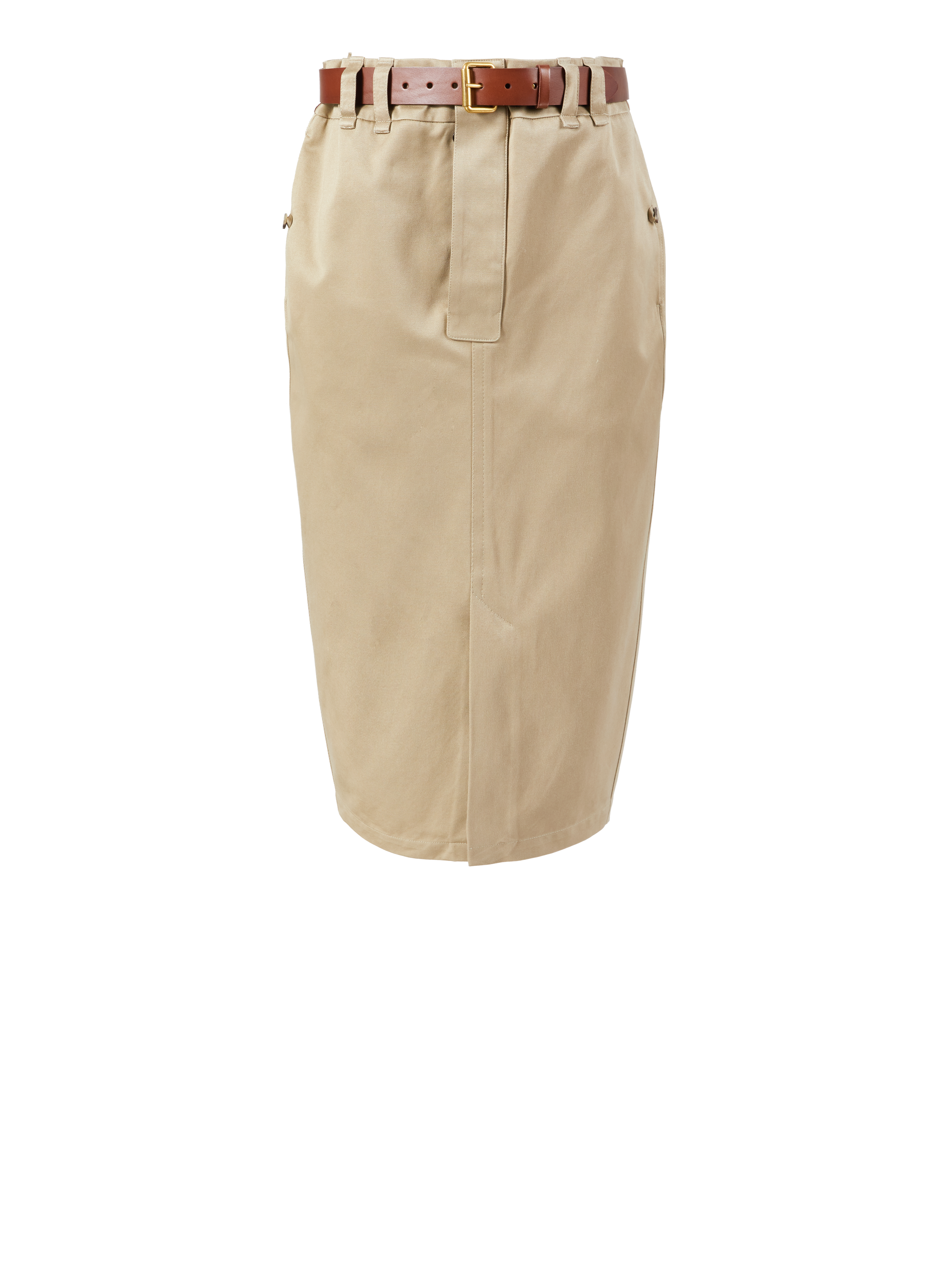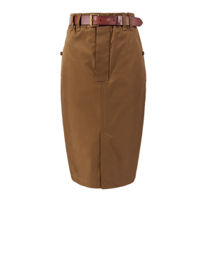 Dieser Bleistiftrock in Beige von Saint Laurent wurde aus einem hochwertigen Baumwoll-Twill gefertigt und besticht durch die Midilänge. Der Frontschlitz, der Gürtel und die doppelten Gürtelschlaufen vollenden dieses Modell.
