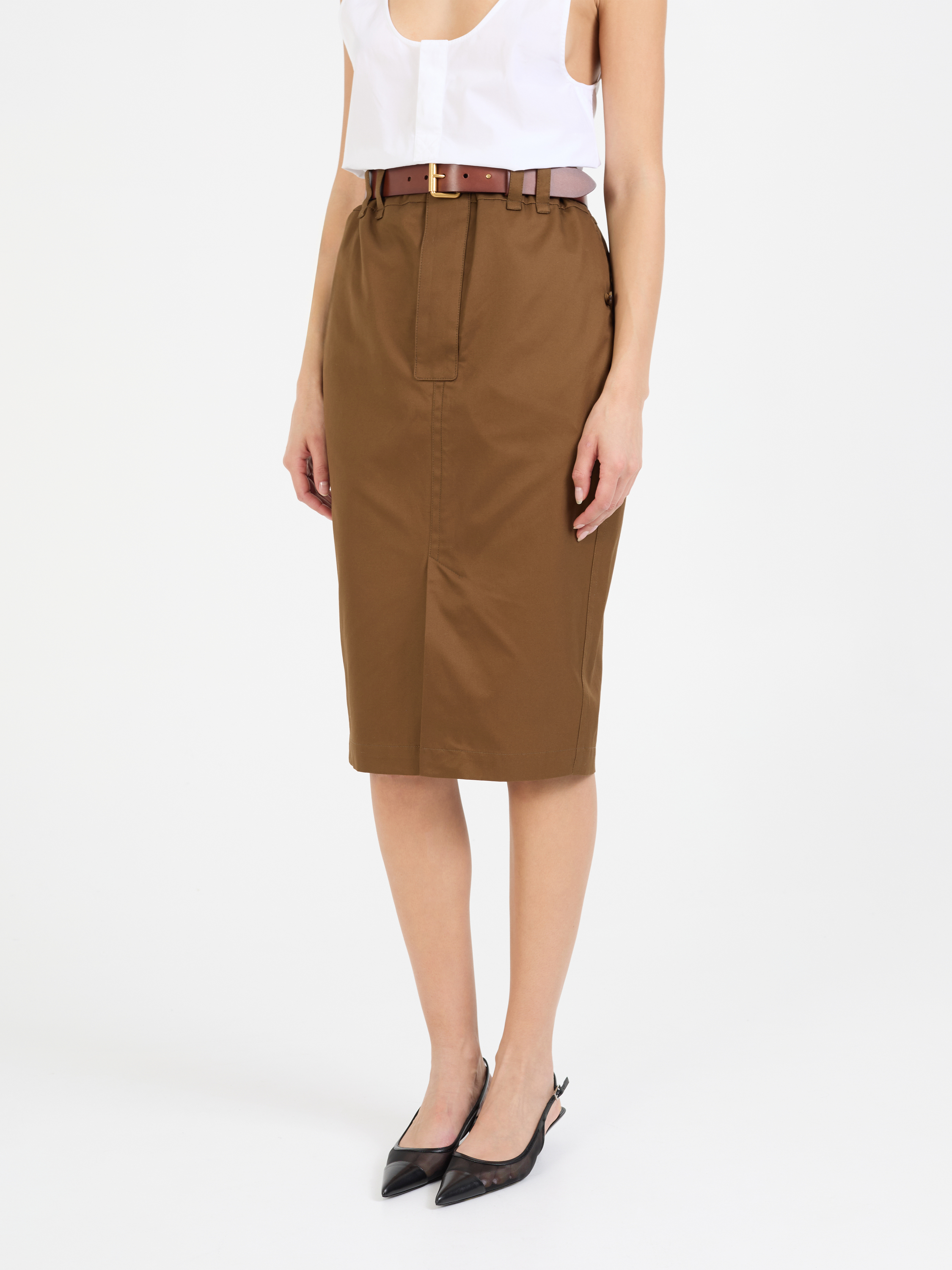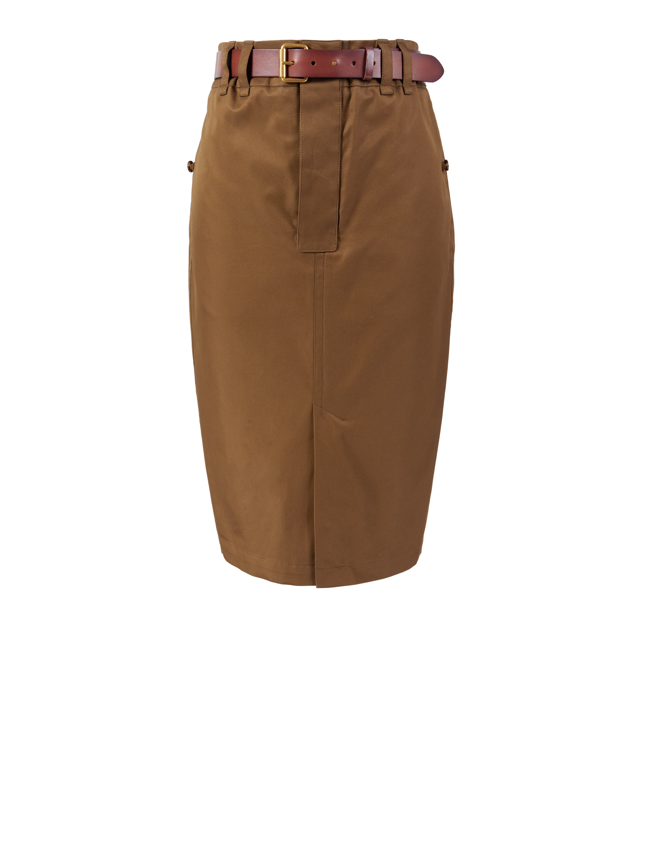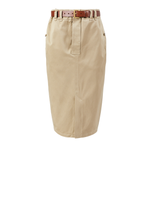Dieser Bleistiftrock in Braun von Saint Laurent wurde aus einem hochwertigen Baumwoll-Twill gefertigt und besticht durch die Midilänge. Der Frontschlitz, der Gürtel und die doppelten Gürtelschlaufen vollenden dieses Modell.
