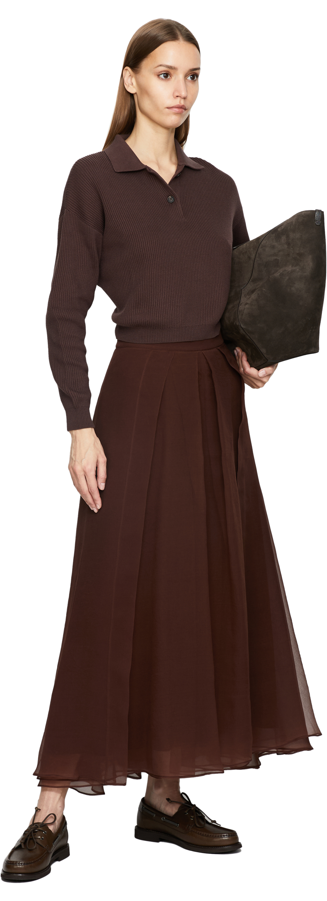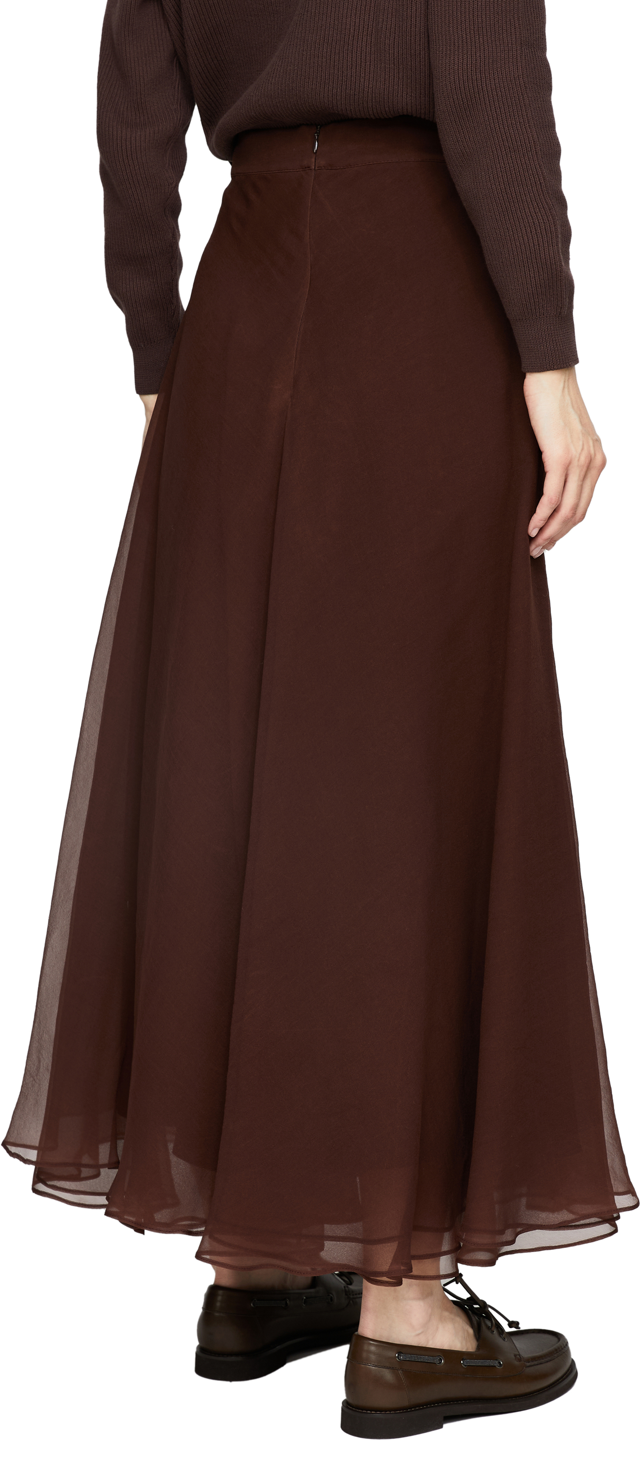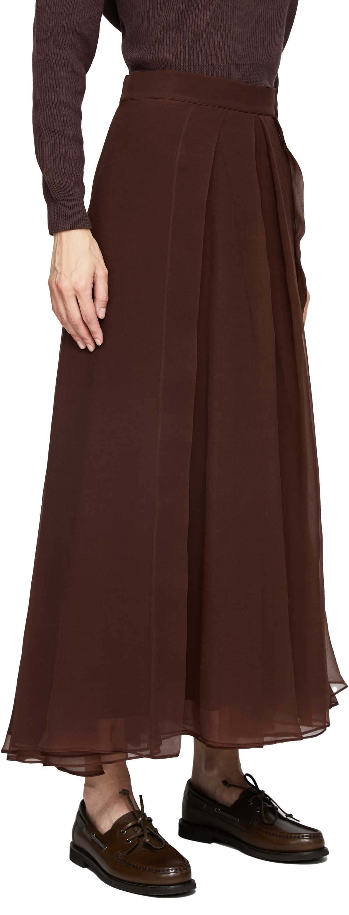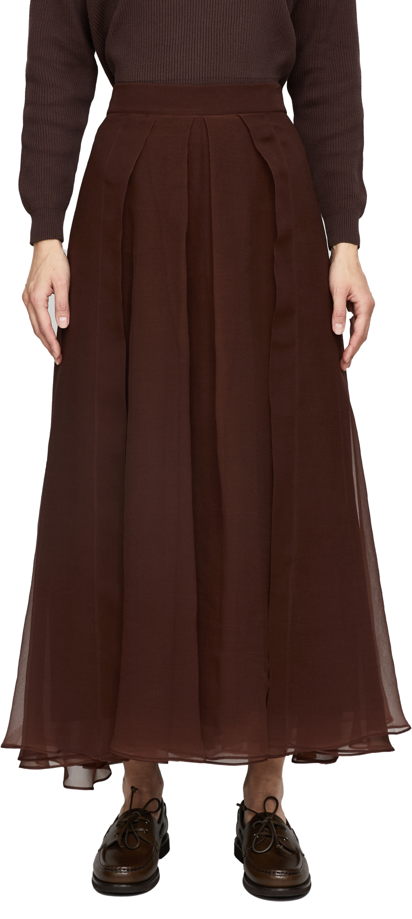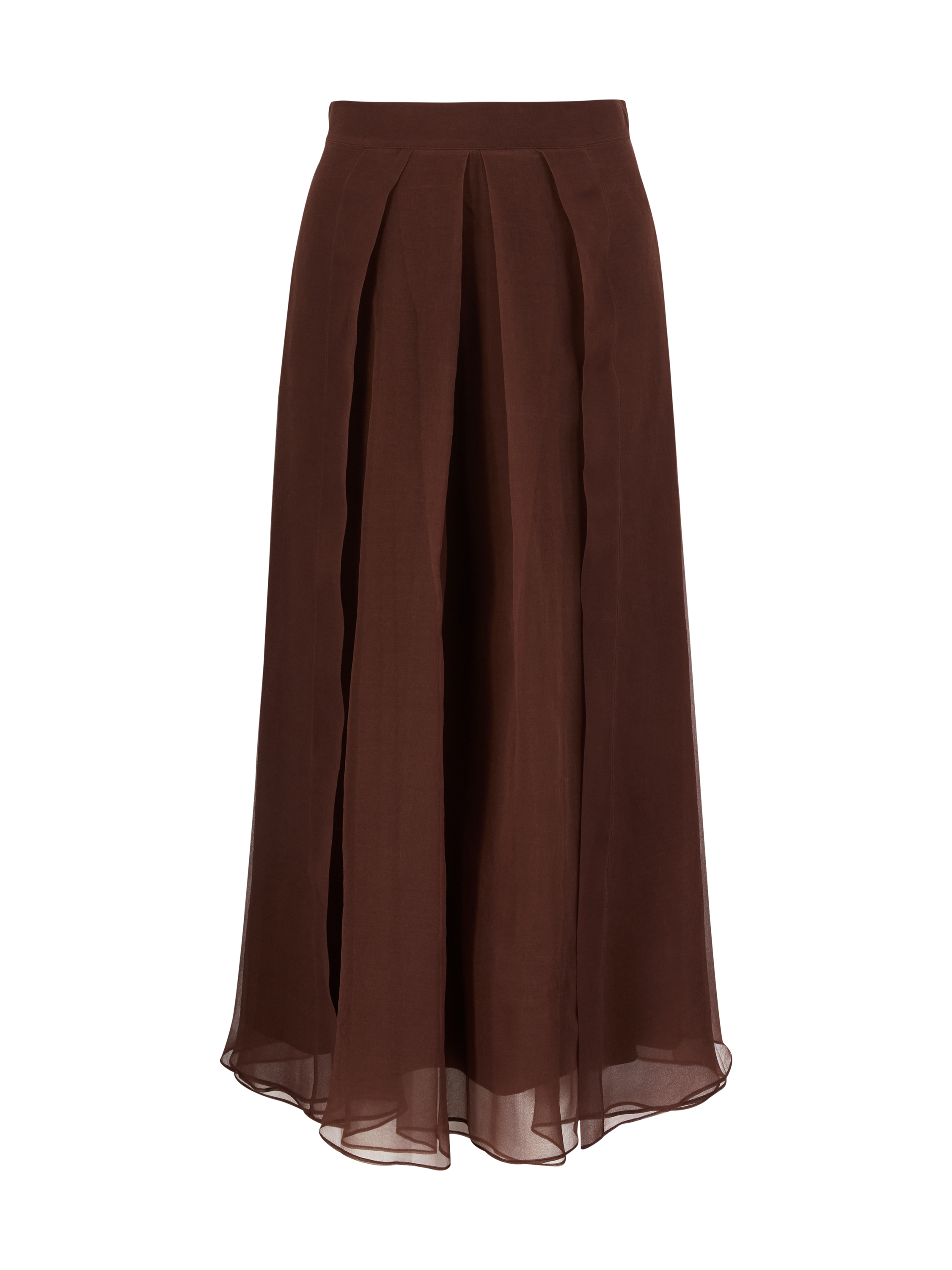 Dieser Midirock in Bordeaux von Brunello Cucinelli wurde aus feinster Seide gefertigt und besticht durch das leichte Material und die eleganten Bundfalten. Die Midilänge und die ausgestellte Silhouette verleihen dem Design einen stilvollen, zärtlichen Look.
