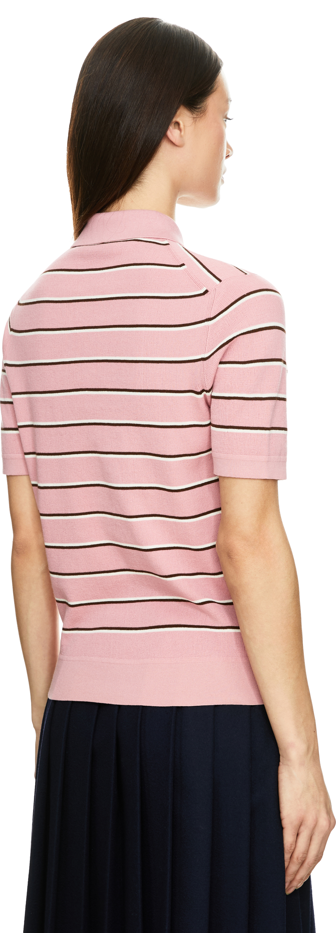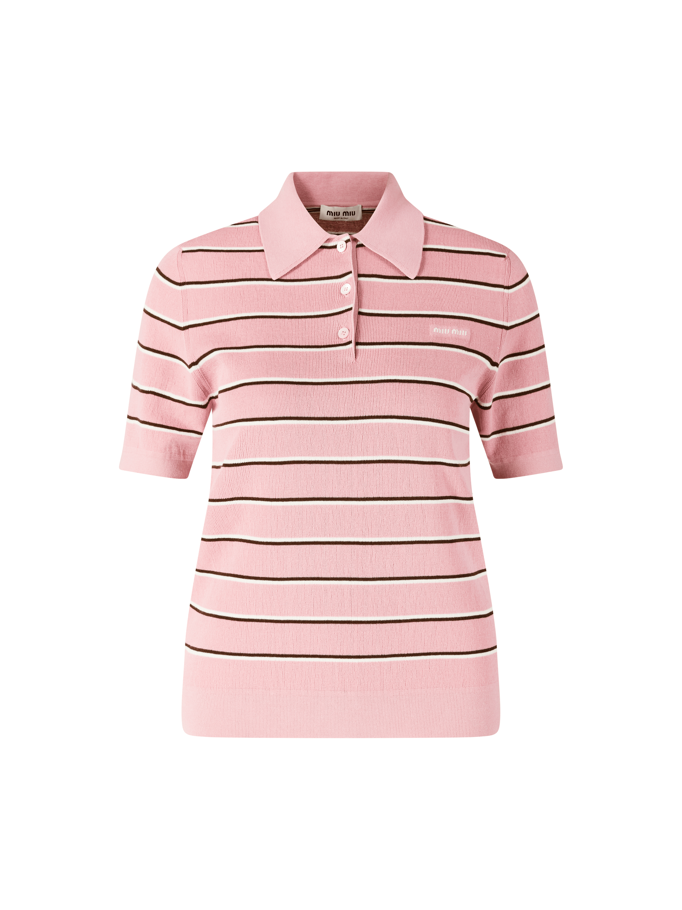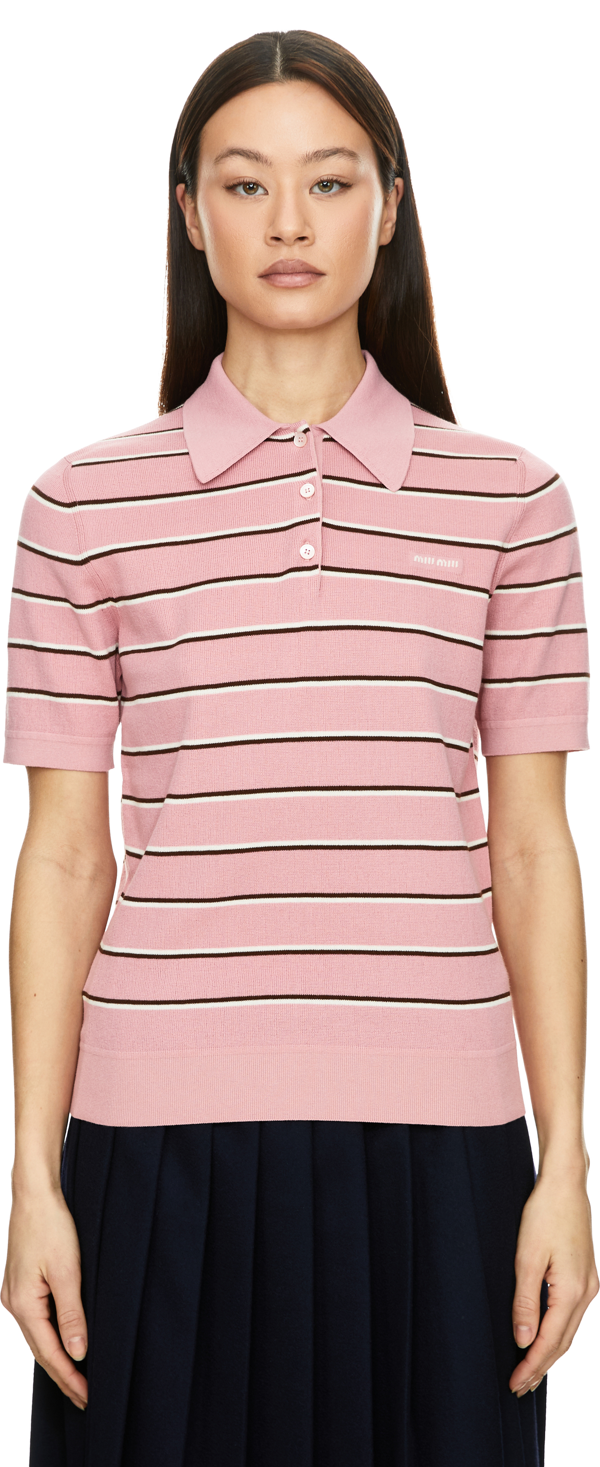 Dieses Poloshirt in Rosé von miu miu wurde aus einer Baumwollmischung gefertigt und besticht durch die gerade Passform. Das Streifenmuster, die kurzen Ärmel, der Knopfverschluss auf der Vorderseite sowie das Intarsienlogo vollenden dieses stilvolle Modell.