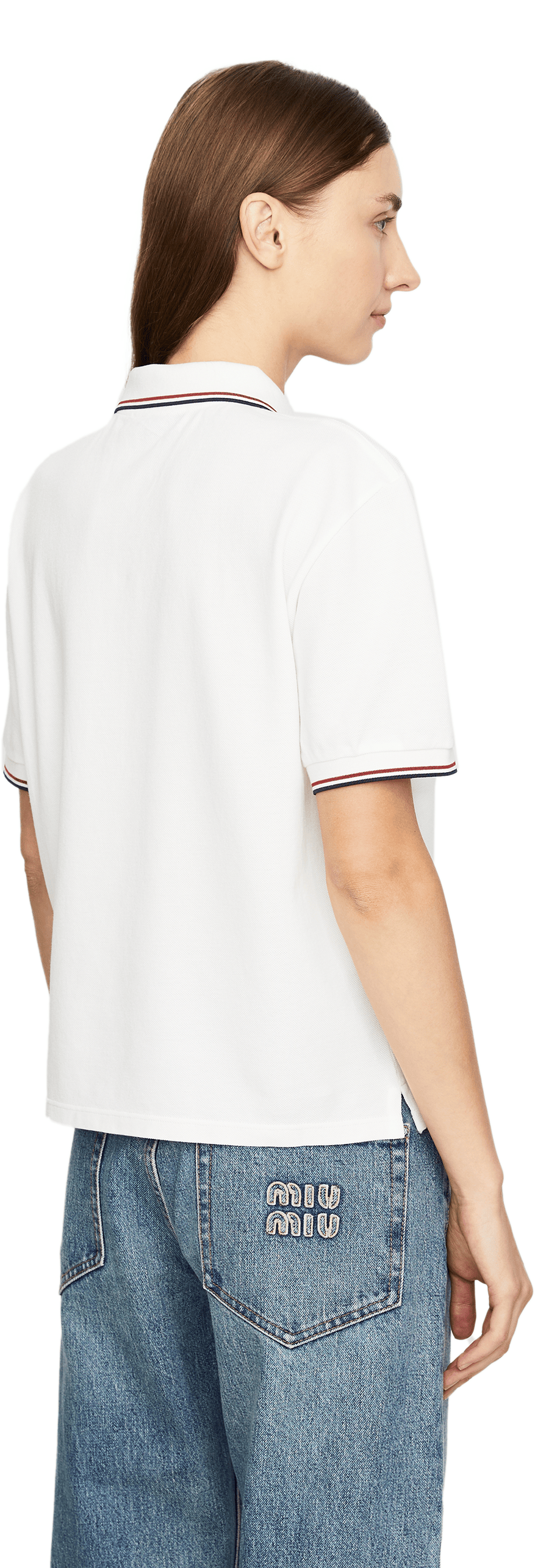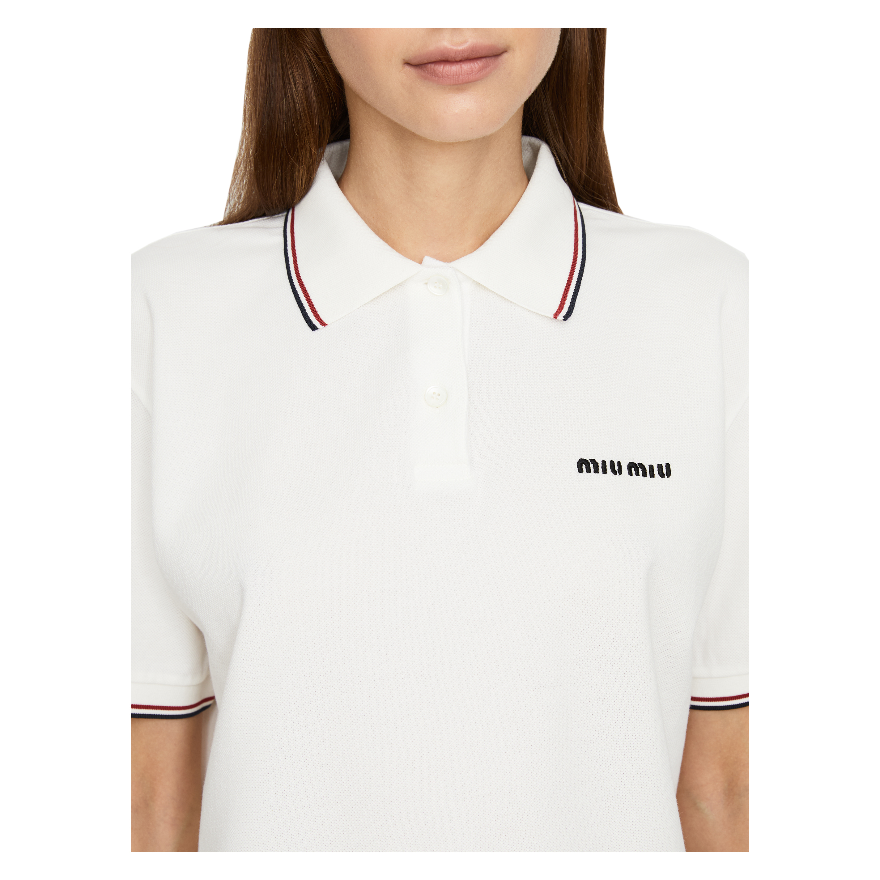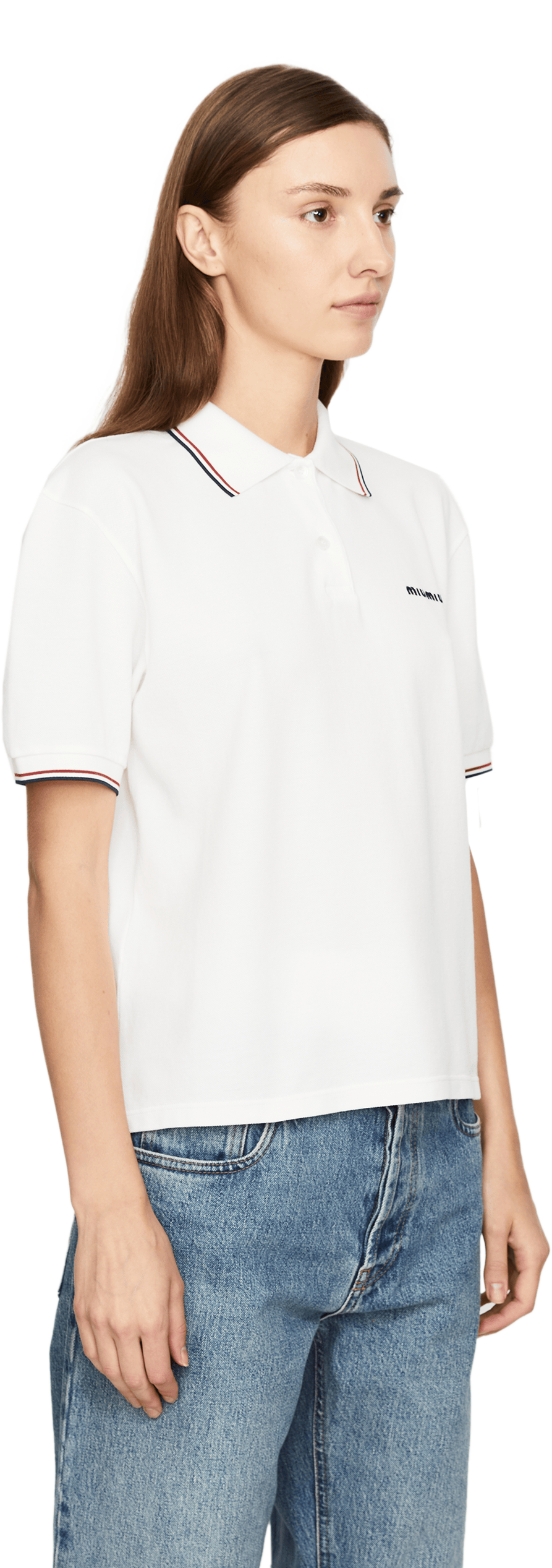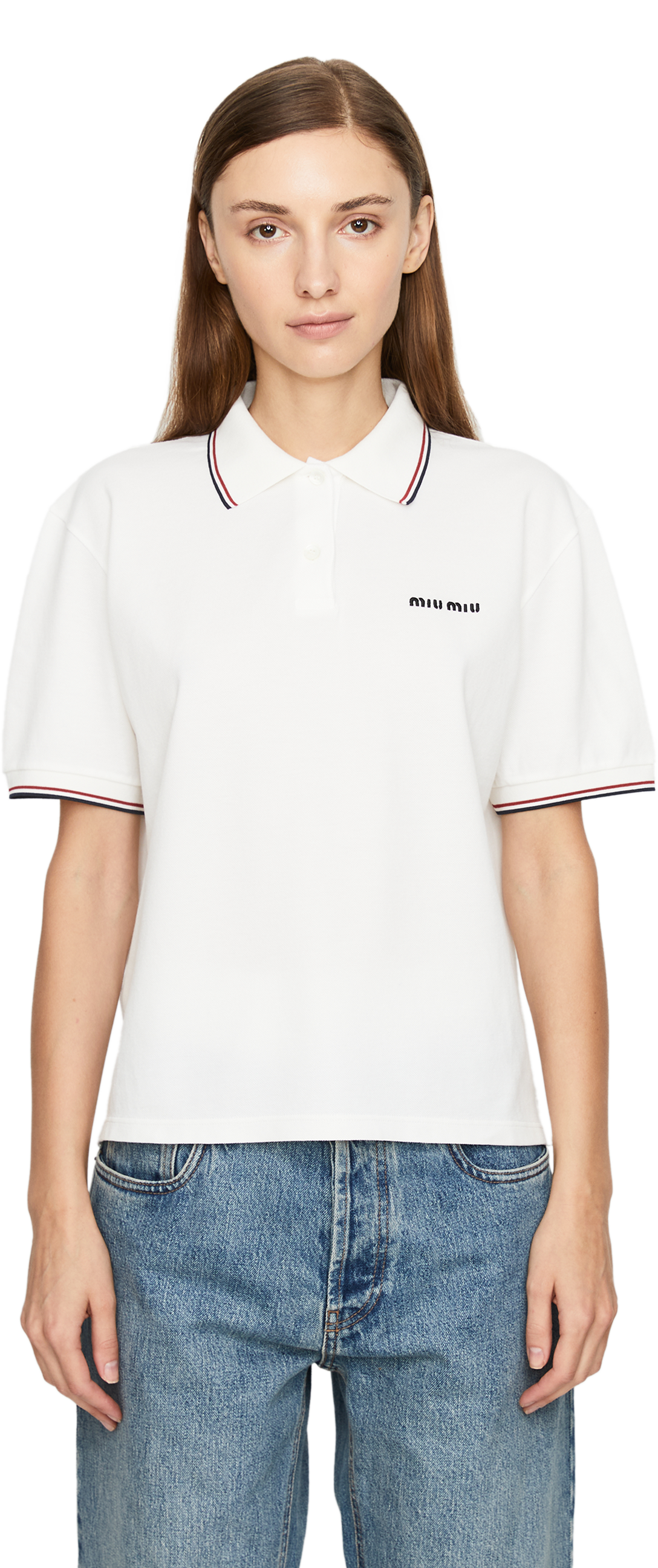 Dieses Poloshirt in Weiß von miu miu wurde aus hochwertiger Baumwolle gefertigt. Das Modell besticht durch die gerade Silhouette und die Knopfleiste. Der klassische Polokragen und der Logo-Aufnäher vollenden dieses stilvolle Design.