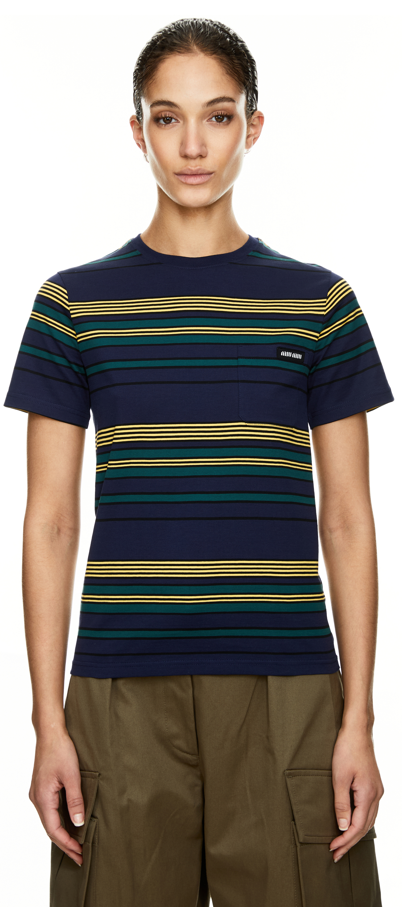 Dieses T-Shirt in Marineblau von miu miu wurde aus hochwertiger Baumwolle gefertigt. Das Modell besticht durch die gerade Silhouette und die aufgesetzte Brusttasche. Das klassische Streifenmuster und die kurzen Ärmel vollenden dieses stilvolle Modell.