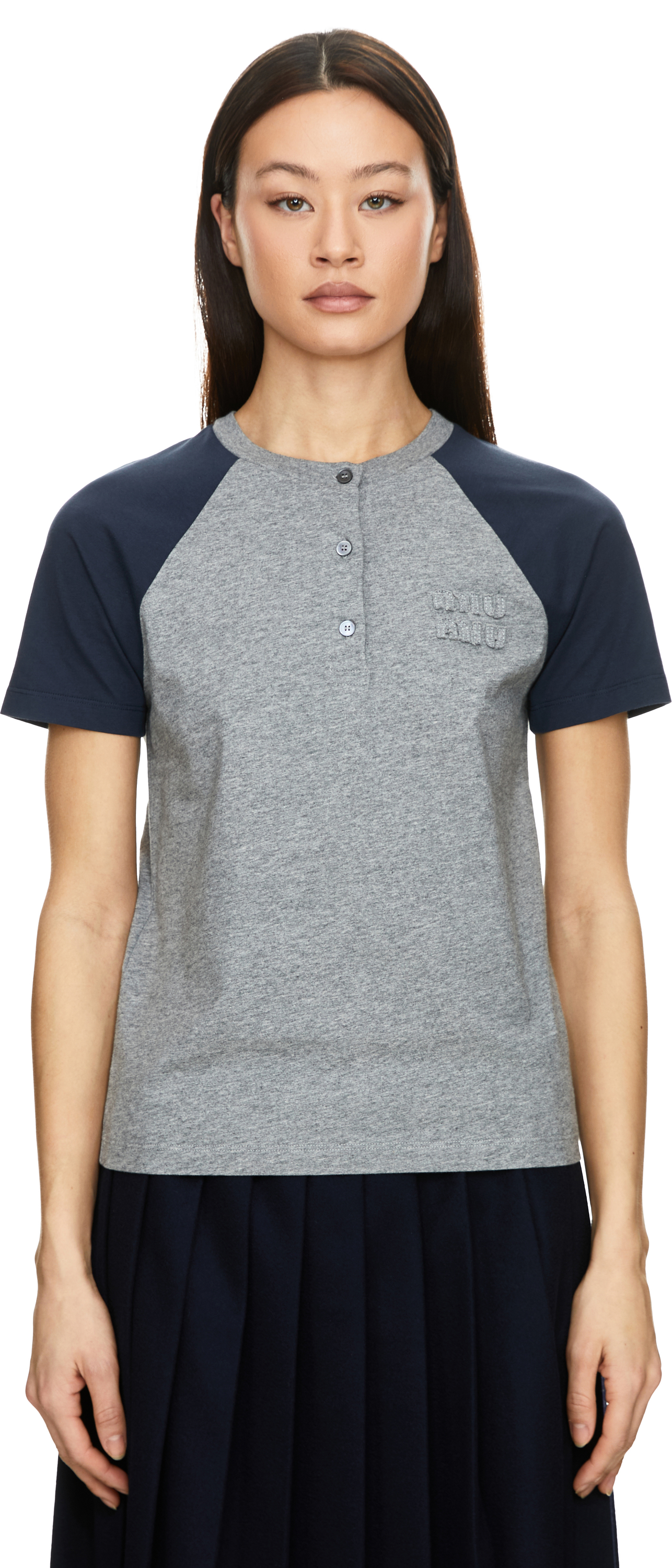Dieses T-Shirt in Grau von miu miu wurde aus Baumwolljersey gefertigt und besticht durch die gerade Passform. Der Rundhalsausschnitt, die drei Knöpfe am Ausschnitt sowie das Sticklogo runden das Design harmonisch ab.