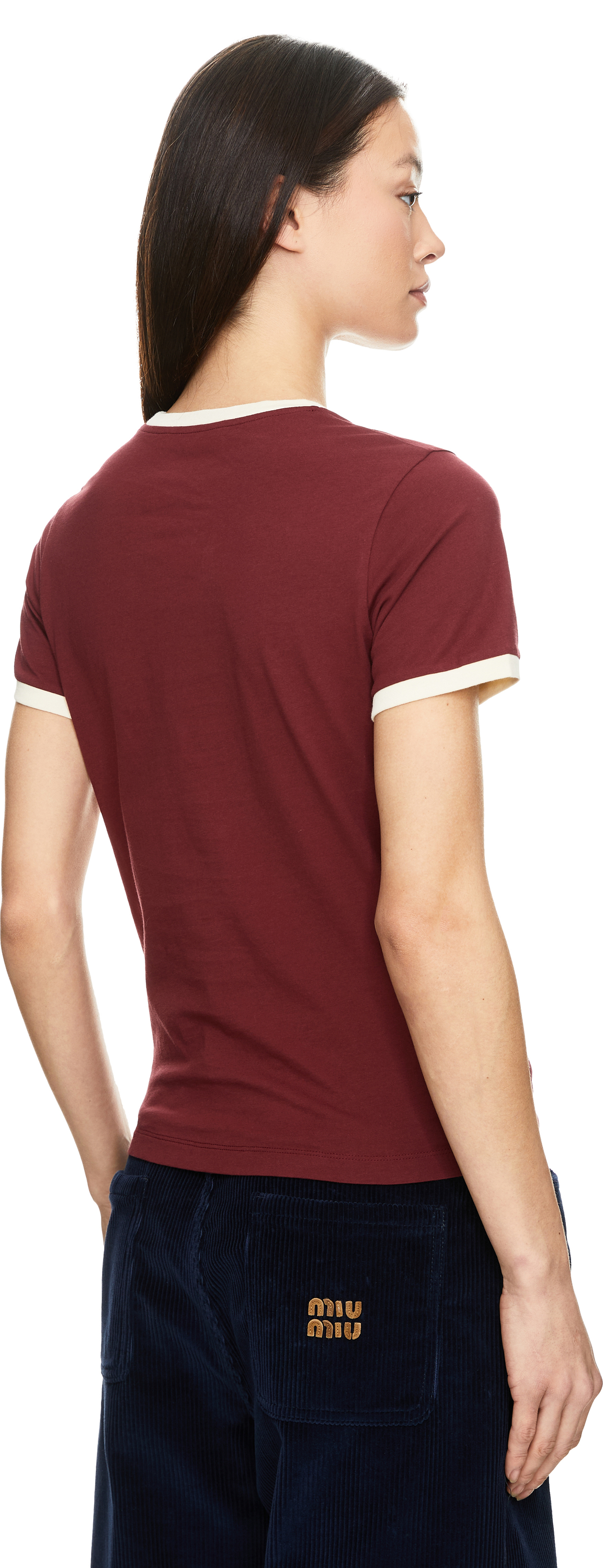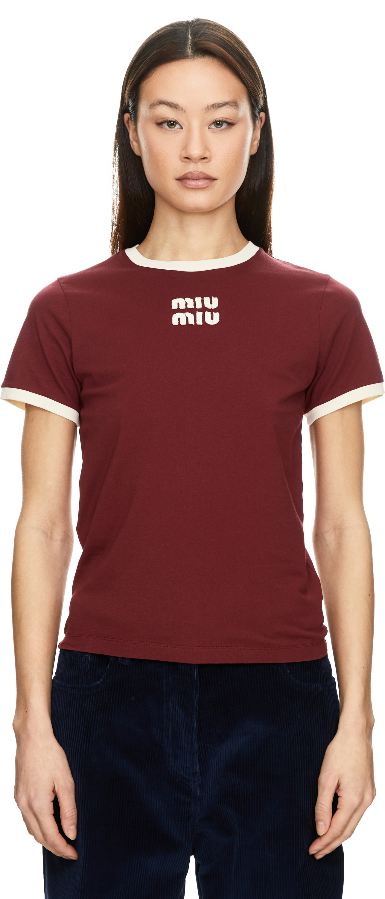 Dieses T-Shirt in Rot von miu miu wurde aus Baumwolljersey gefertigt und besticht durch das gestickte Logo auf der Brust. Die gerade Passform, der Rundhalsausschnitt, die kurzen Ärmel sowie der doppelt gesteppte Saum runden das Design ab.