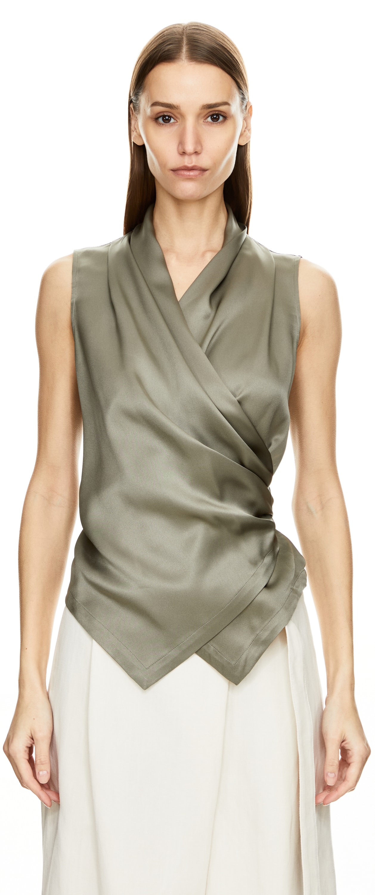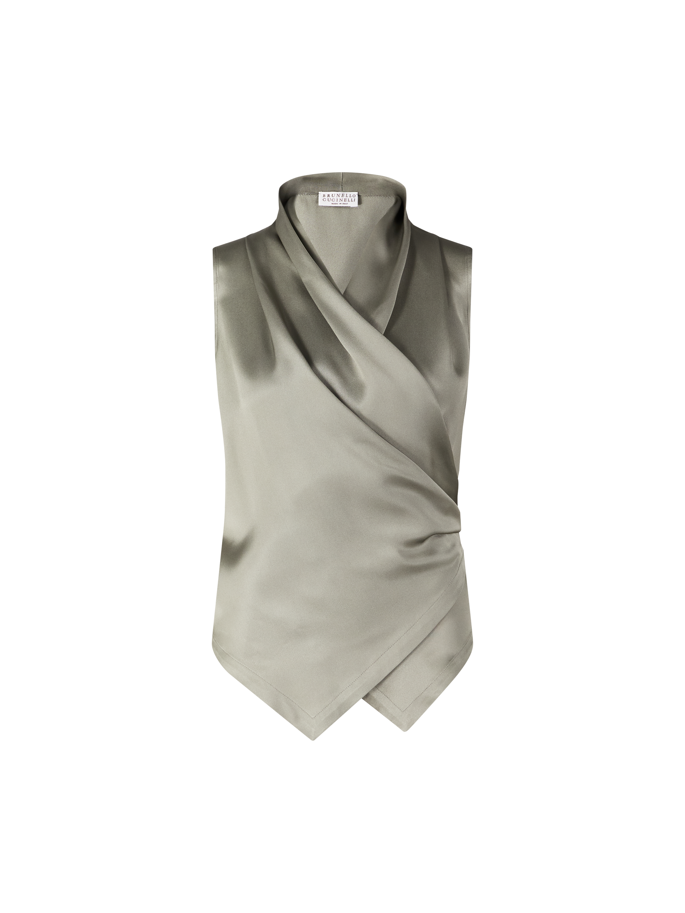 Dieses Top in Khaki von Brunello Cucinelli wurde aus edler Seide gefertigt und besticht durch die fließende Satin-Optik. Die Wickel-Optik mit verstellbarem Gürtel entlang des Modells sorgt für eine betonte, feminine Silhouette. Die feinen Monili-Perlen am Nacken setzen dezente Highlights, während der asymmetrische Saum dem Design eine moderne Note verleiht. Der ärmellose Schnitt macht das Modell luftig und eignet sich hervorragend als Begleiter an wärmeren Tagen.