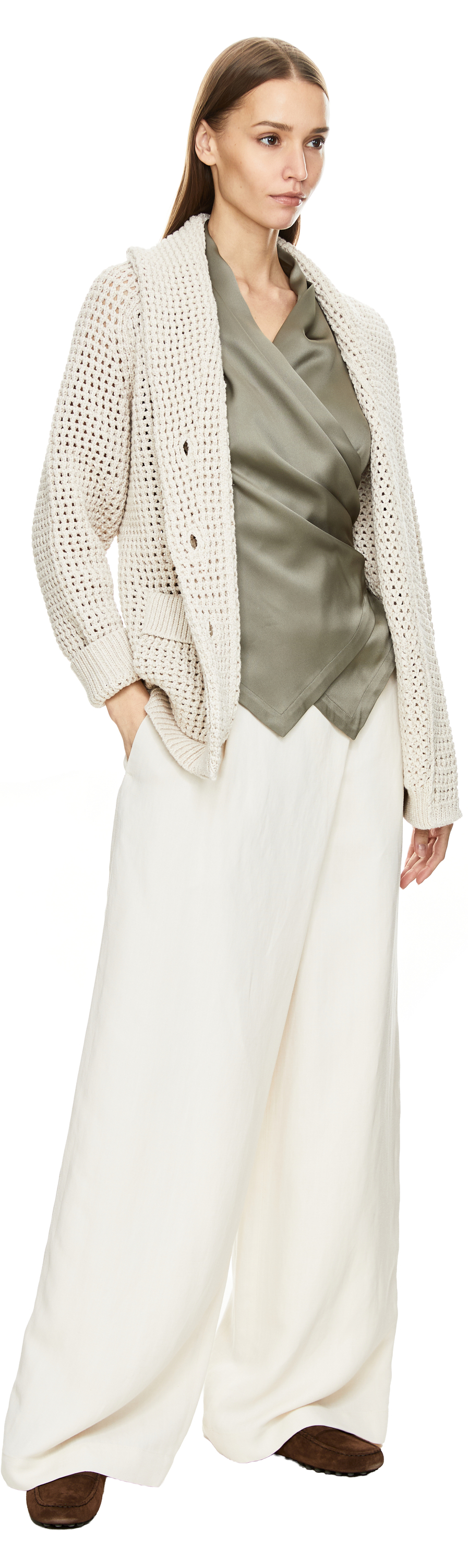 Brunello Cucinelli ist eine italienische Luxusmarke, die 1978 von Brunello Cucinelli in dem malerischen Dorf Solomeo gegründet wurde. Die Marke steht für hochwertige Mode und vereint traditionelle Handwerkskunst mit modernem Design. Seine Mode ist weltweit bekannt für ihre exklusive Qualität und die Verwendung luxuriöser Materialien. Das Unternehmen hat seinen Hauptsitz nach wie vor in Solomeo, einem Ort, der für die Philosophie der "humanistischen Kapitalismus" steht, die von Brunello Cucinelli selbst propagiert wird. Diese Philosophie betont die Bedeutung von Menschlichkeit und ethischer Verantwortung in der Geschäftswelt.