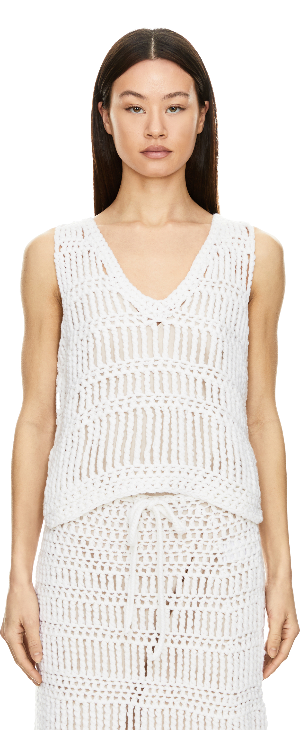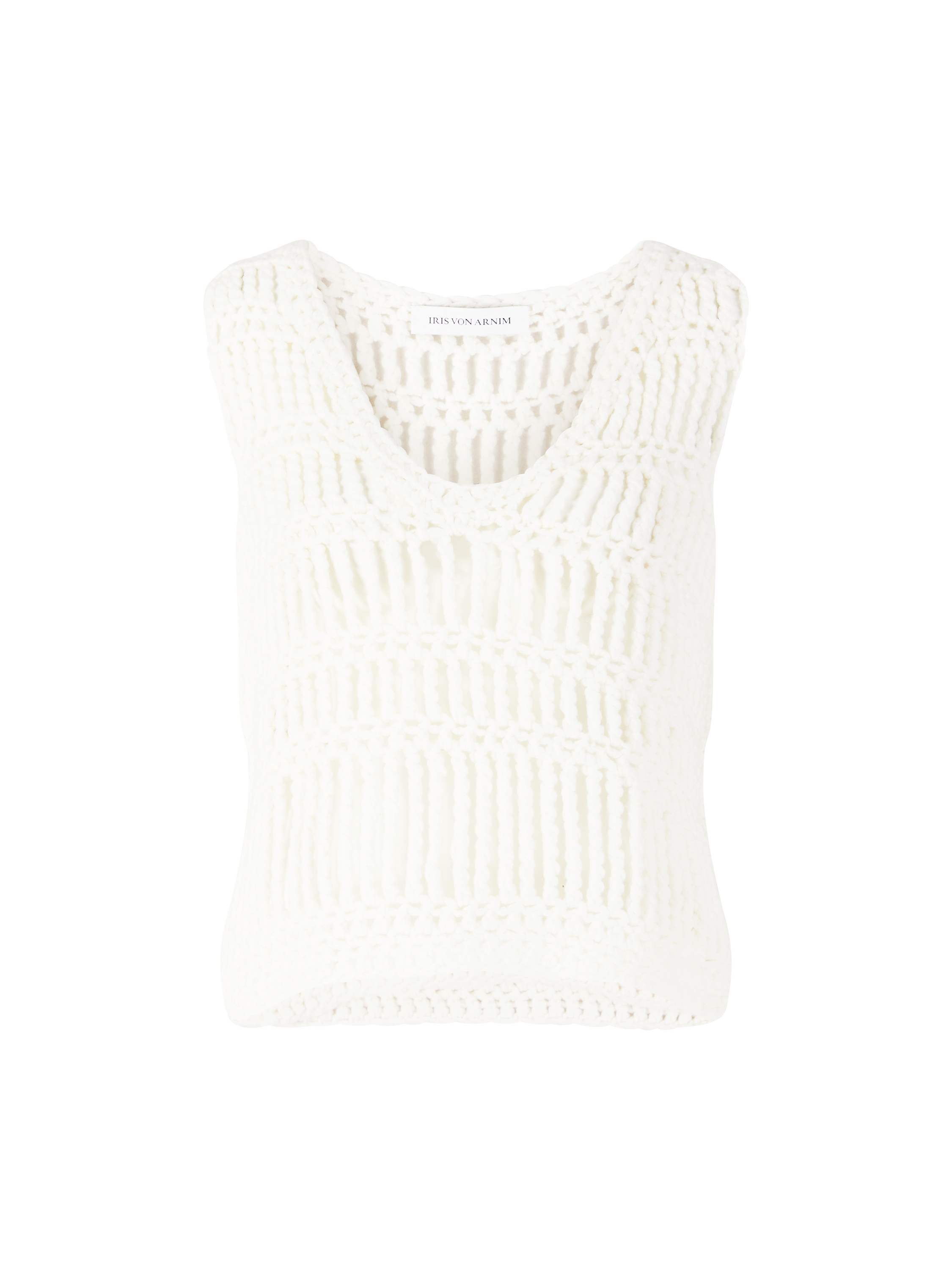 Das Top 'Sunny' in Off White von Iris von Arnim wurde aus hochwertigem Cashmere gefertigt und besticht durch die feine Lochstruktur. Die verkürzte Silhouette, der ärmellose Schnitt und der V-Ausschnitt verleihen dem Modell eine feminine Note. Abgerundet wird das Design durch die weiche, angenehme Haptik.