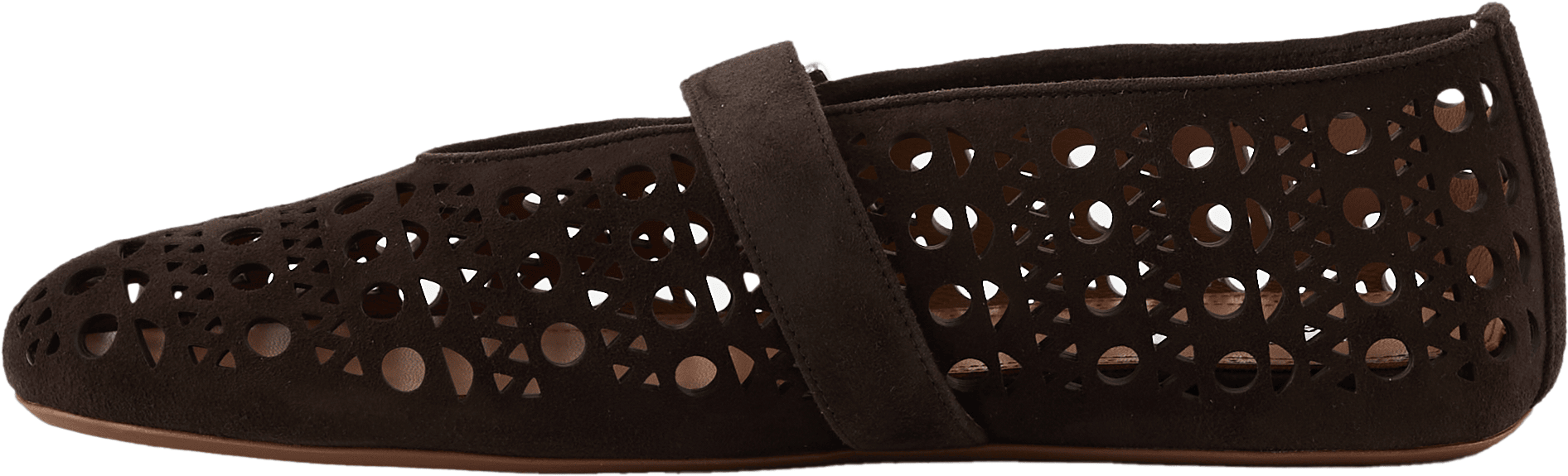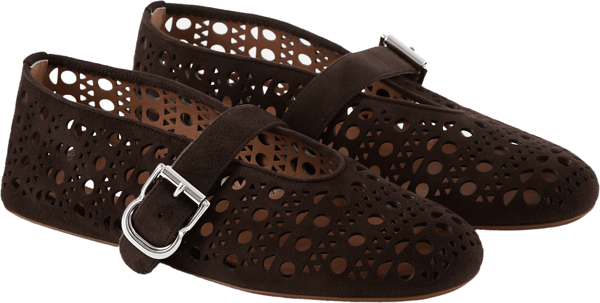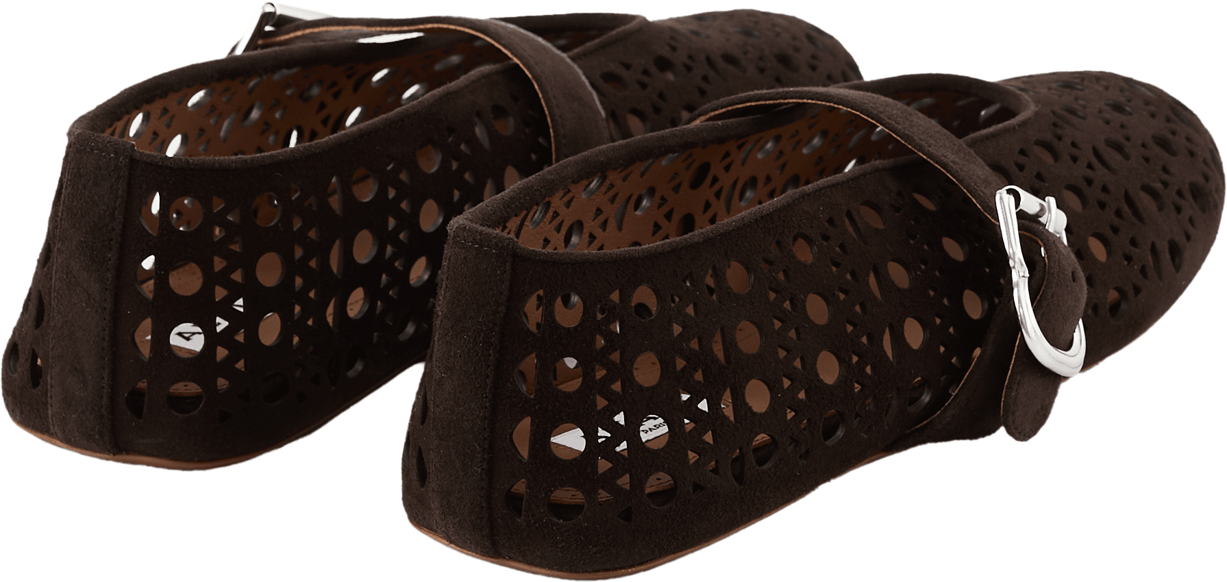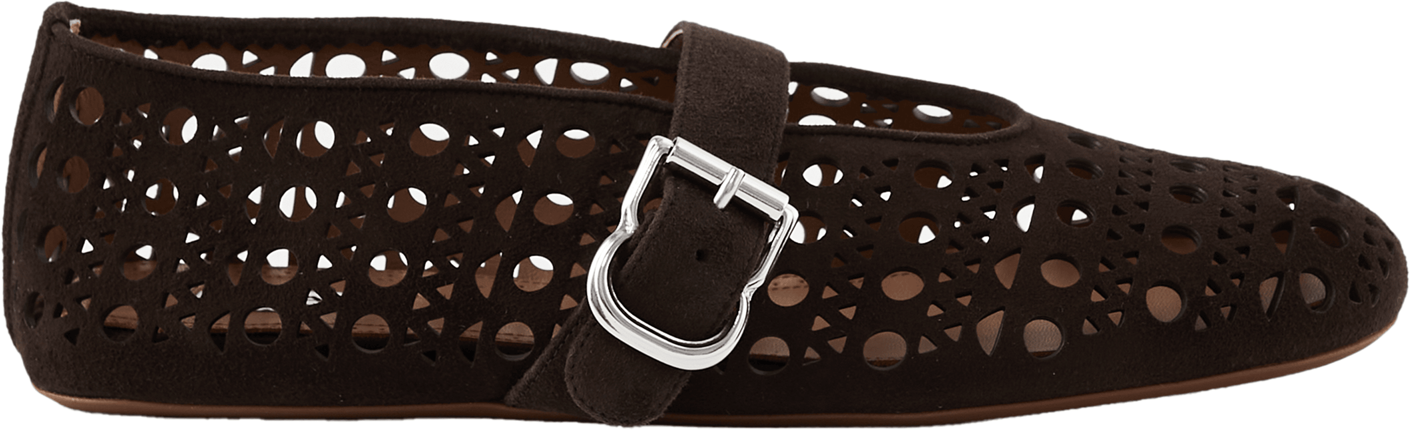 Dieser Ballerina in Dunkelbraun von Alaïa wurde aus Ziegenveloursleder gefertigt und besticht durch das Vienne-Muster. Die runde Zehenpartie, der Schnallenriemen sowie das Logo-Patch am Fußbett perfektionieren dieses elegante Modell.