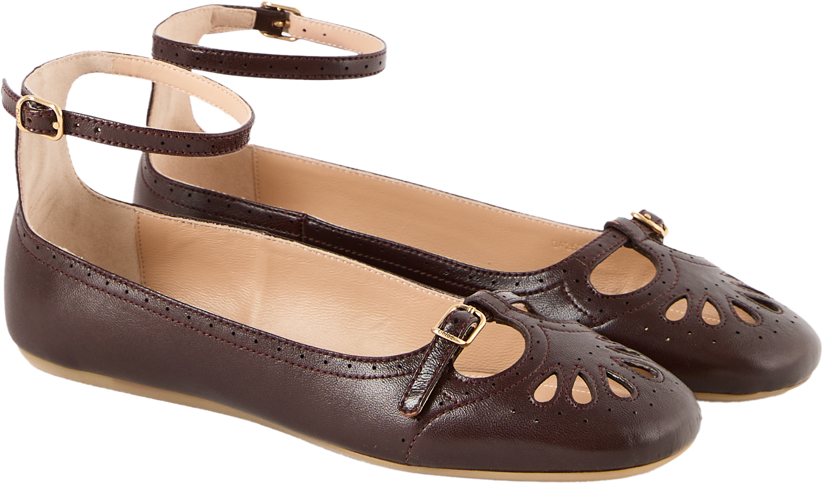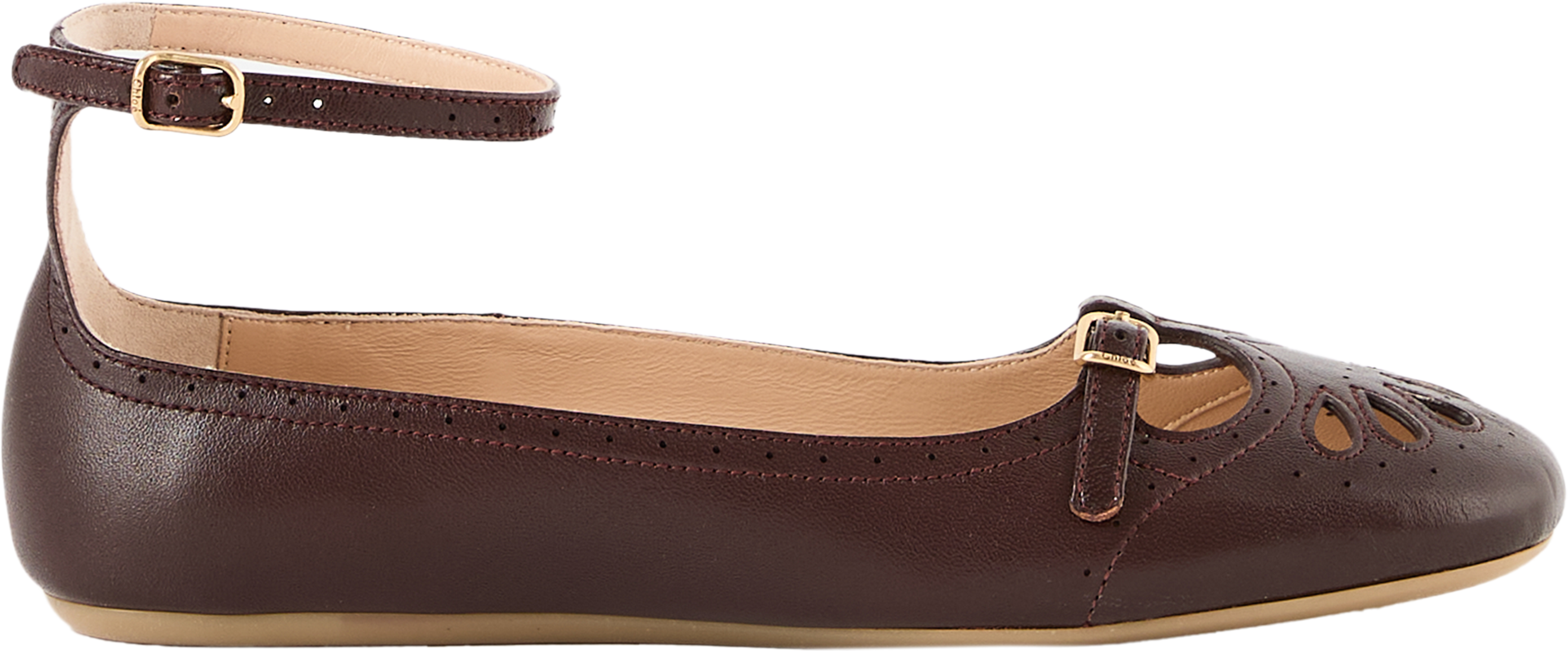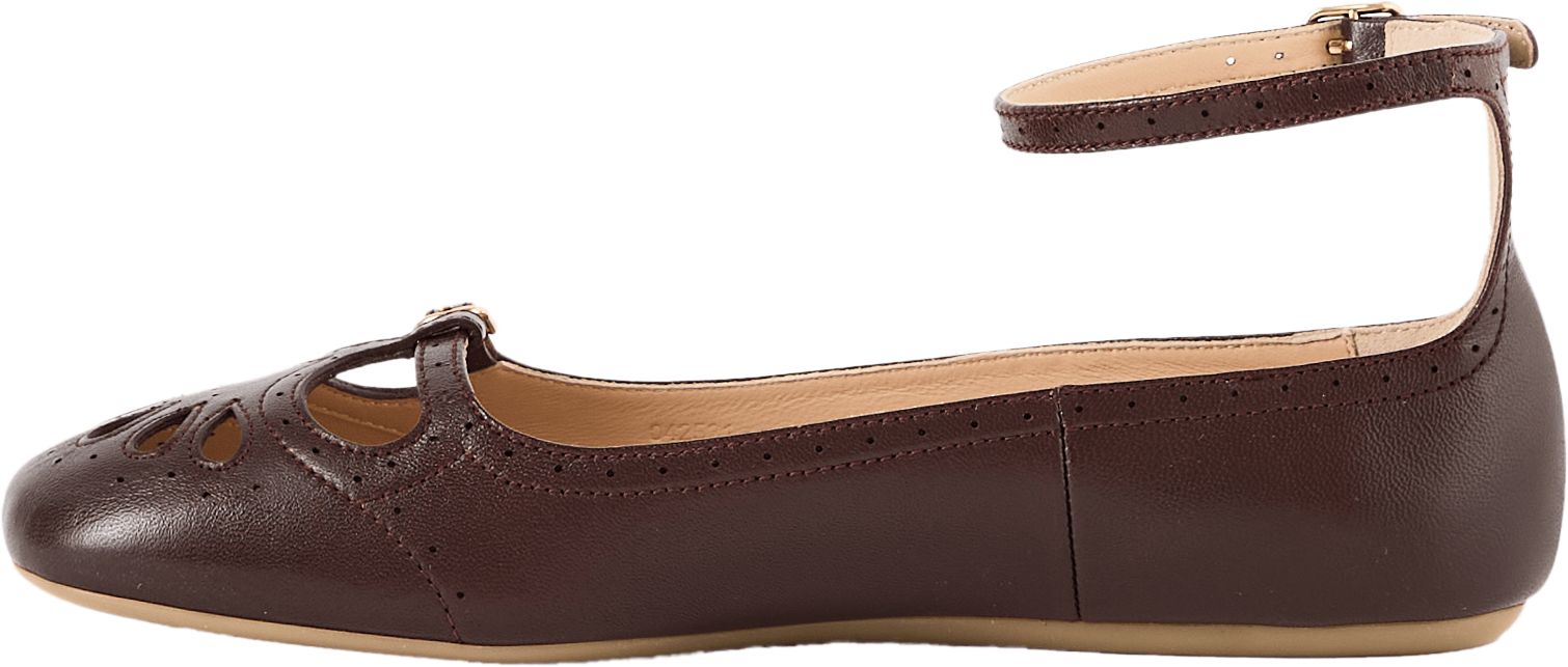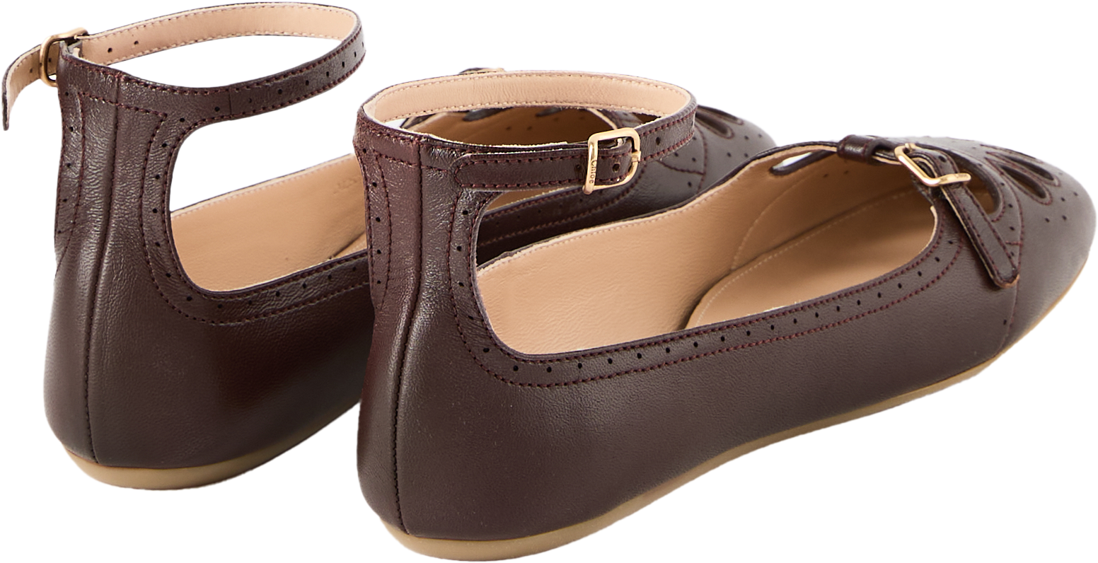 Der Ballerina 'Misty' in Burnt Purple von Chloé wurde aus hochwertigem Lammleder gefertigt und besticht durch die verspielten Cut-Out-Details. Die sanft abgerundete Zehenpartie und die flexible Gummisohle sorgen für angenehmen Tragekomfort, während zarte Riemen mit goldfarbenen Schnallen und Chloé-Gravur das Design vollenden.