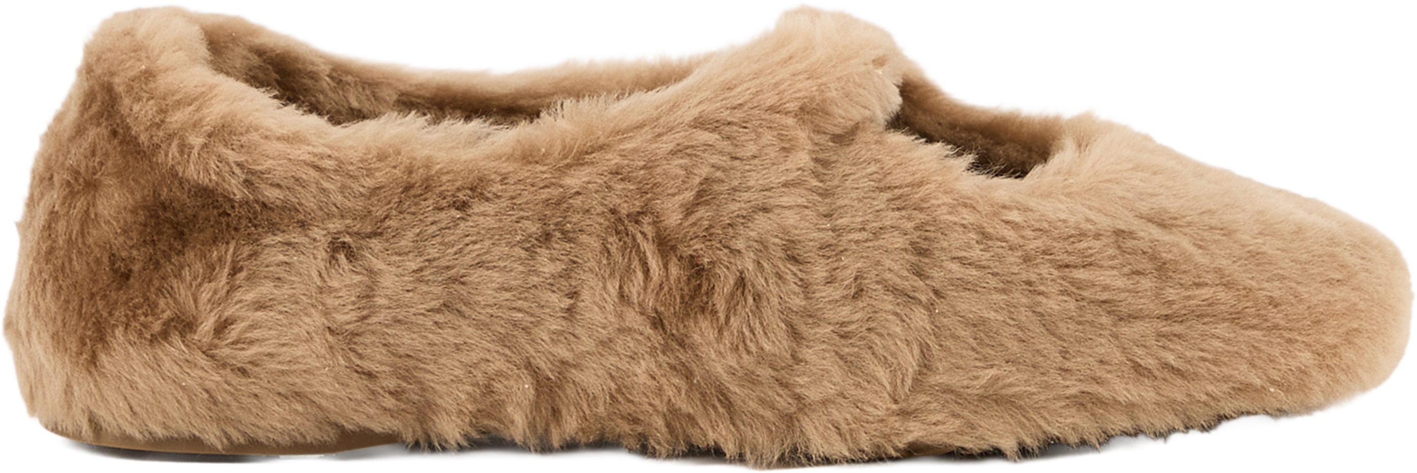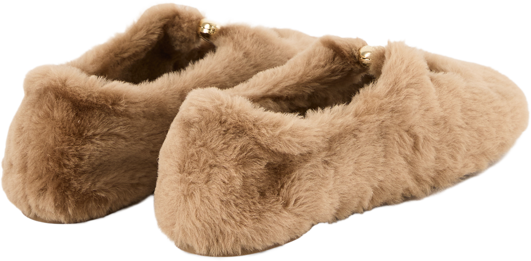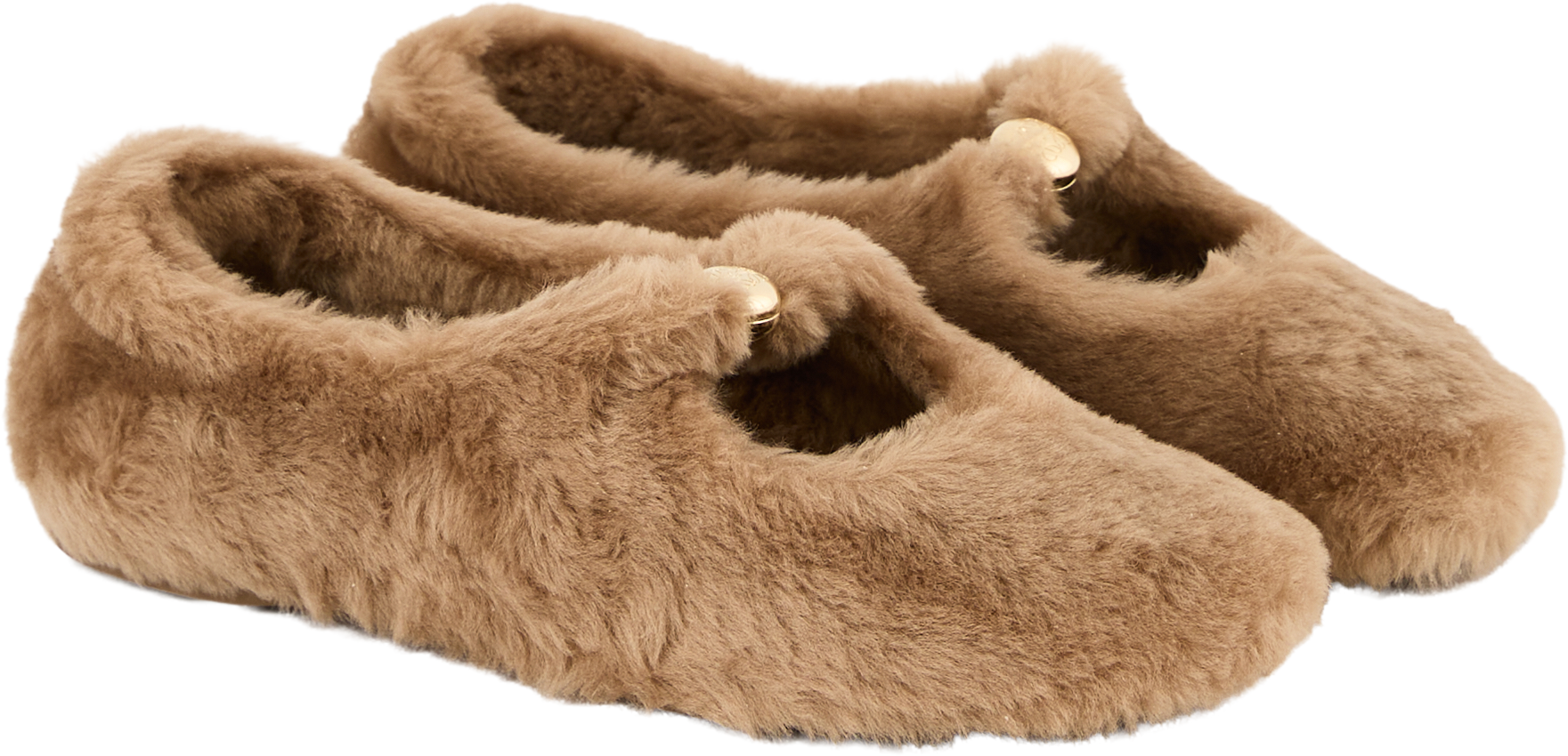 Der Ballerina 'Pebble Soft' in Oak von LOEWE wurde aus hochwertigem Shearling gefertigt und besticht durch den Riemen mit goldfarbenem Pebble mit LOEWE-Anagramm. Die charakteristische blütenförmige Zehenkappe verleiht dem Modell einen femininen Akzent, während das flexible Obermaterial für zusätzlichen Komfort sorgt. Die gepolsterte Lederinnensohle und die Gummilaufsohle mit Anagramm-Prägung runden den hochwertigen Look ab.