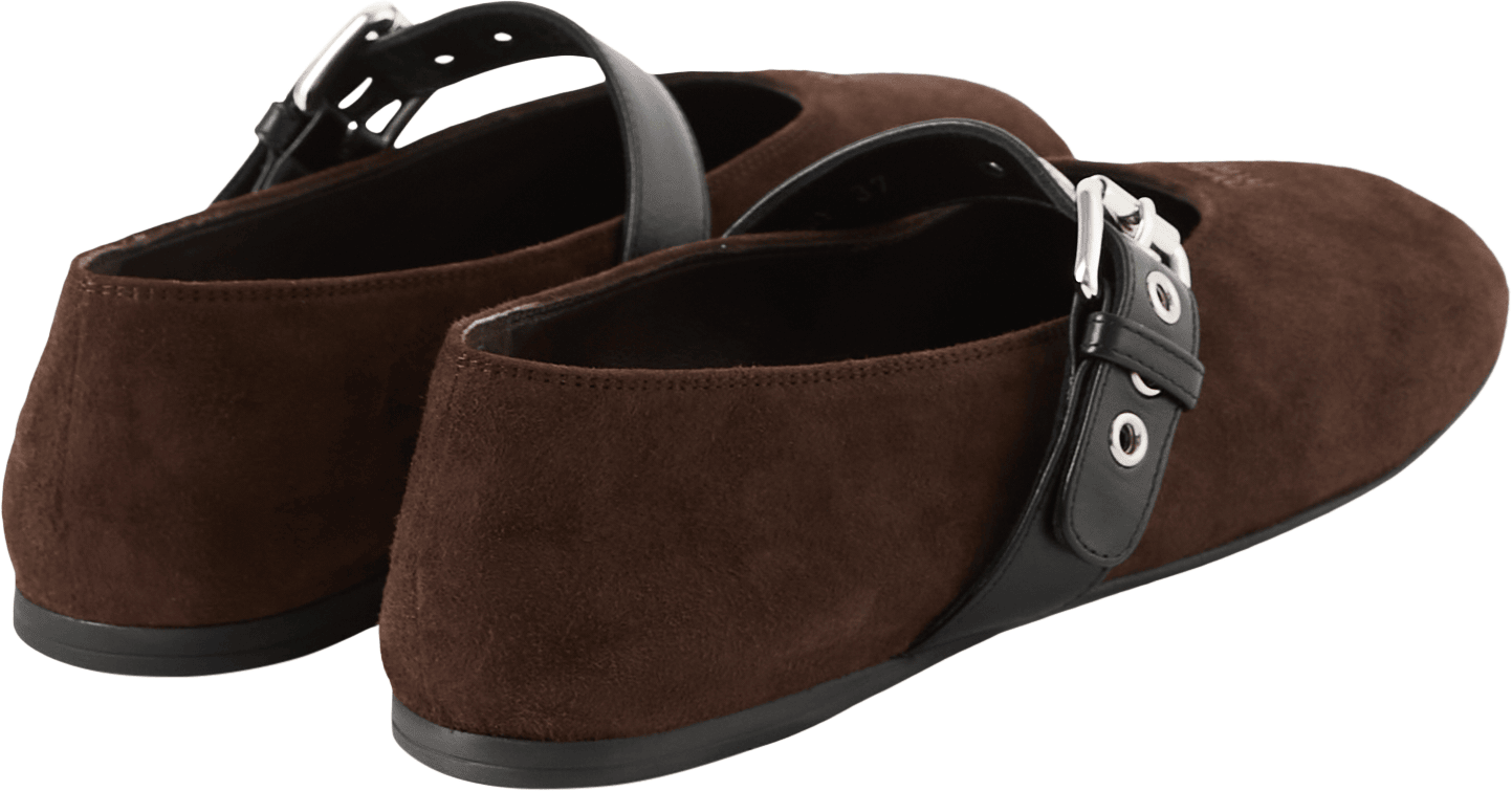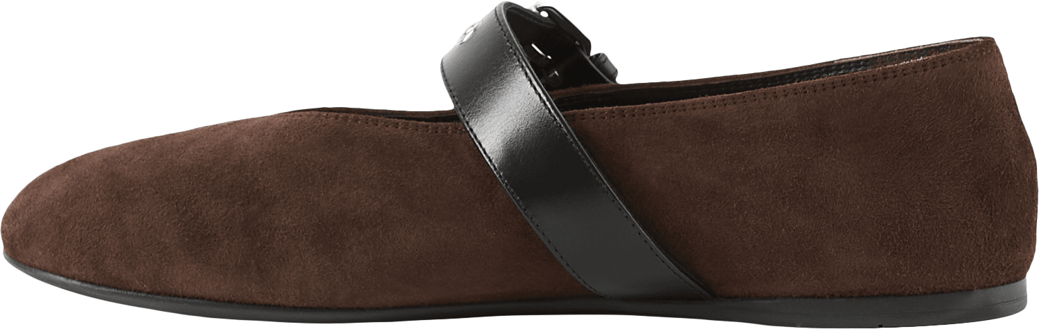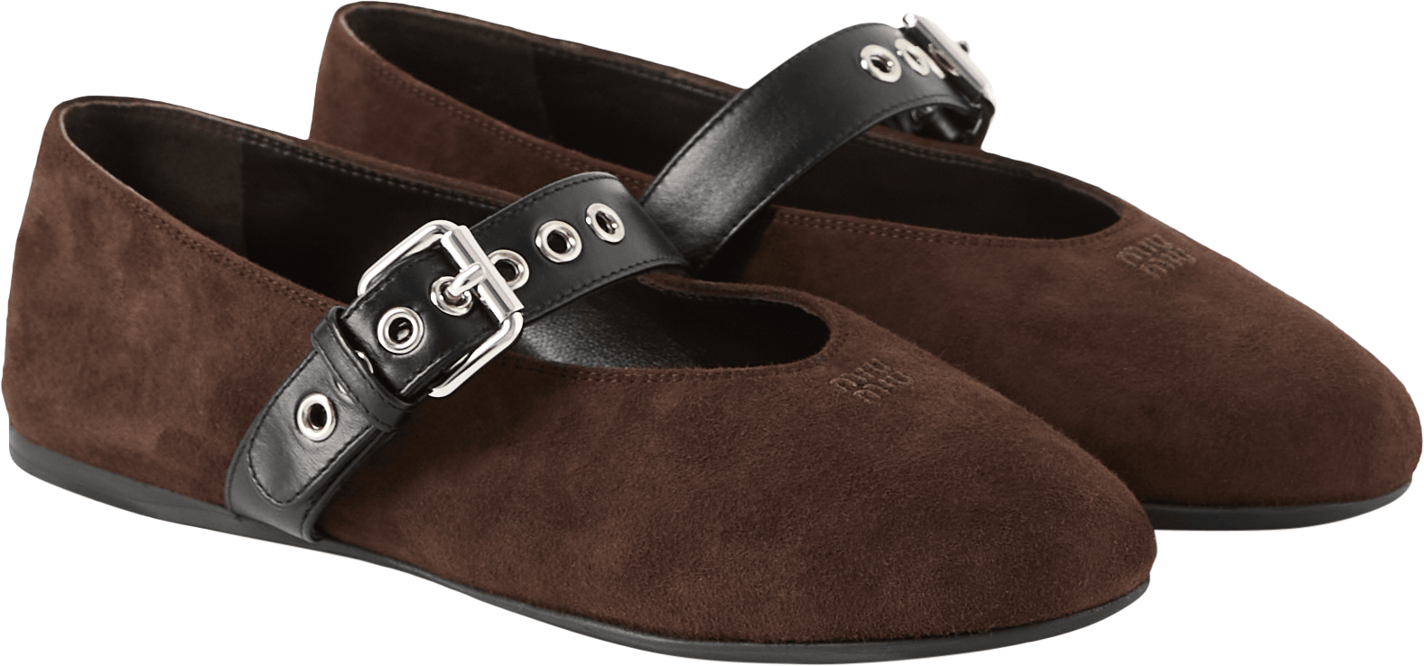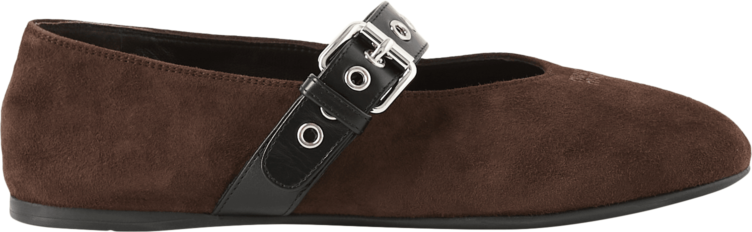 Dieser Ballerina in Dunkelbraun von miu miu wurde aus weichem Lammveloursleder gefertigt und besticht durch den markanten Riemen mit Schnalle. Die runde Zehenpartie sowie das Sticklogo auf dem Obermaterial runden das Design perfekt ab.
