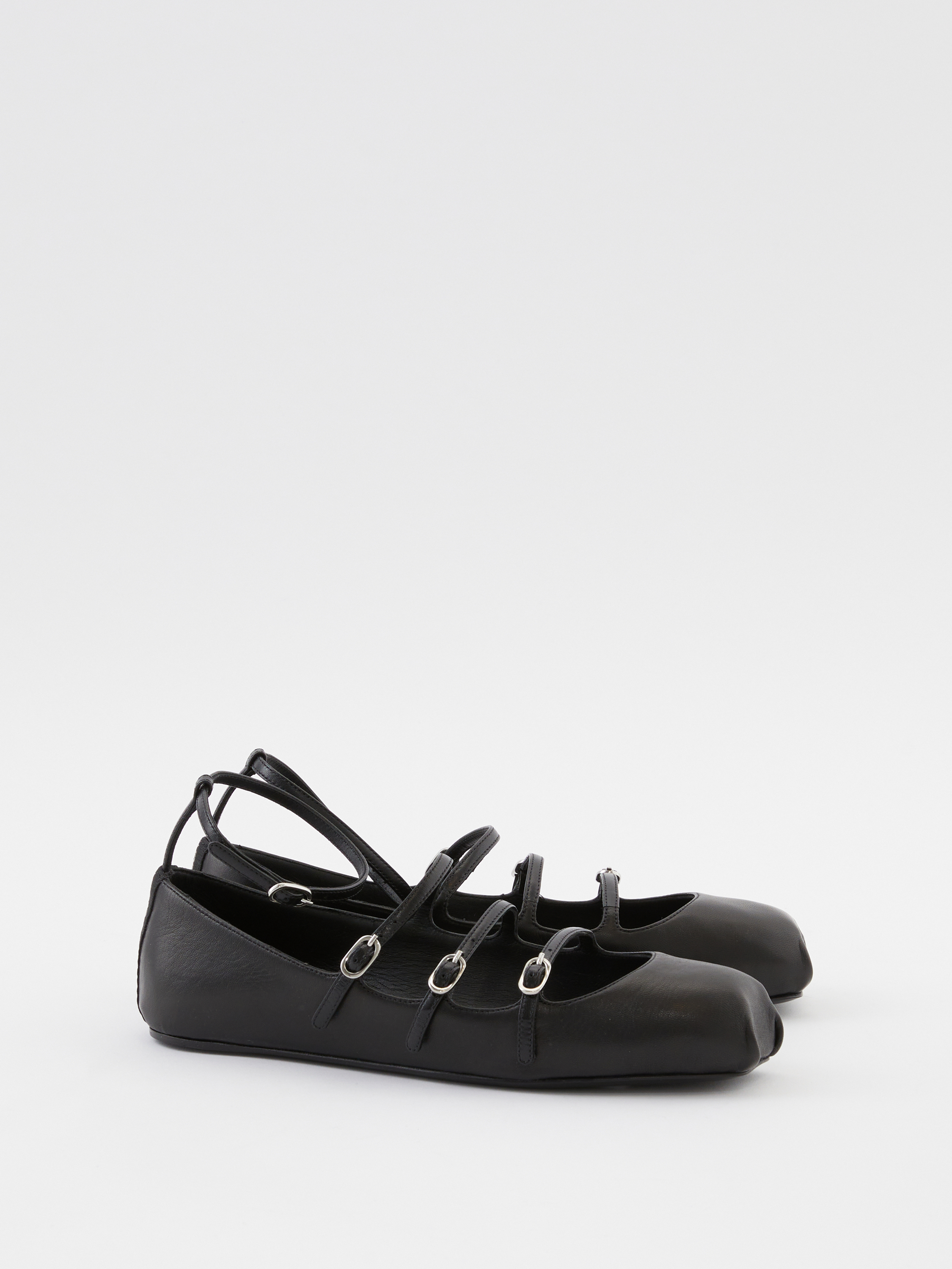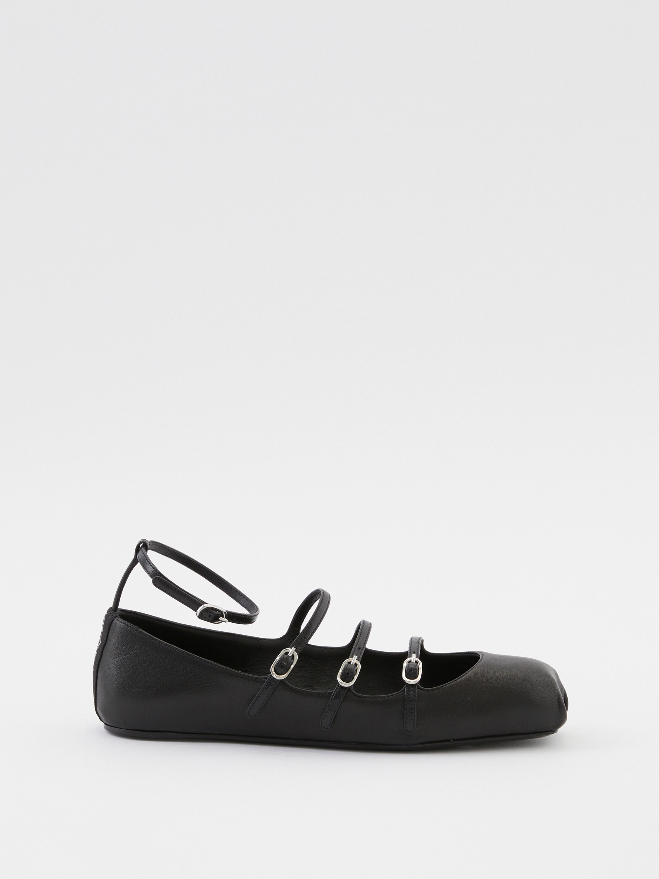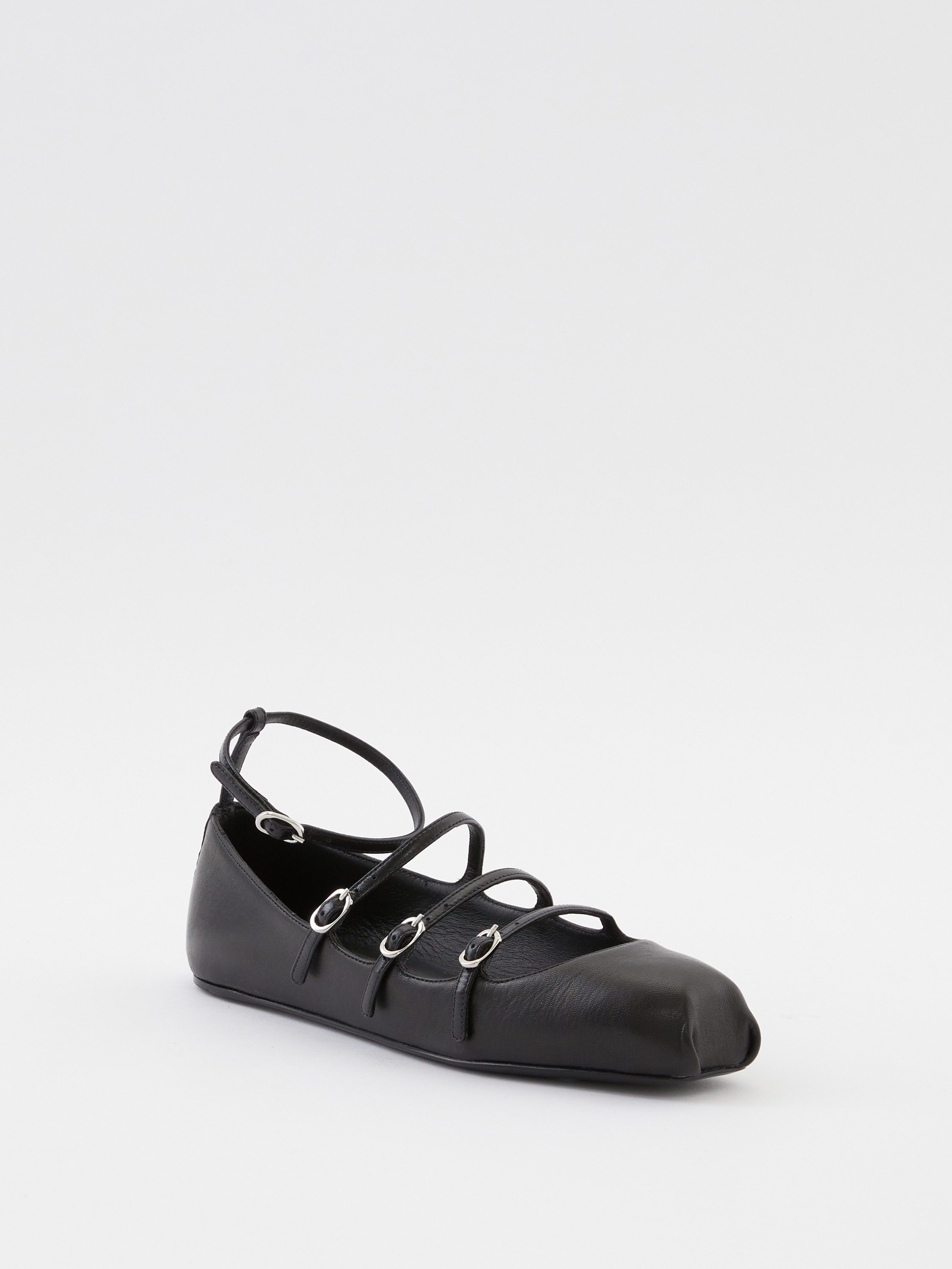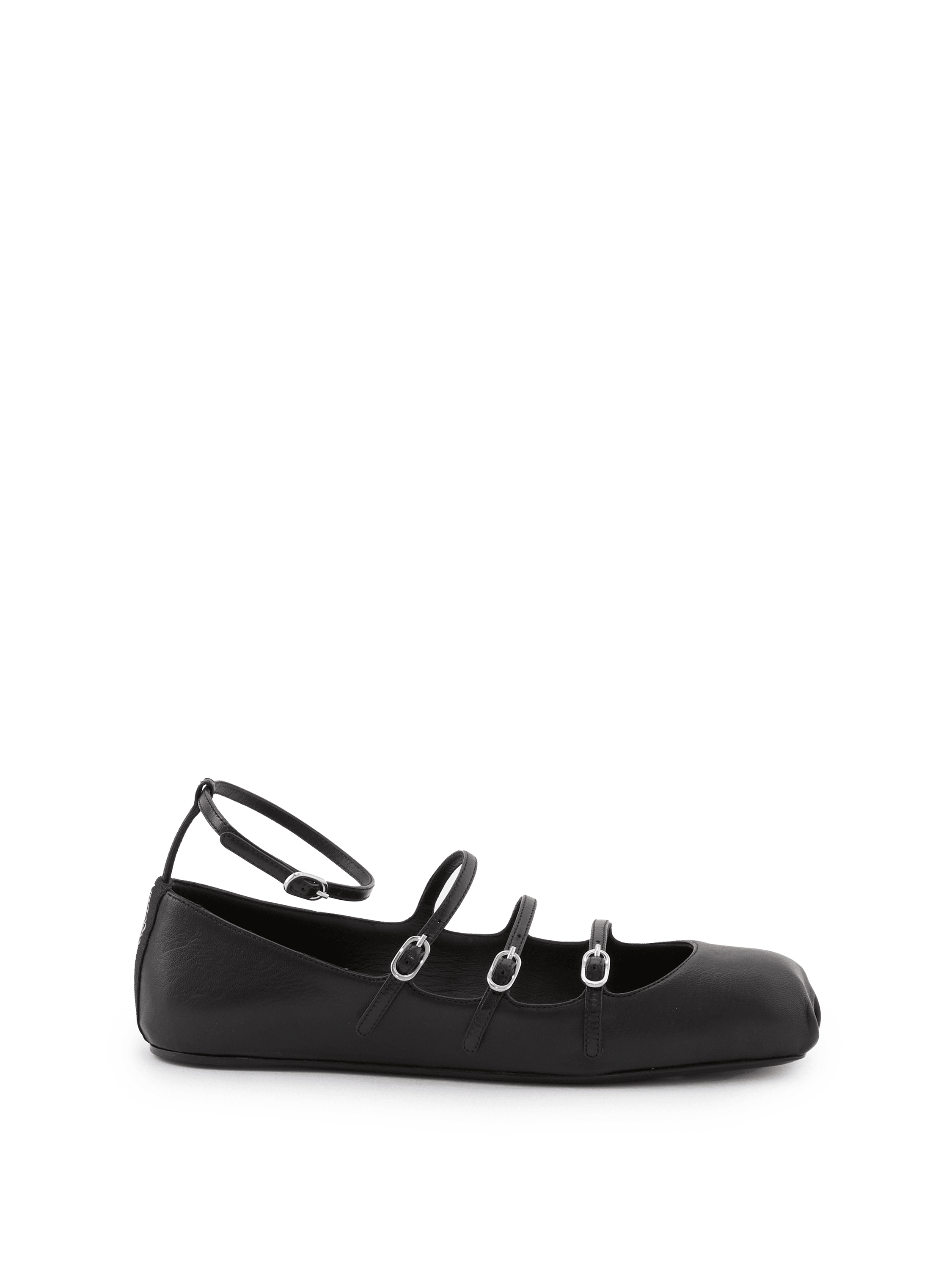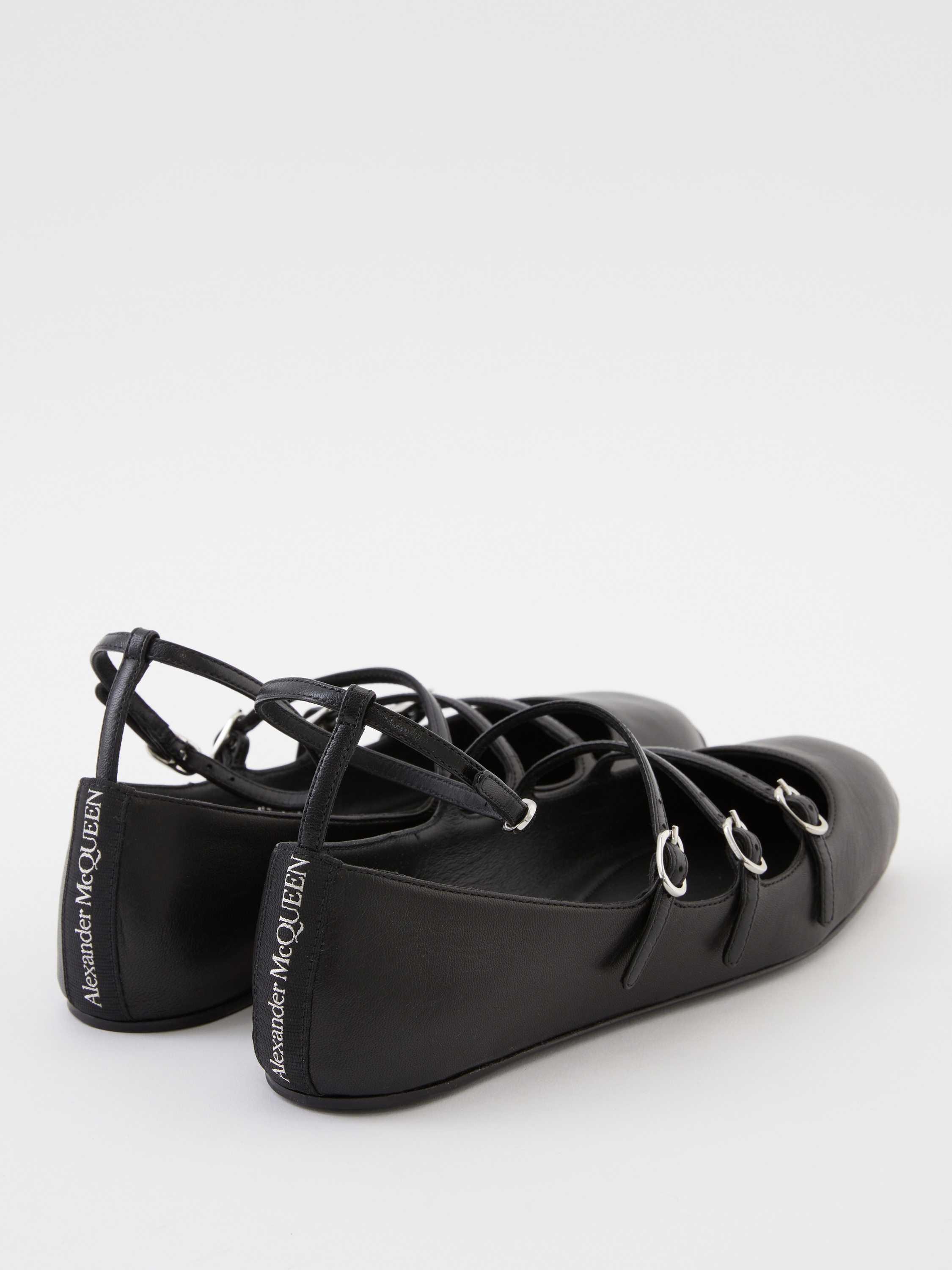Diese Ballerinas in Schwarz von Alexander McQueen wurden aus Leder gefertigt und bestechen durch die silberfarbene Metalldetails. Die Zehenpartie in abgerundeter Karree-Form, die schmalen Riemen mit Dornschließe und das glänzende Finish zeichnen dieses moderne Design aus.
