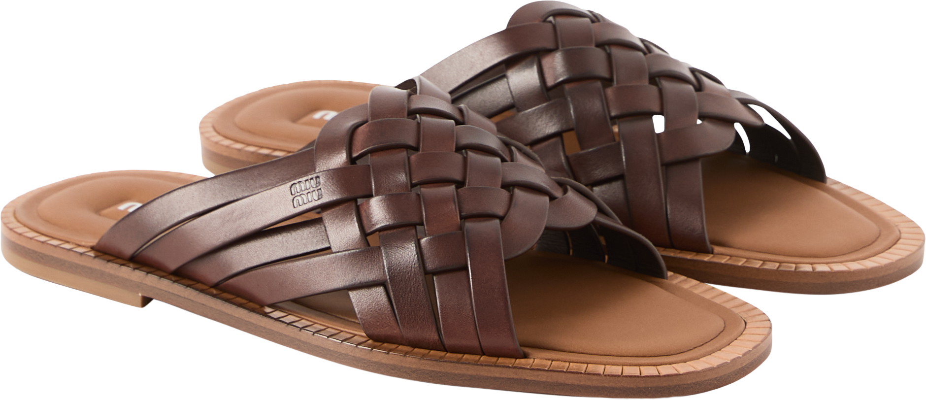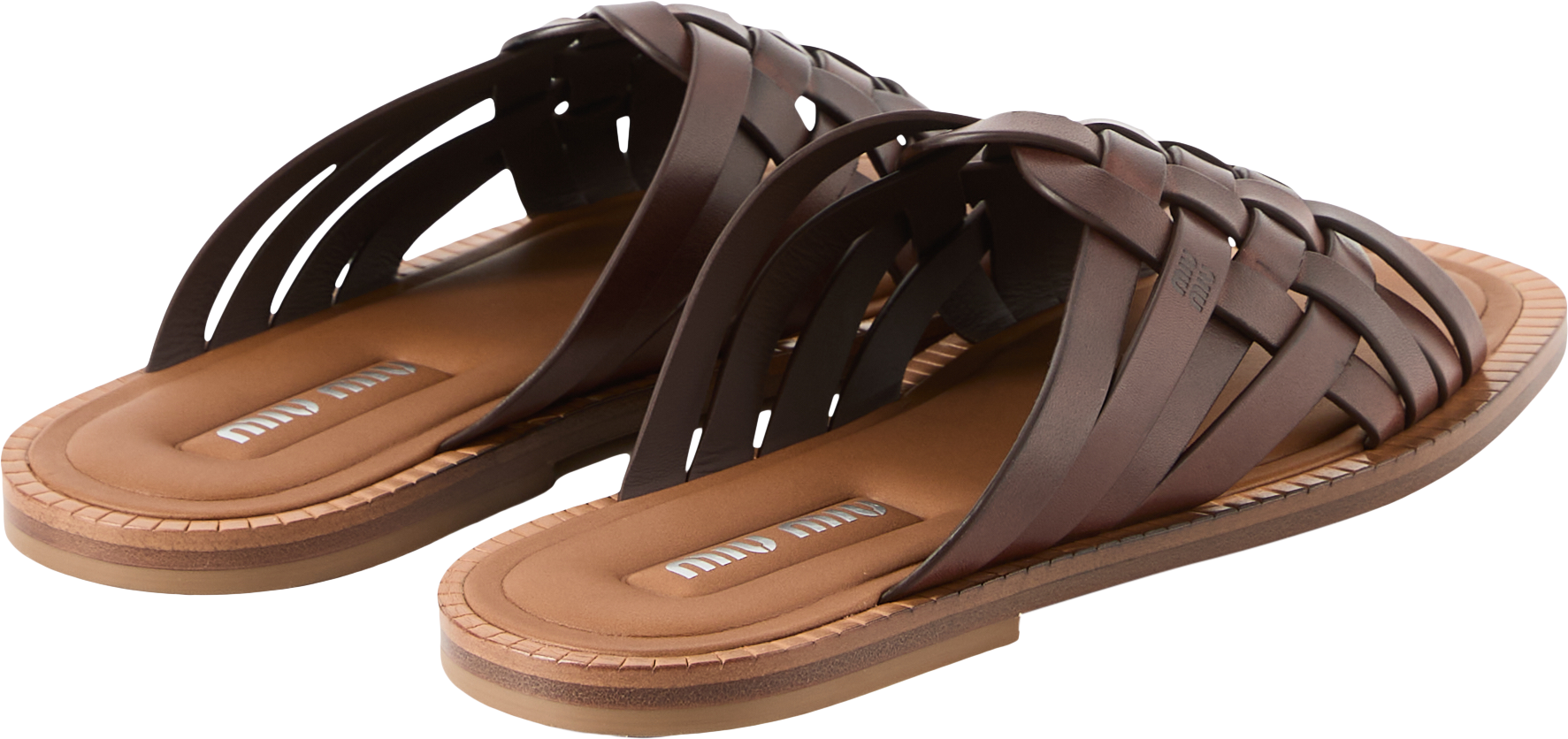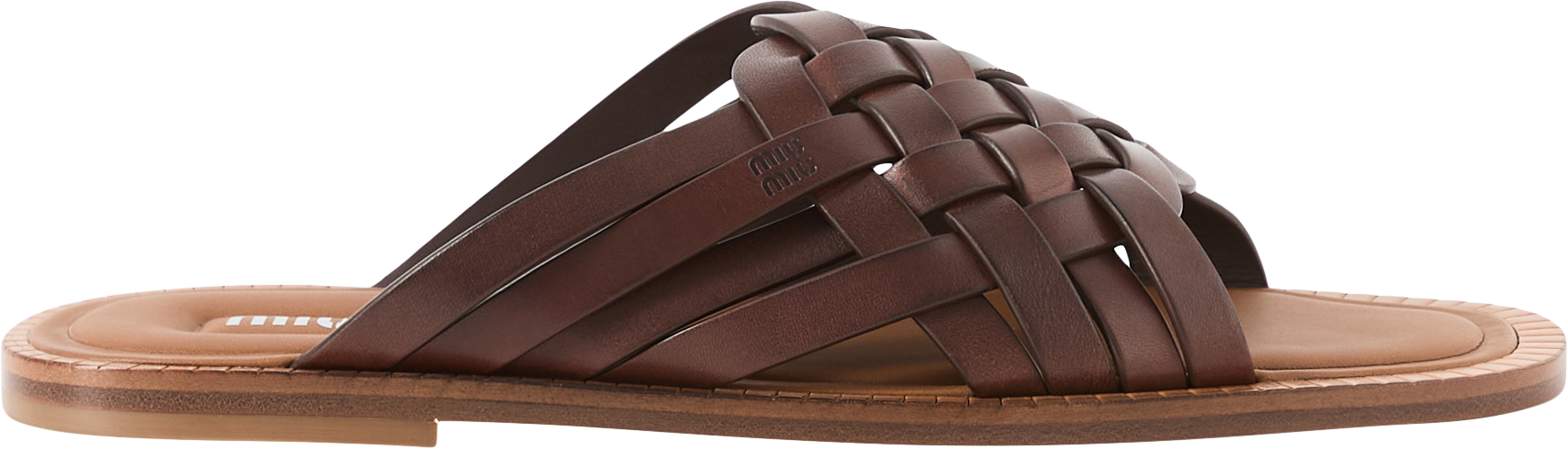 Diese Sandalen in Braun von miu miu wurden aus gewachstem Kalbsleder gefertigt und bestechen durch die edlen, geflochtenen Bänder. Die flache Sohle sowie das Siebdruck-Logo auf der Monoblock-Innensohle runden das elegante Design ab.